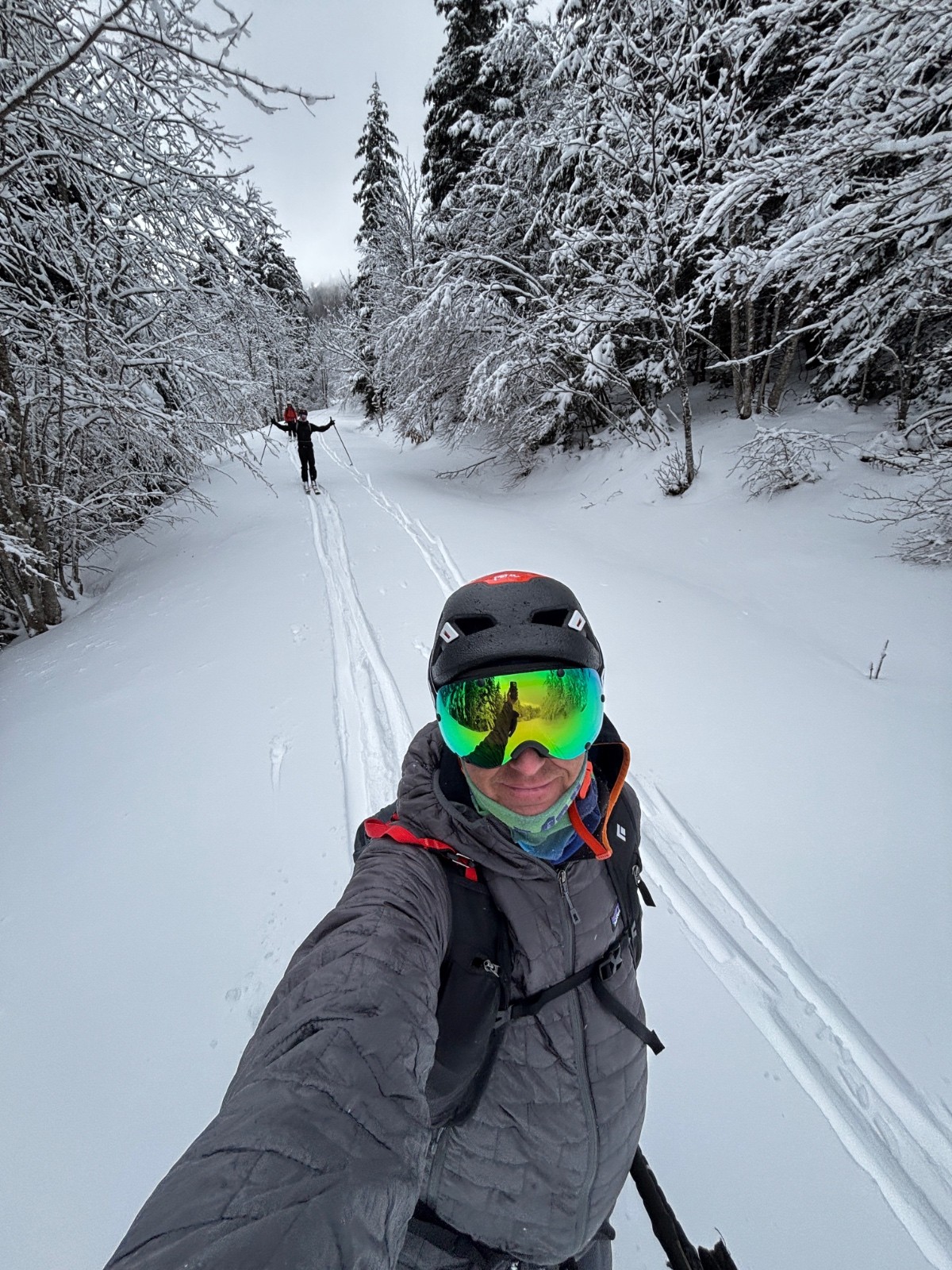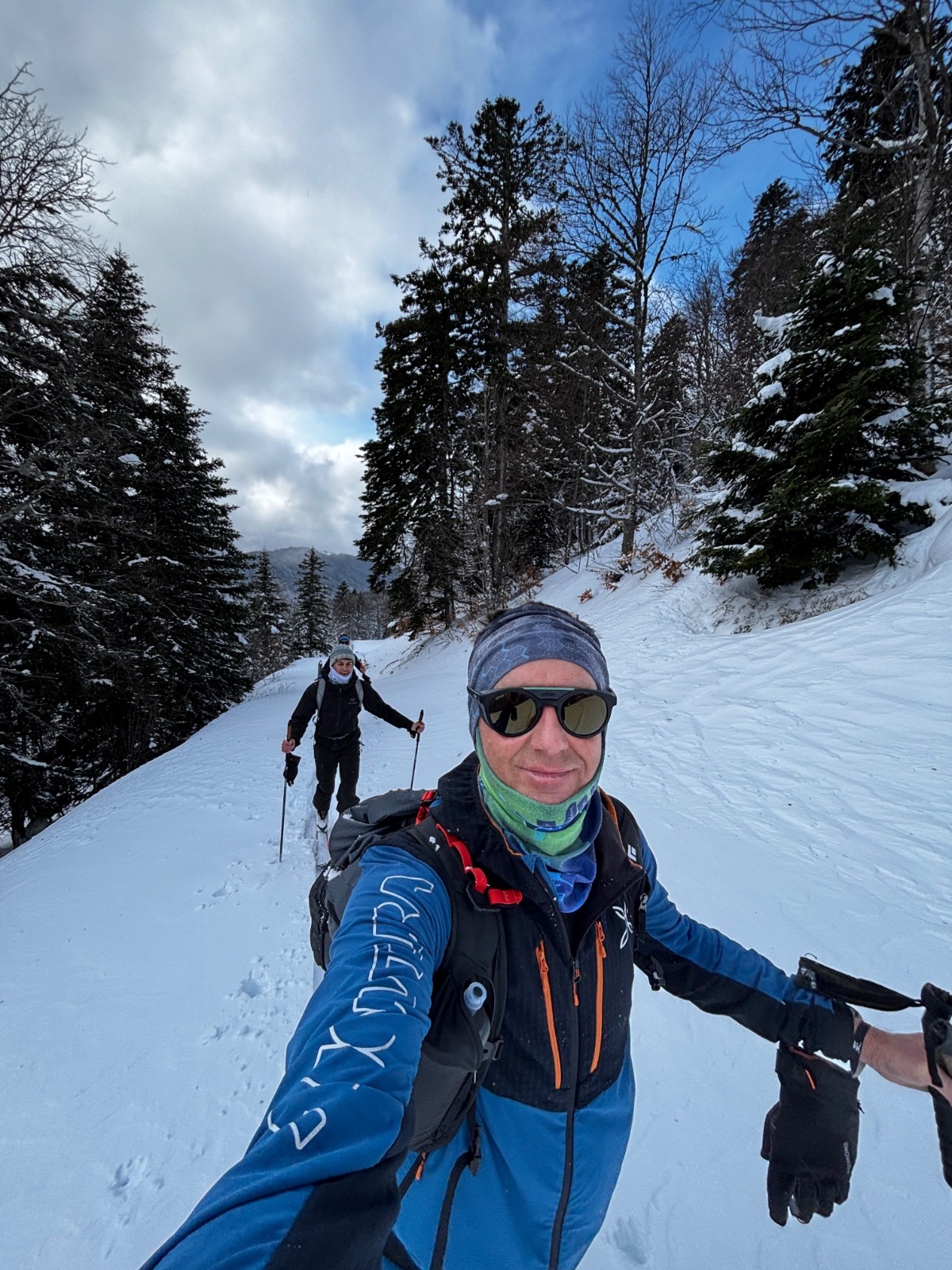 La forêt depuis Prélefrey est un peu en chantier: peu de neige, pas mal d'arbres et de branches, il a fallu louvoyer pour atteindre le parking des Bourdeaux, où ça s'arrange. On suit ensuite une trace de montée d'une équipe qui nous précède, qui prend la route forestière pour les 2 lacets au dessus, puis droit dans la forêt, où la neige se fait plus épaisse.