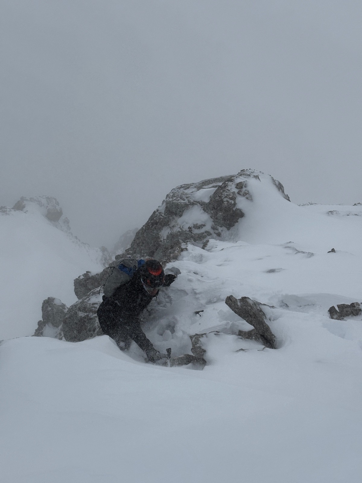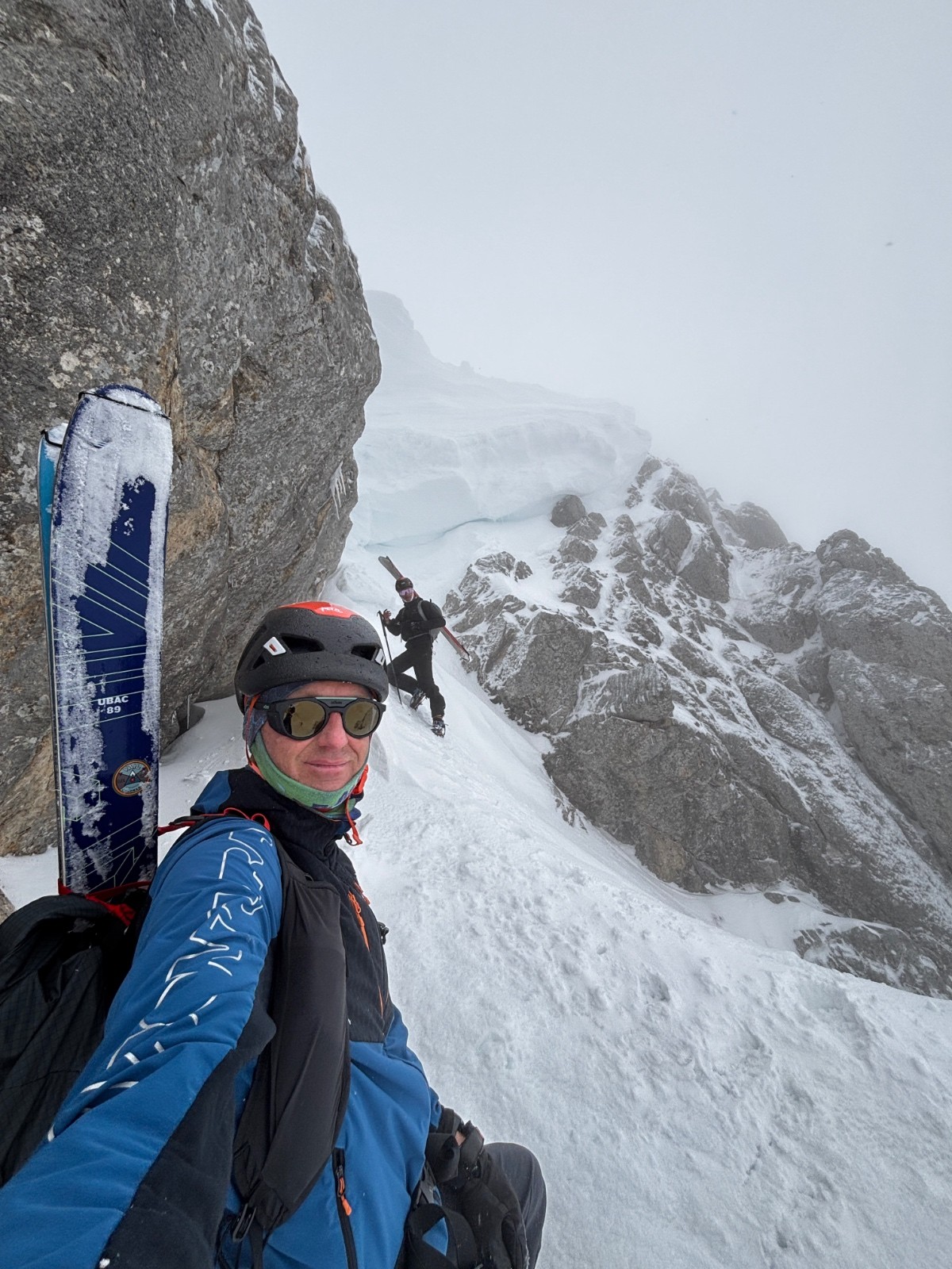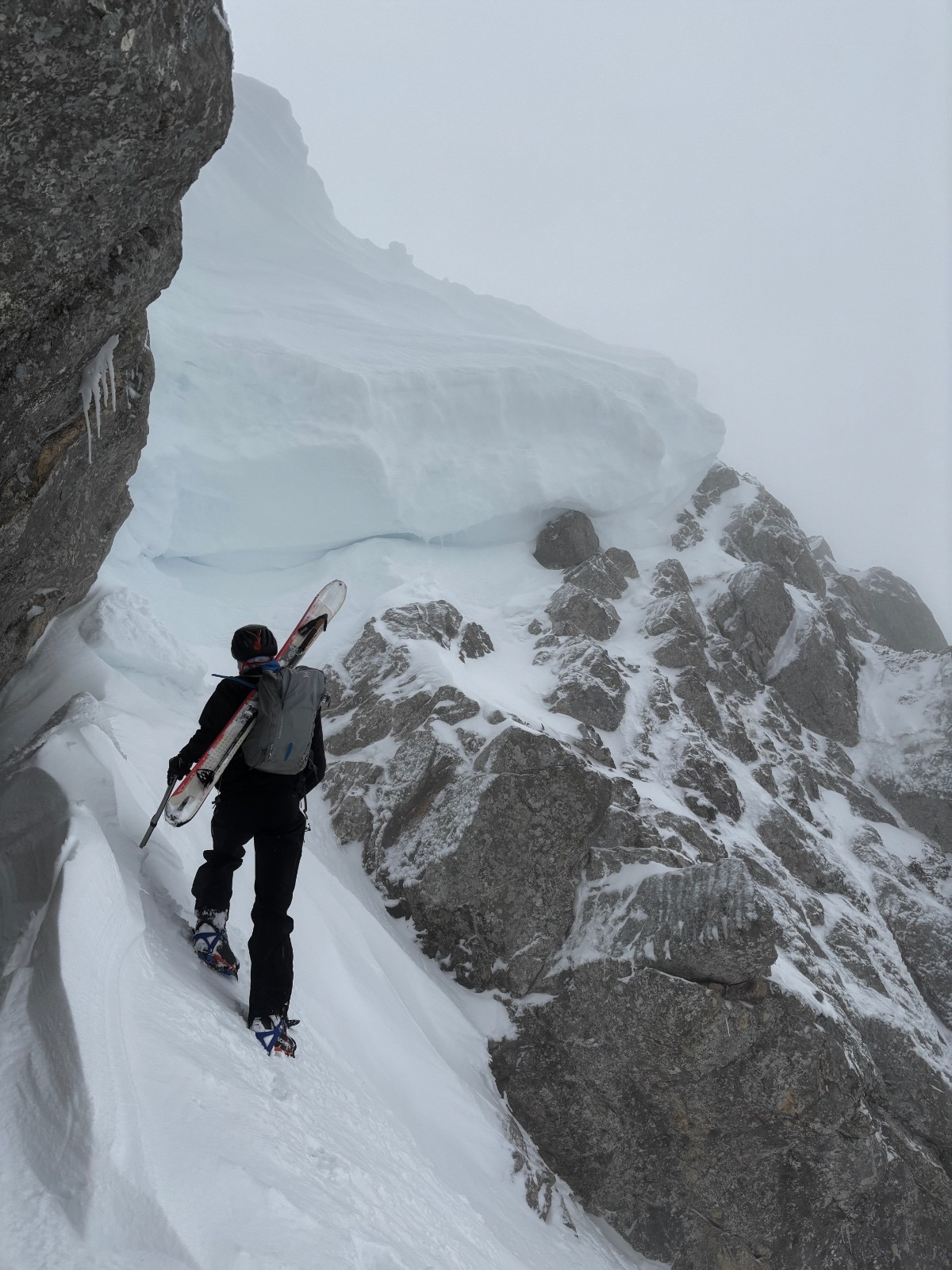 La corniche est monstrueuse, c'est du jamais vu. Nous l'avons contournée par la gauche et les rochers mixtes qui aboutissent au Pas de l'Oeil - quelques pas de mixte récompensés par une visibilité nulle!