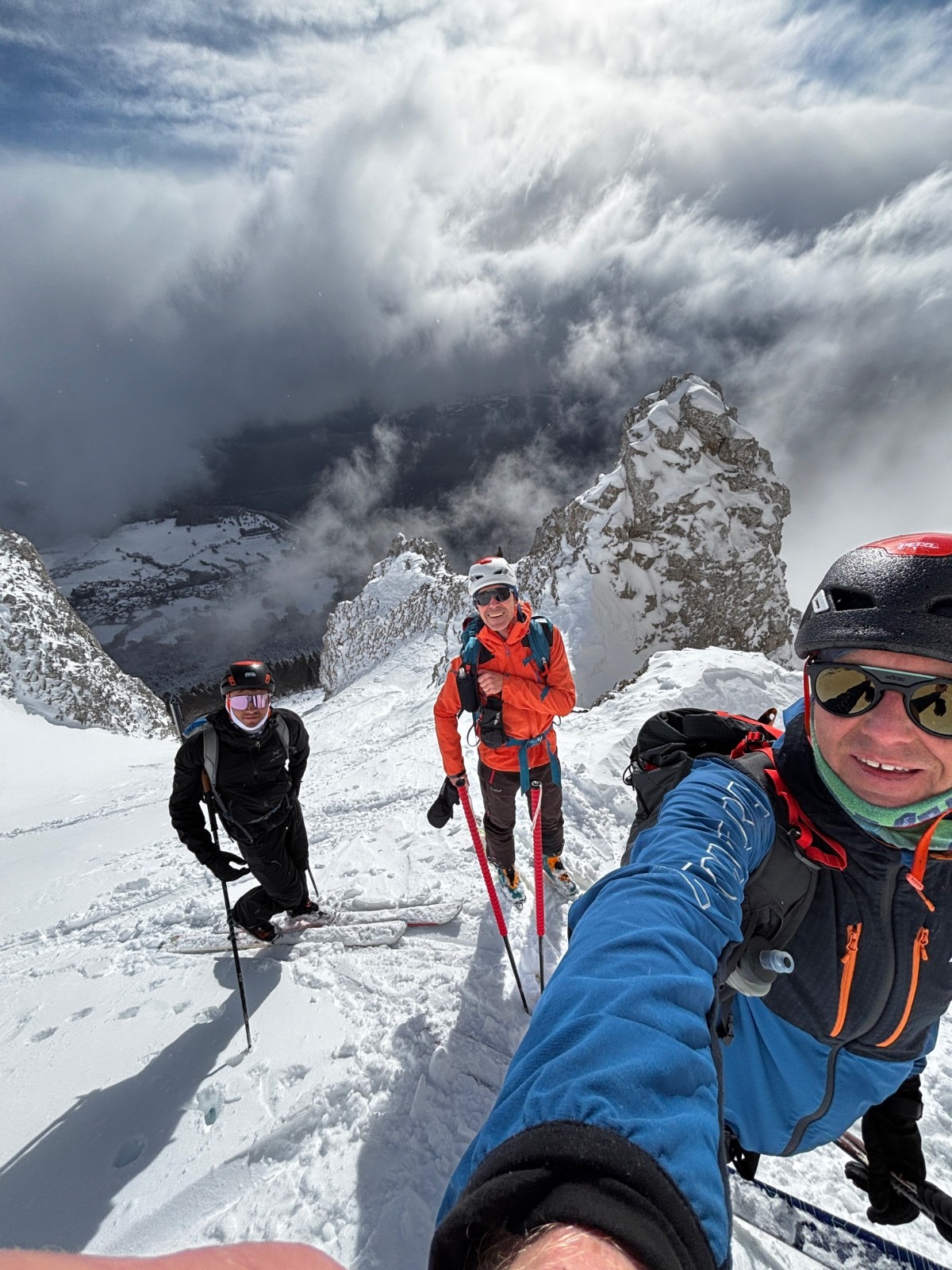 On rattrappe l'équipe à l'entrée du couloir, ce sont 3 chasseurs alpins de la vallée, et ils se posent beaucoup de questions également, et ça tergiverse. On leur passe devant, ouvrant la marche finalement sans trop d'états d'âme - ça paraît plutôt sain, même si ça plaque un peu sur 5cm - rien d'alarmant. Déchaussage à mi-couloir environ, et en suivant les plaques plus dures en rive D, c'est plutôt efficace jusqu'en haut.