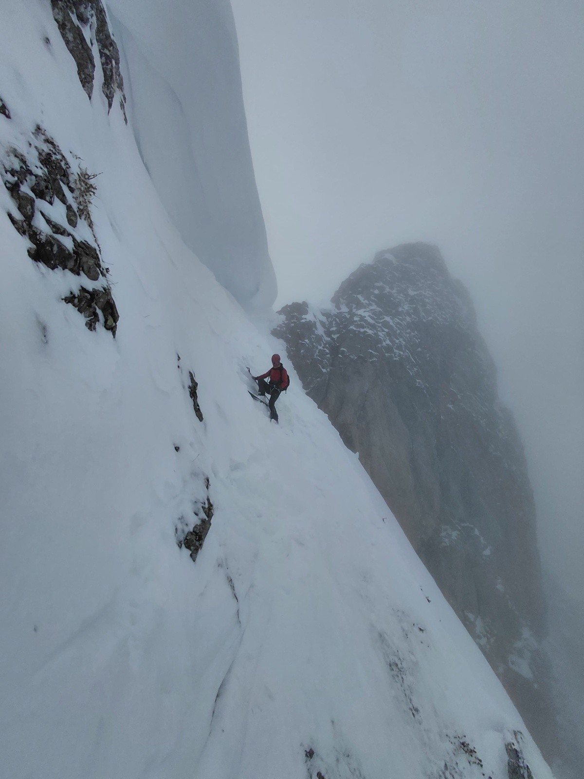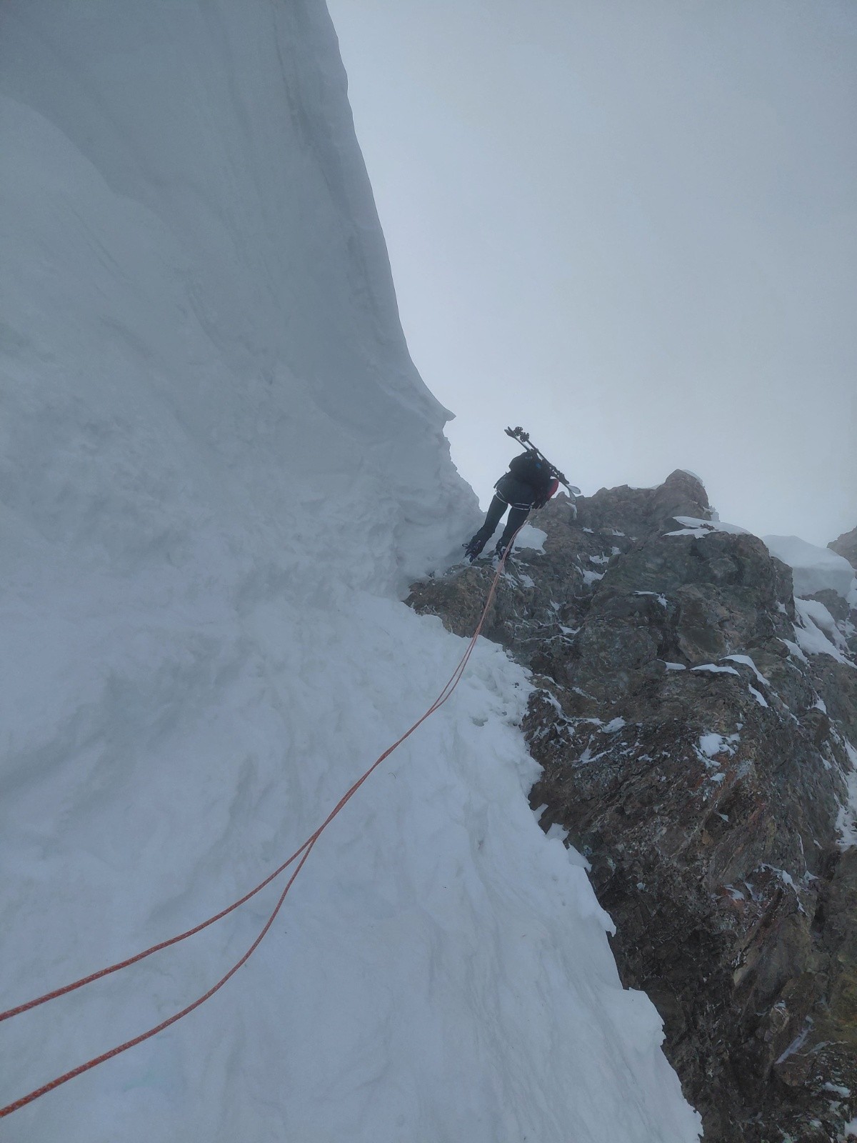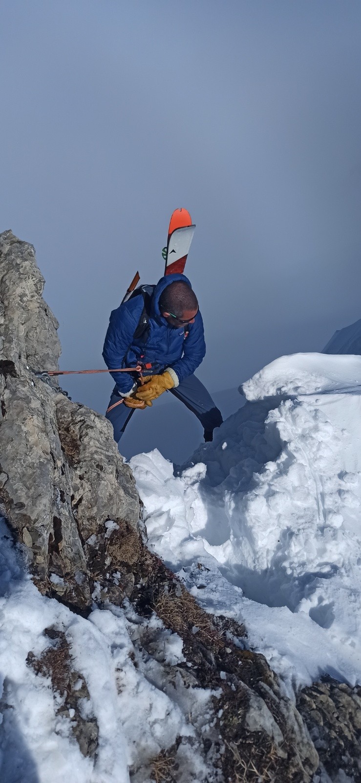 Rappel Ok avec 2*15 m, corniche imposante, plaque sous la corniche purgée avec la corde (purge du reste du couloir en mm temps). Reste ras dans une neige bien lourde et une visi bien maigre.... Ça doit être beau..avec de la vue!