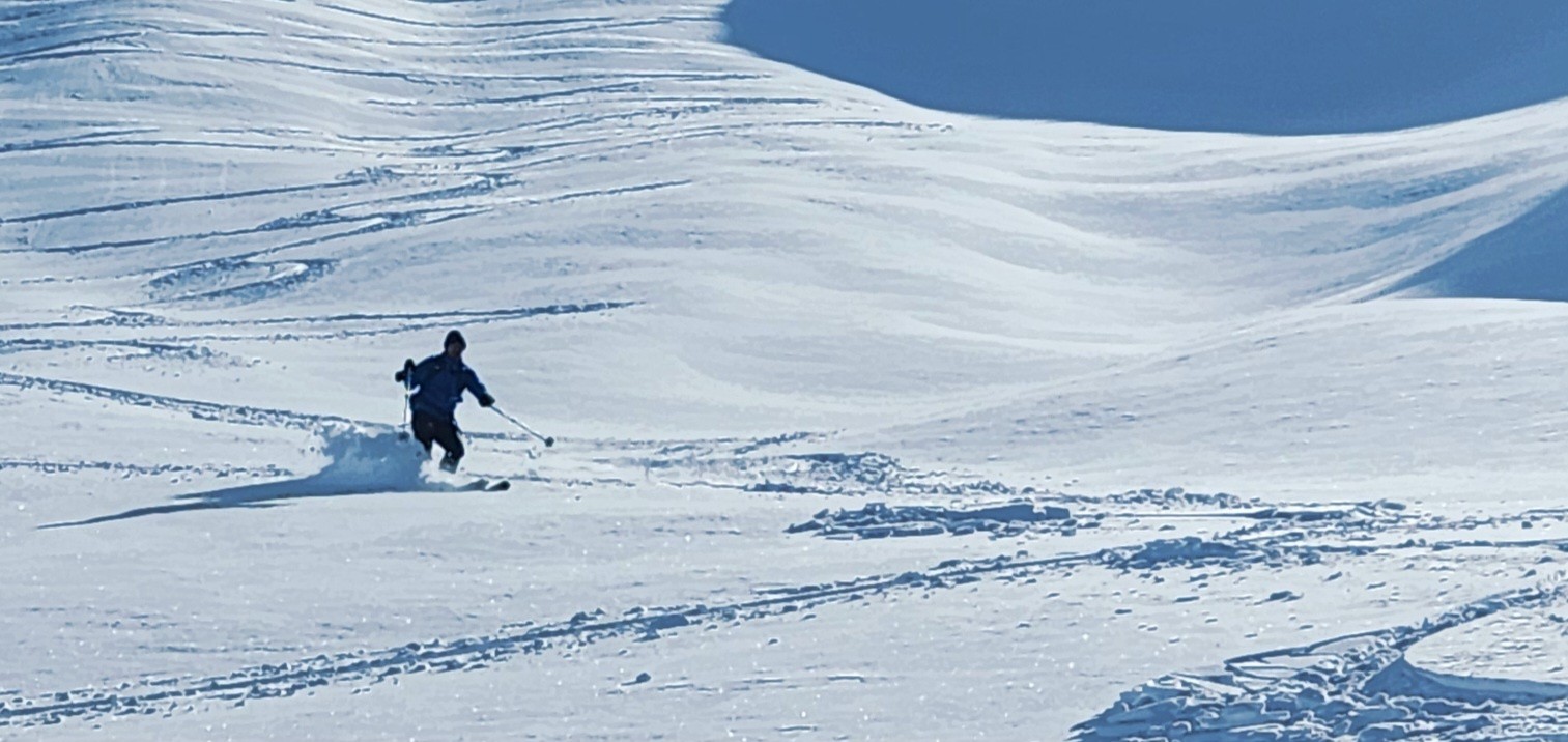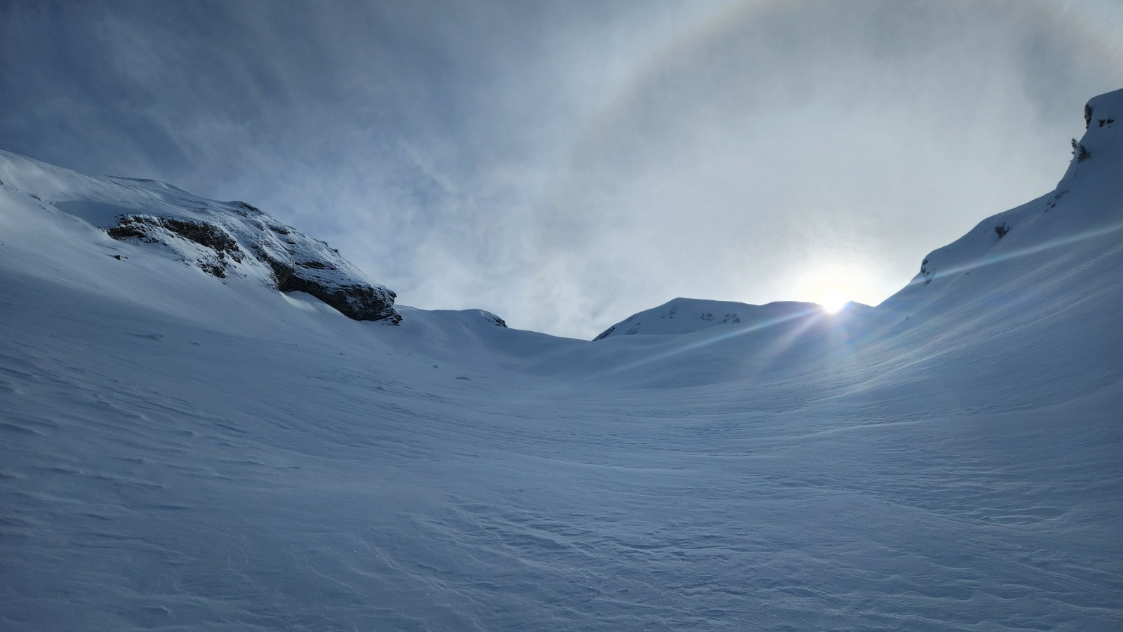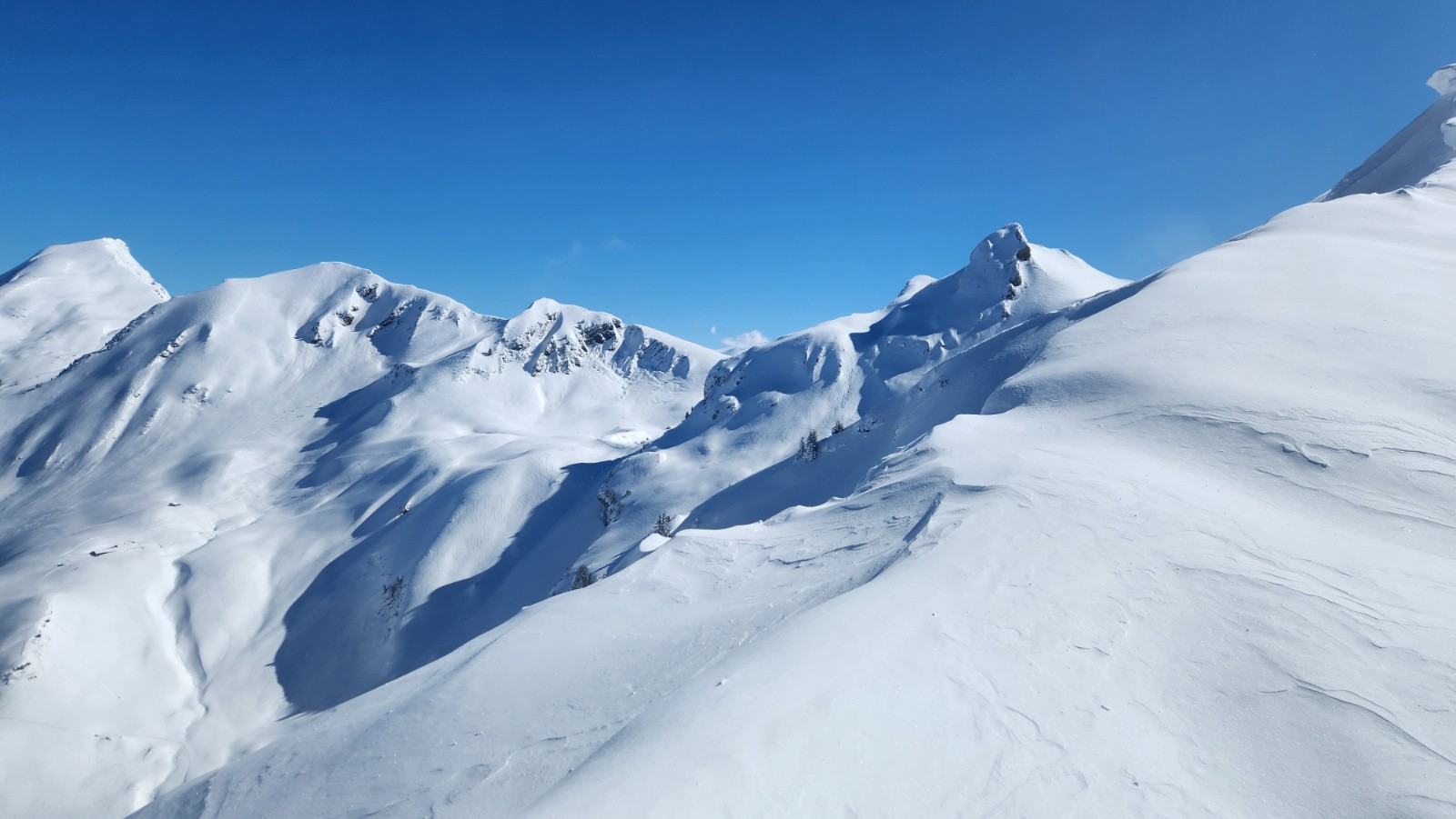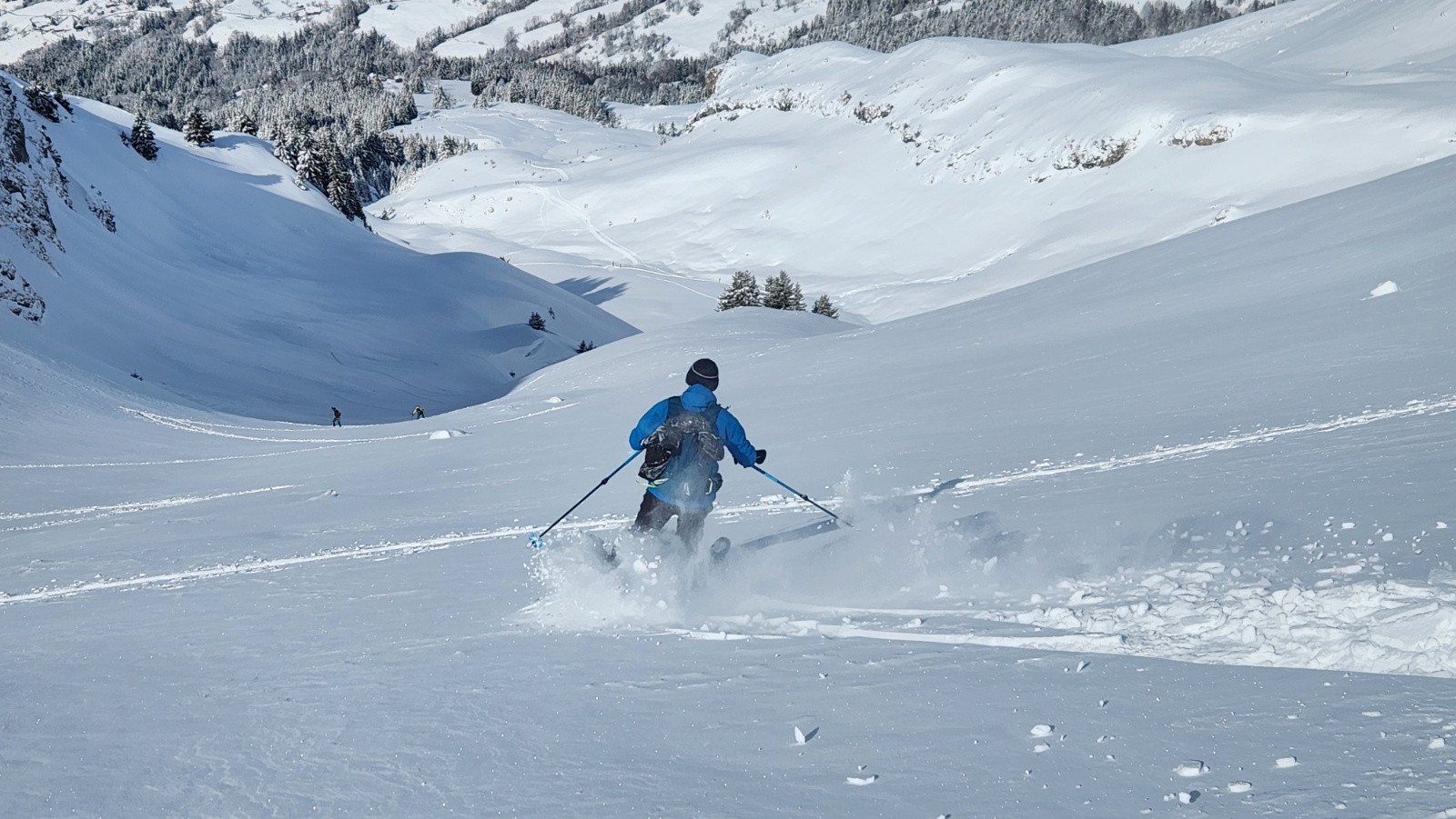 Conditions pour le ski : Bonne poudre, très légèrement durcie en surface à quelques endroits mais globalement excellent. Sur le dernier champ, on sent un peu les vieilles traces mais ça reste bon.