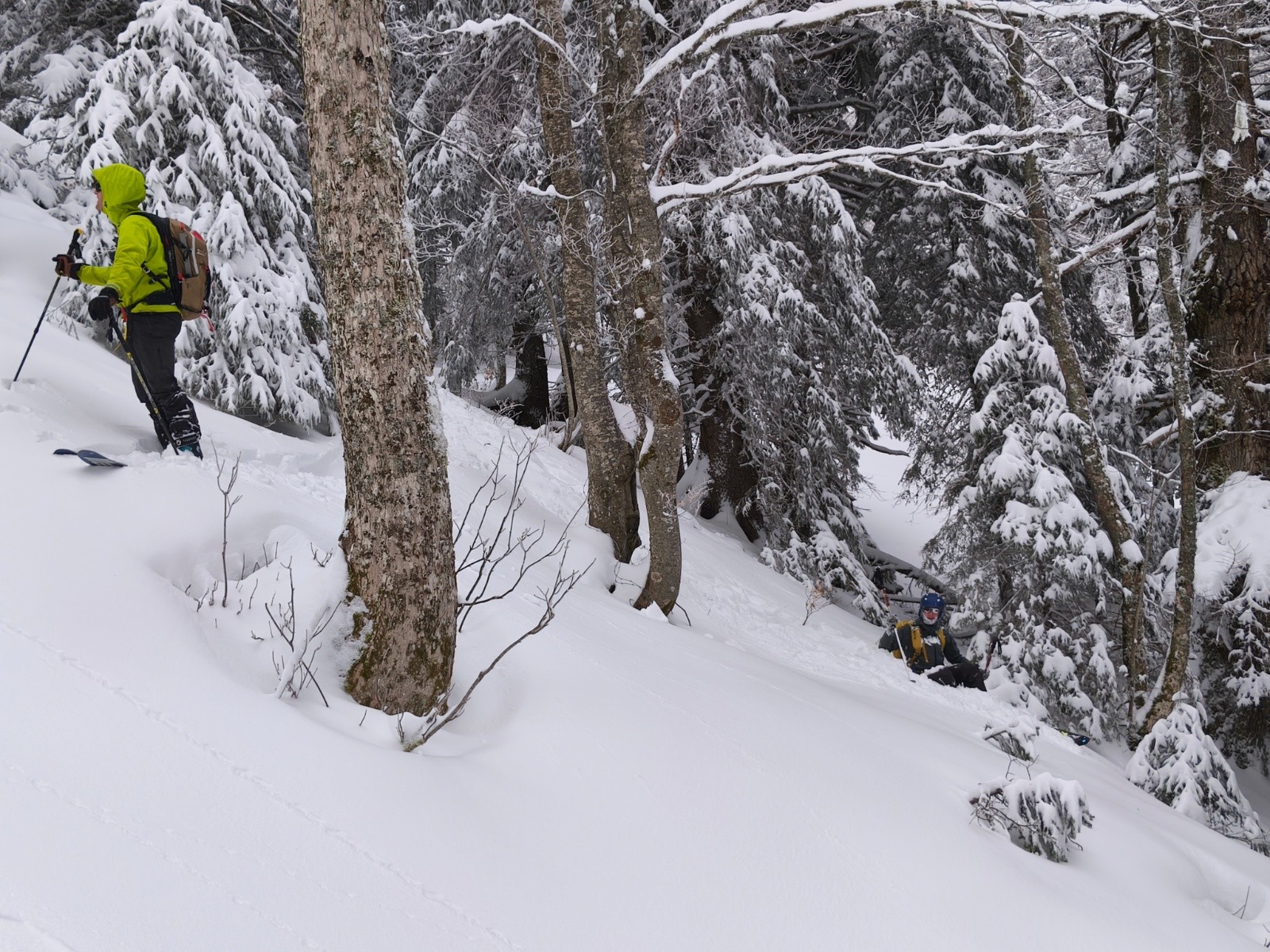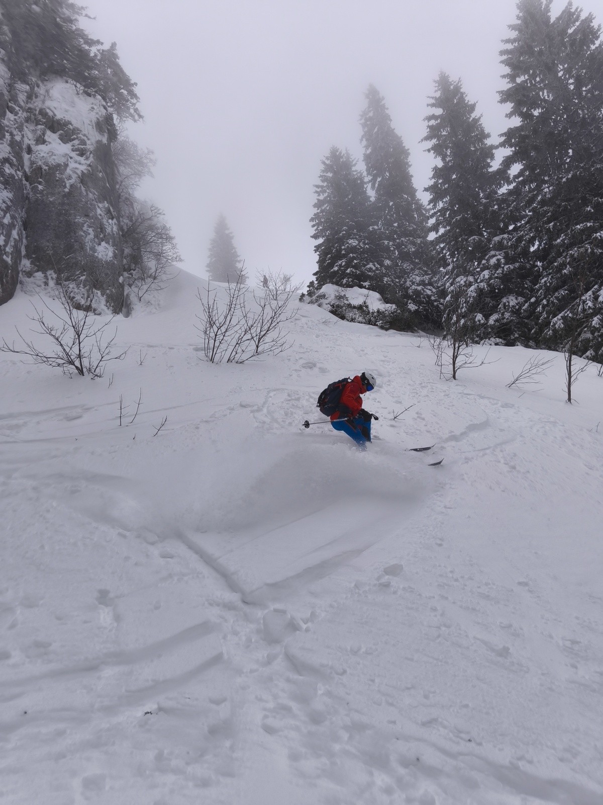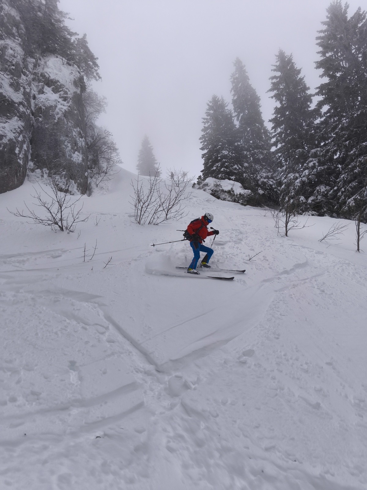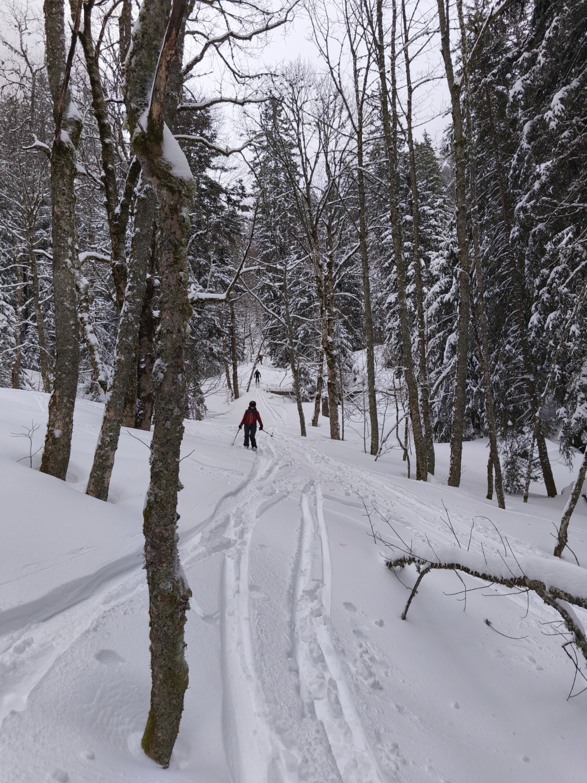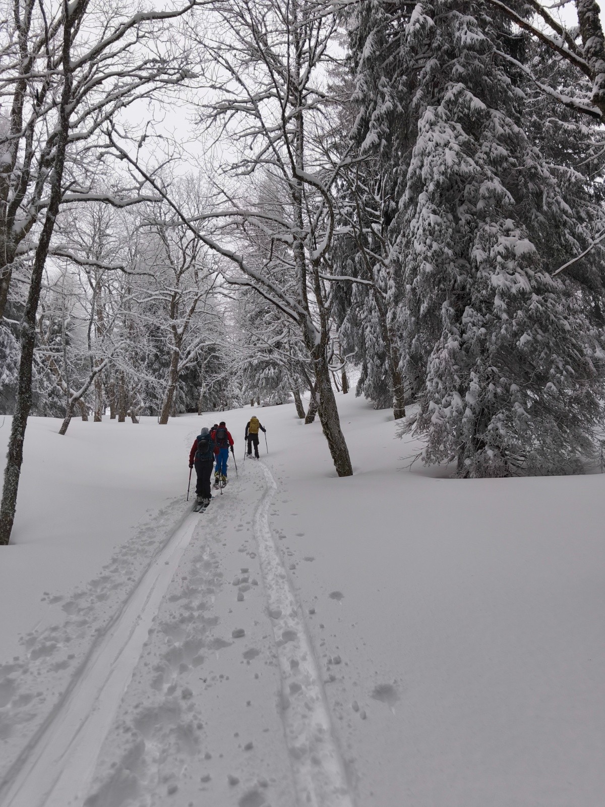 Ski en forêt bien agréable dans une bonne poudreuse, sentier de traverse bien enneigé ce jour.