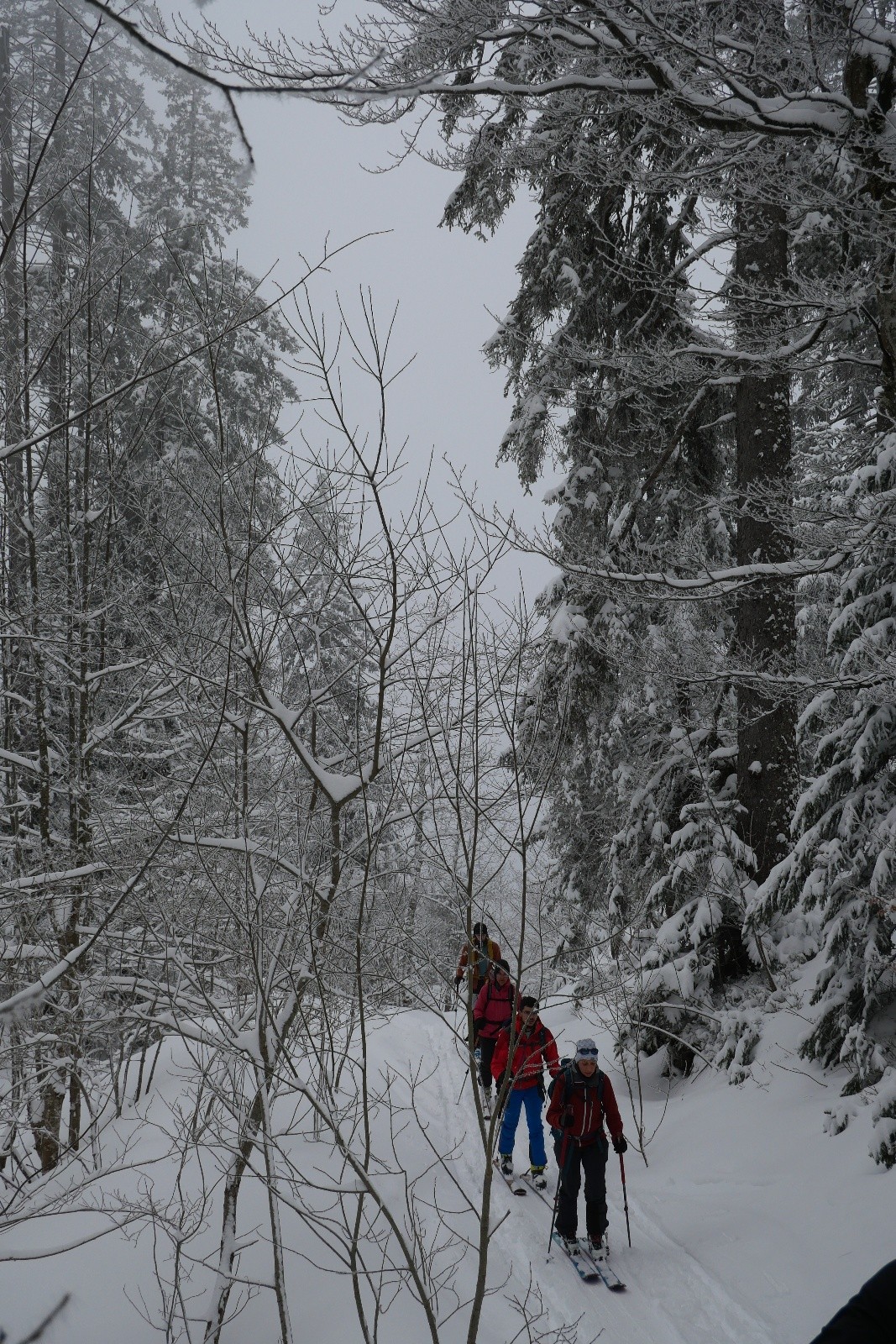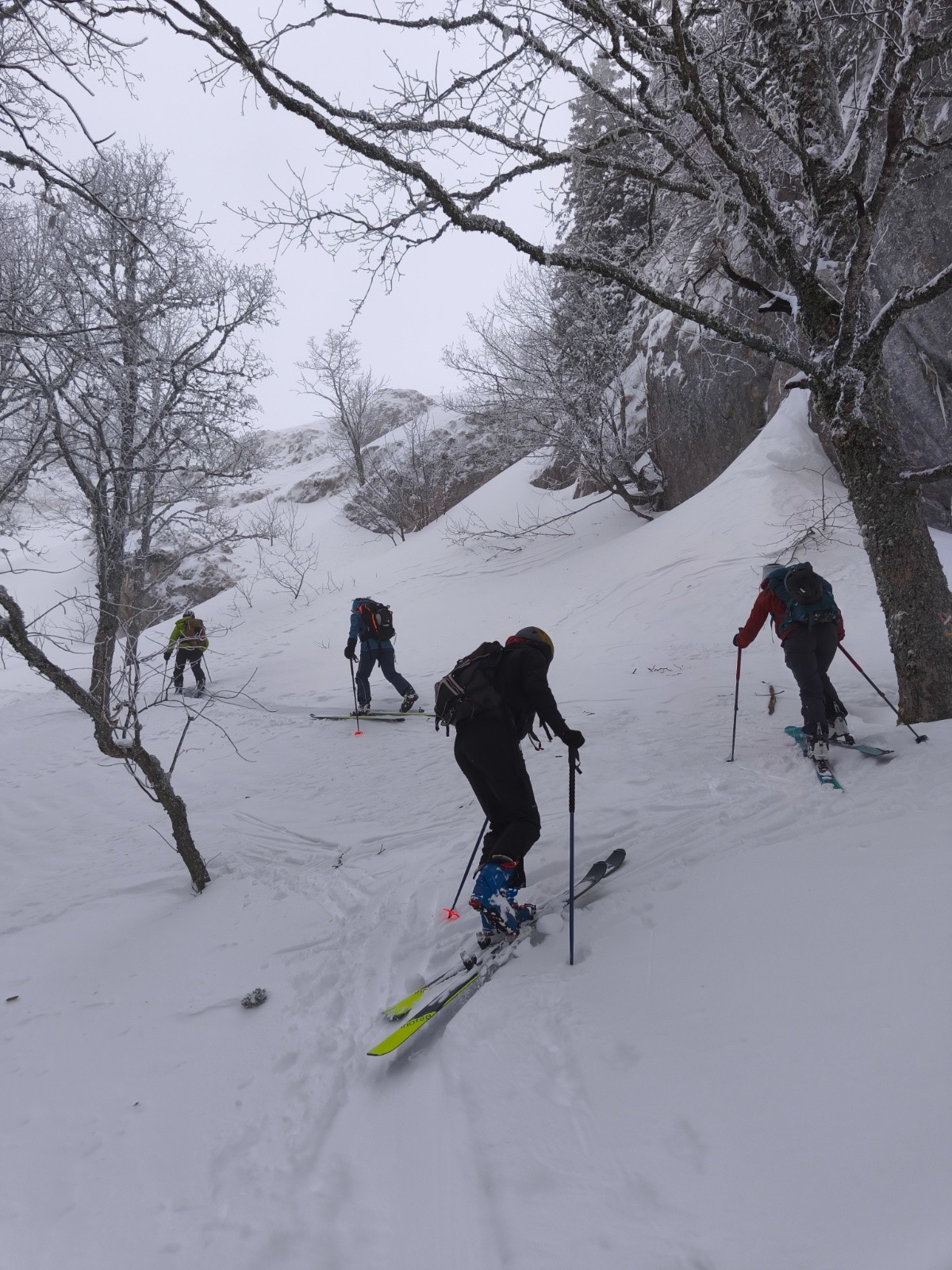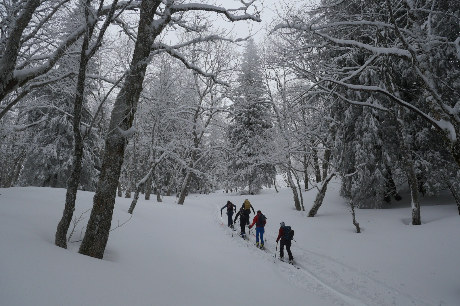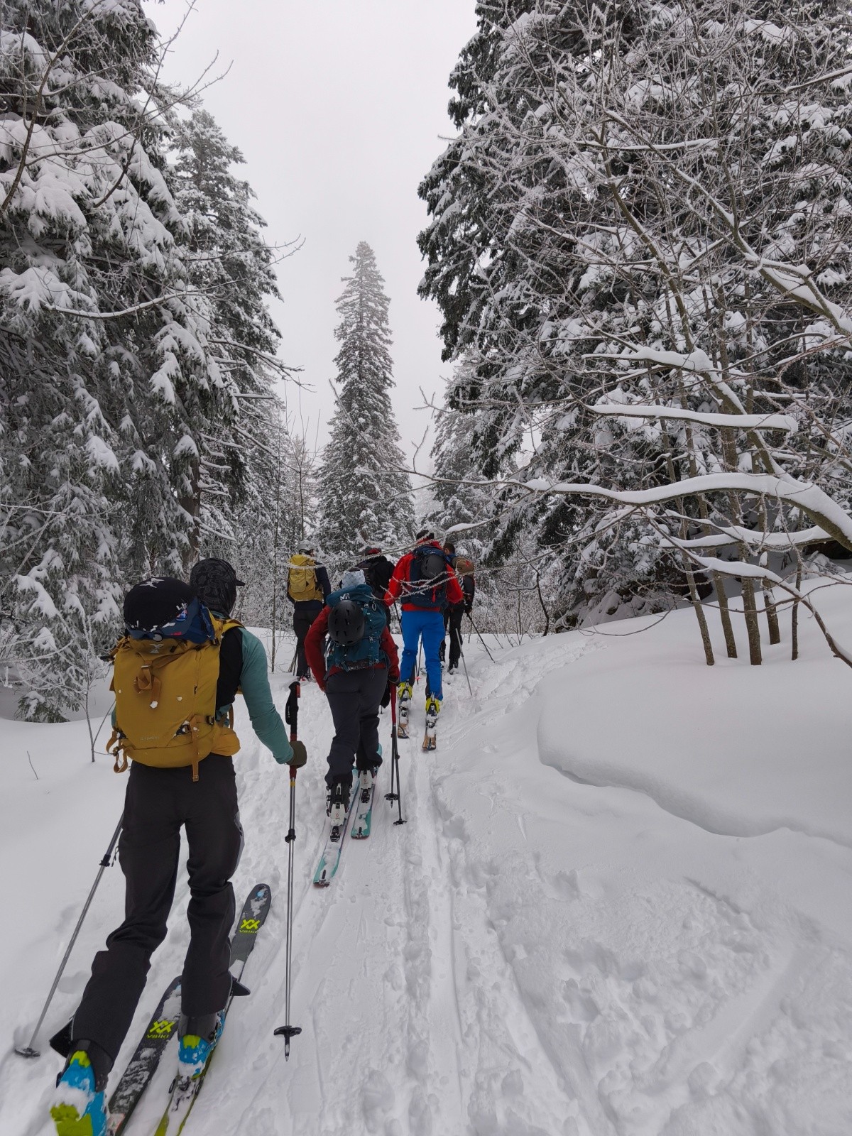 La neige sera bien là, douce et agréable à skier en forêt mais le brouillard et le manque de visibilité nous incitera à faire du tricotage entre 1300 et 1700 m pour en profiter un peu plus en forêt. Picnic au habert de Bovinant. Un habert eat, comme on dit dans le coin.