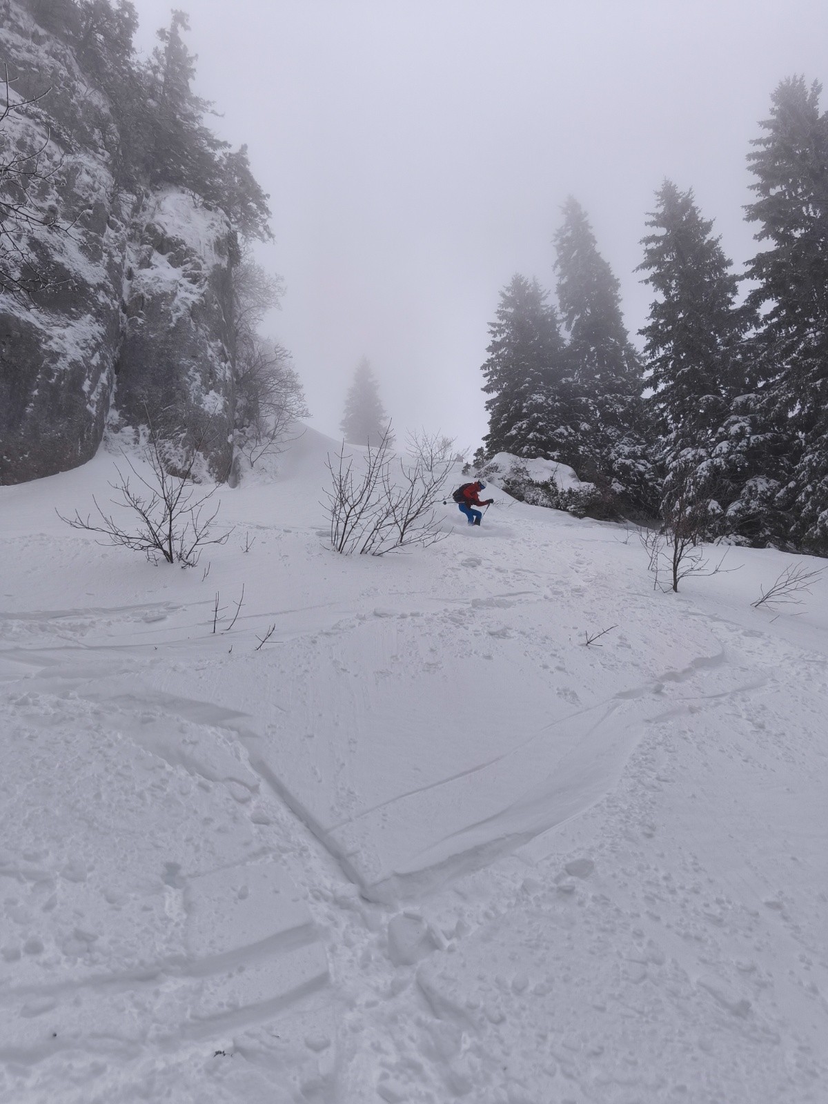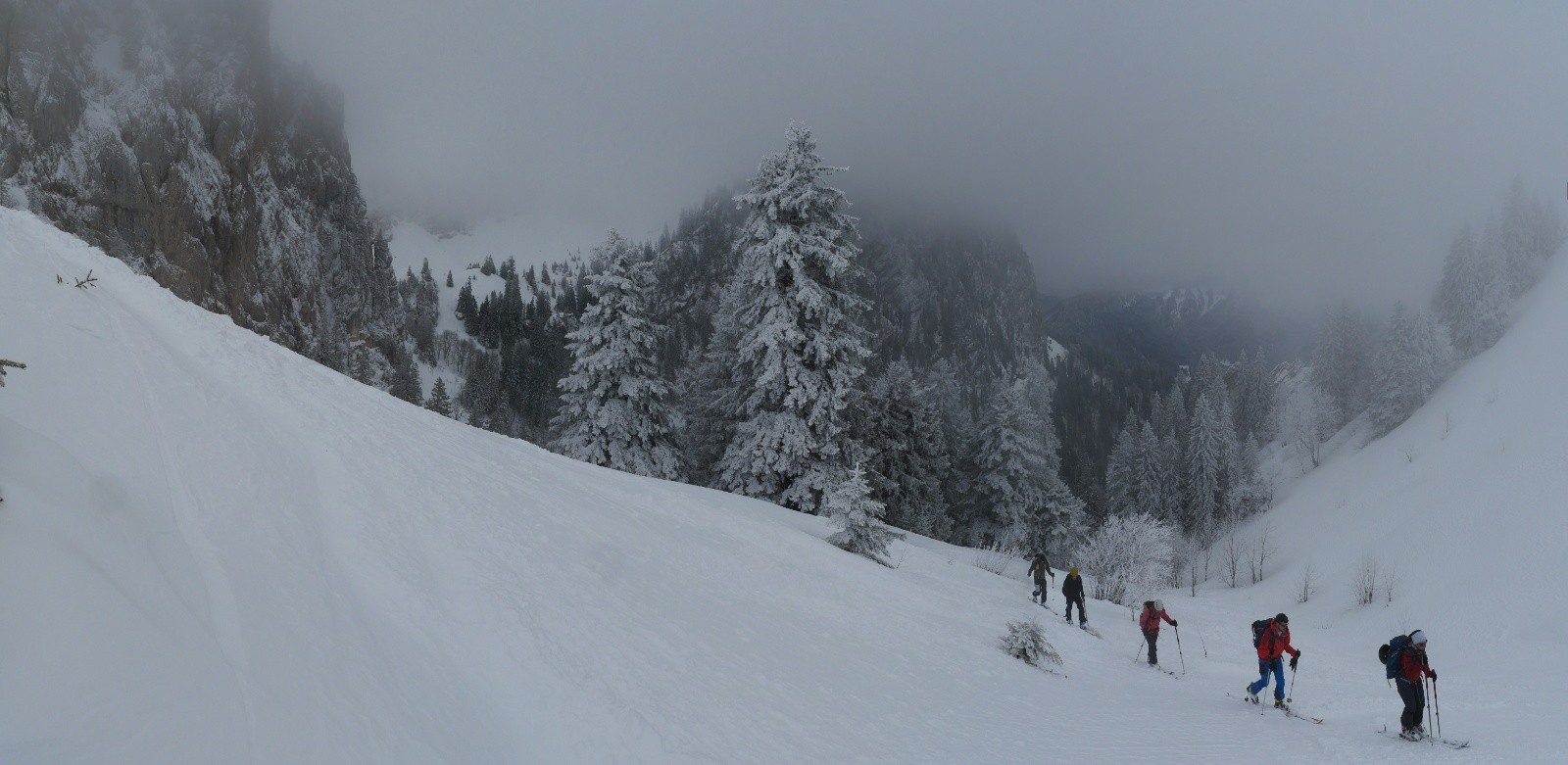 Conditions pour le ski : 10 cm de neige fraîche au départ s'épaississant pour donner une bonne vingtaine plus haut. Couteaux appréciables sur les 50 derniers mètres pour arriver au col de Leschaux où ça a bien soufflé.