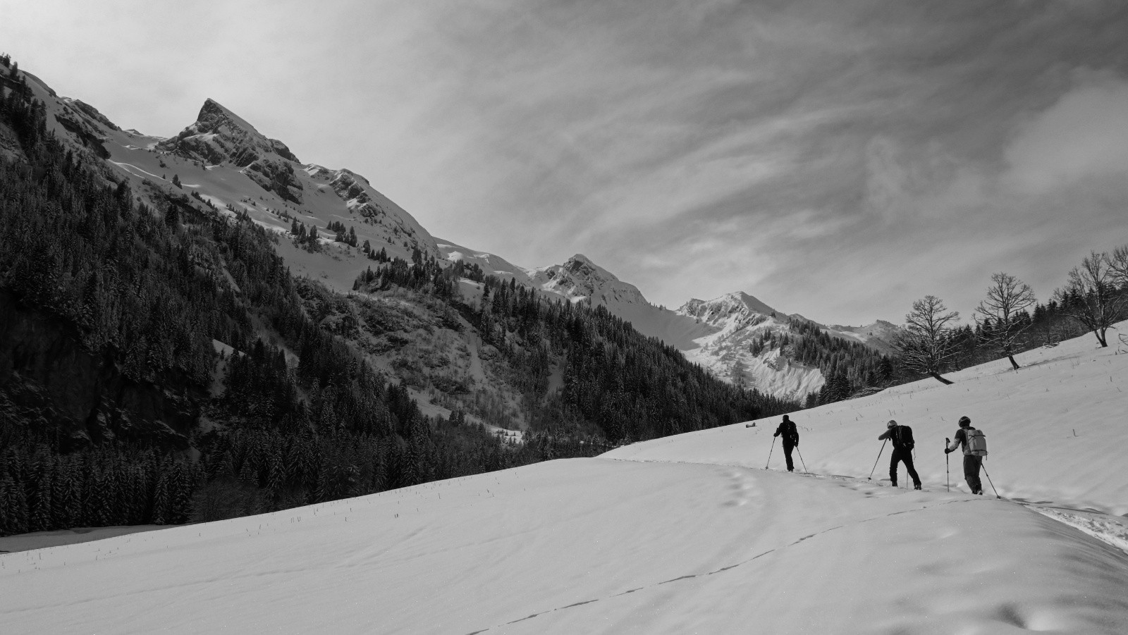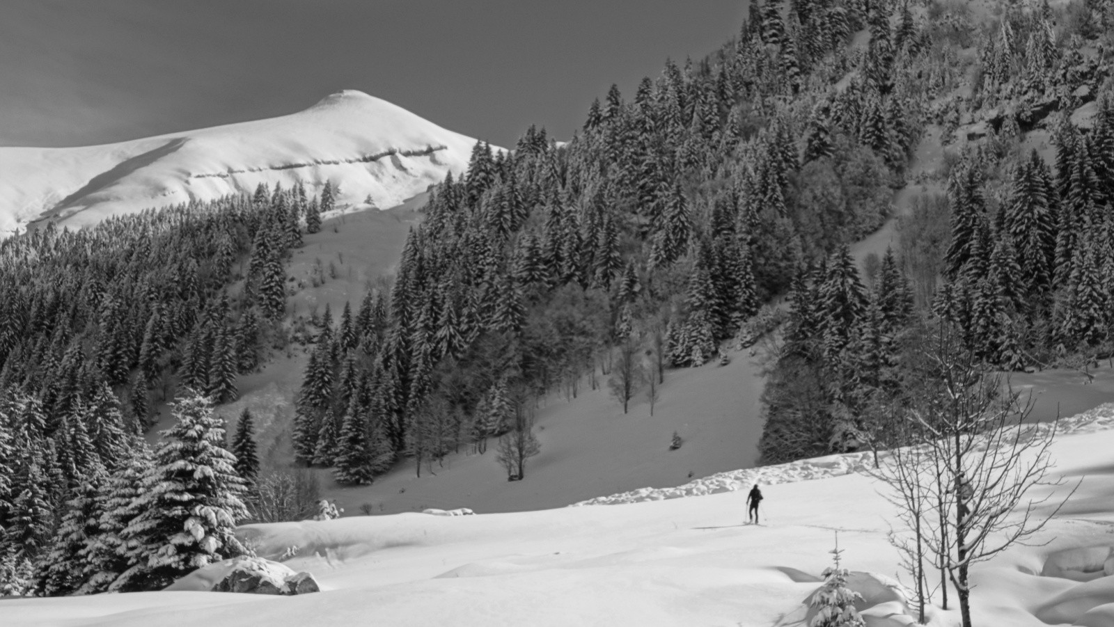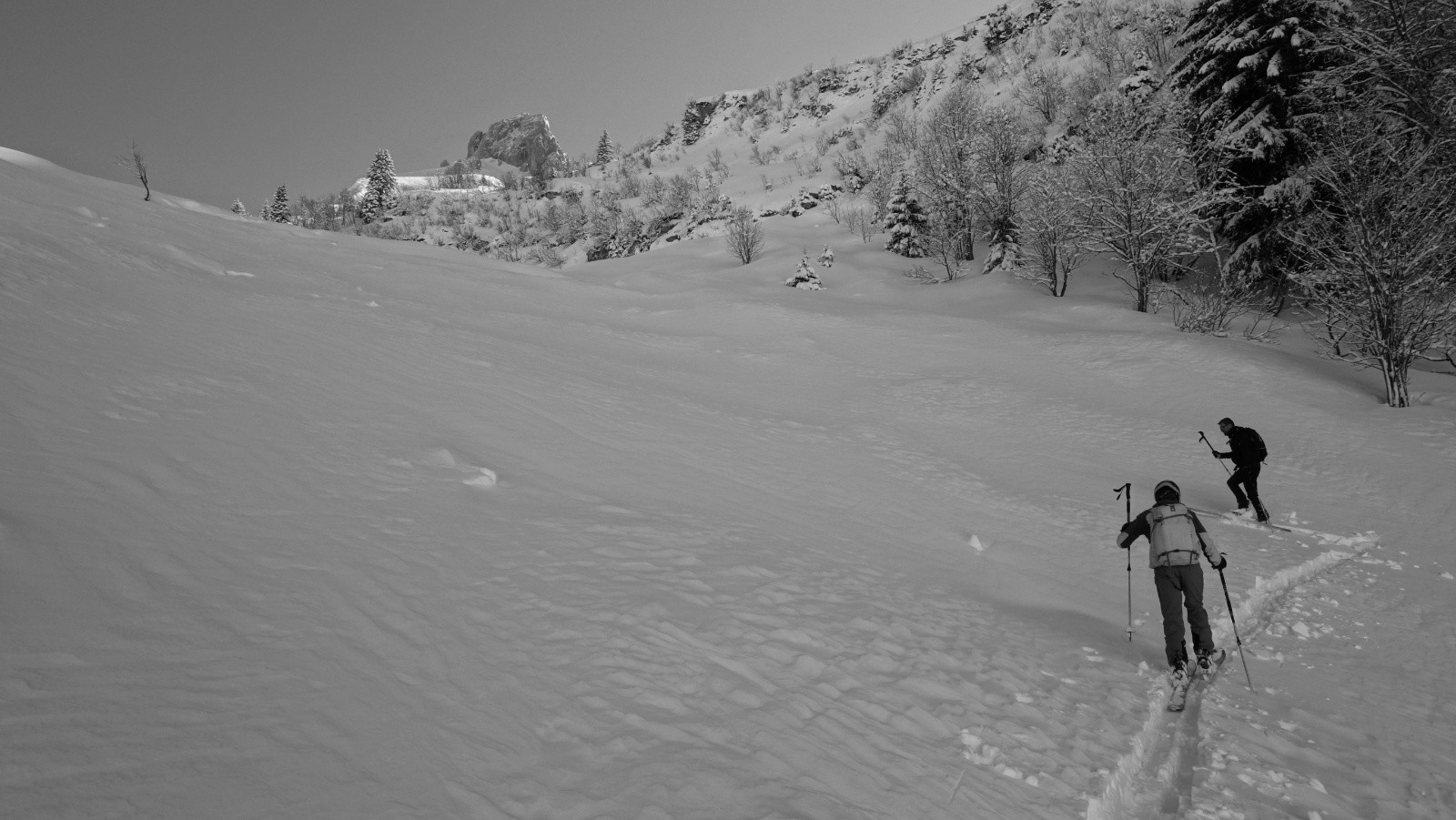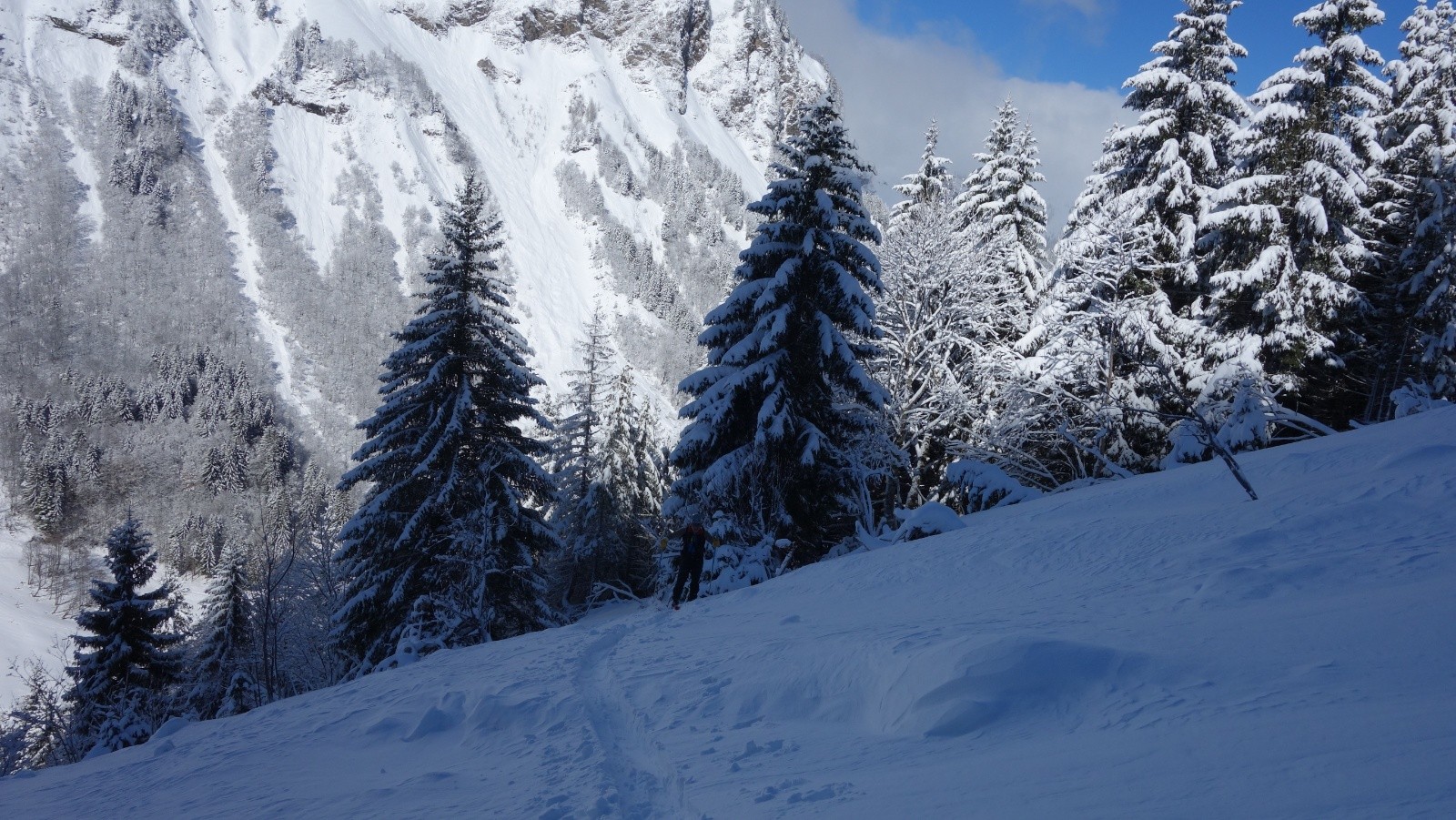 Conditions pour le ski : Une fois passé le chemin à pied on chausse un peu avant le premier chalet. On passe à la trace dès que l'on franchit le ruisseau jusqu'au sommet dans 20 cm de fraiche puis vite 40 sans se rendre compte du brouillard qui nous suit en montant. La descente nous incite à la prudence et nous devons suivre nos traces de montées.