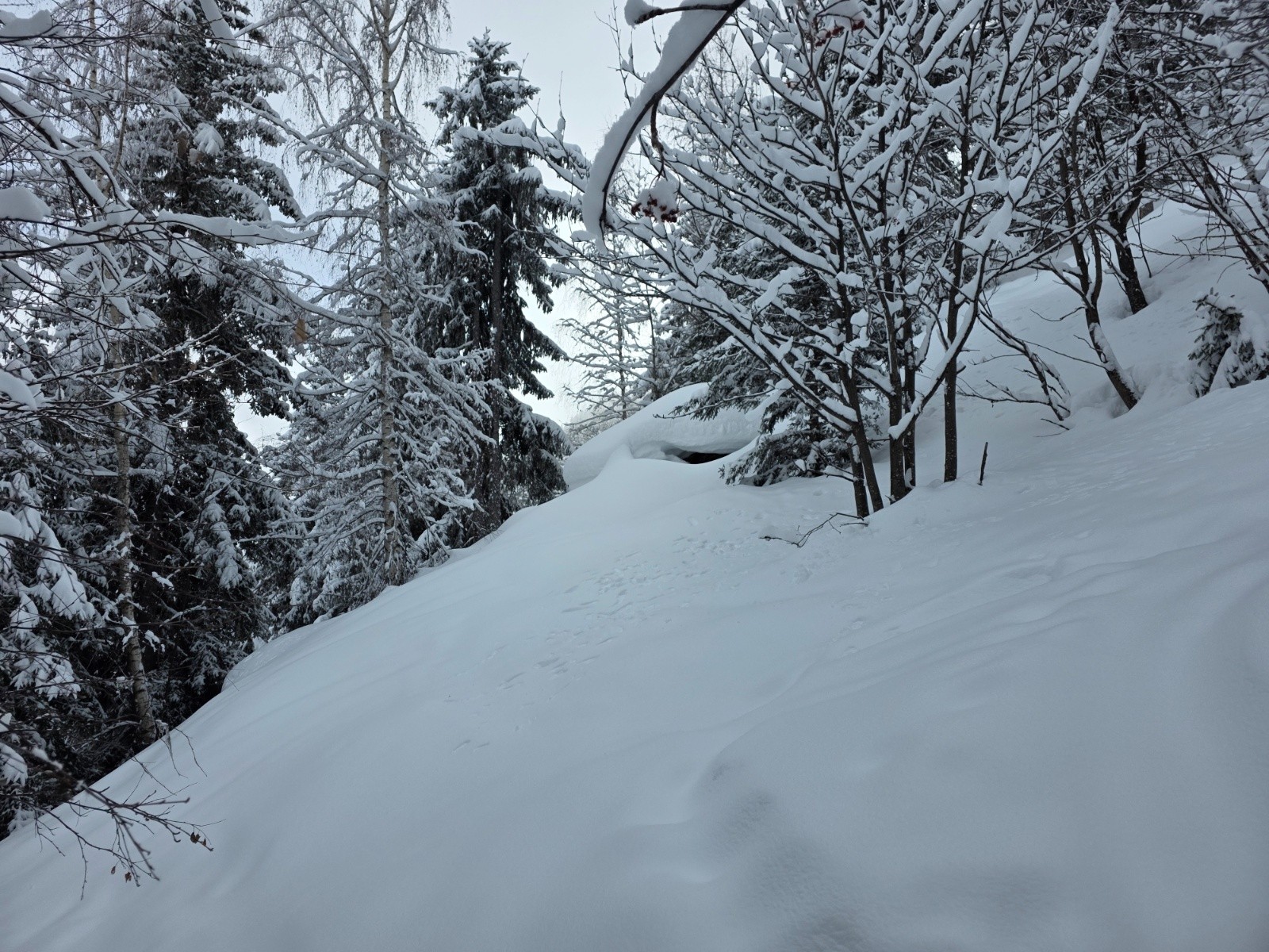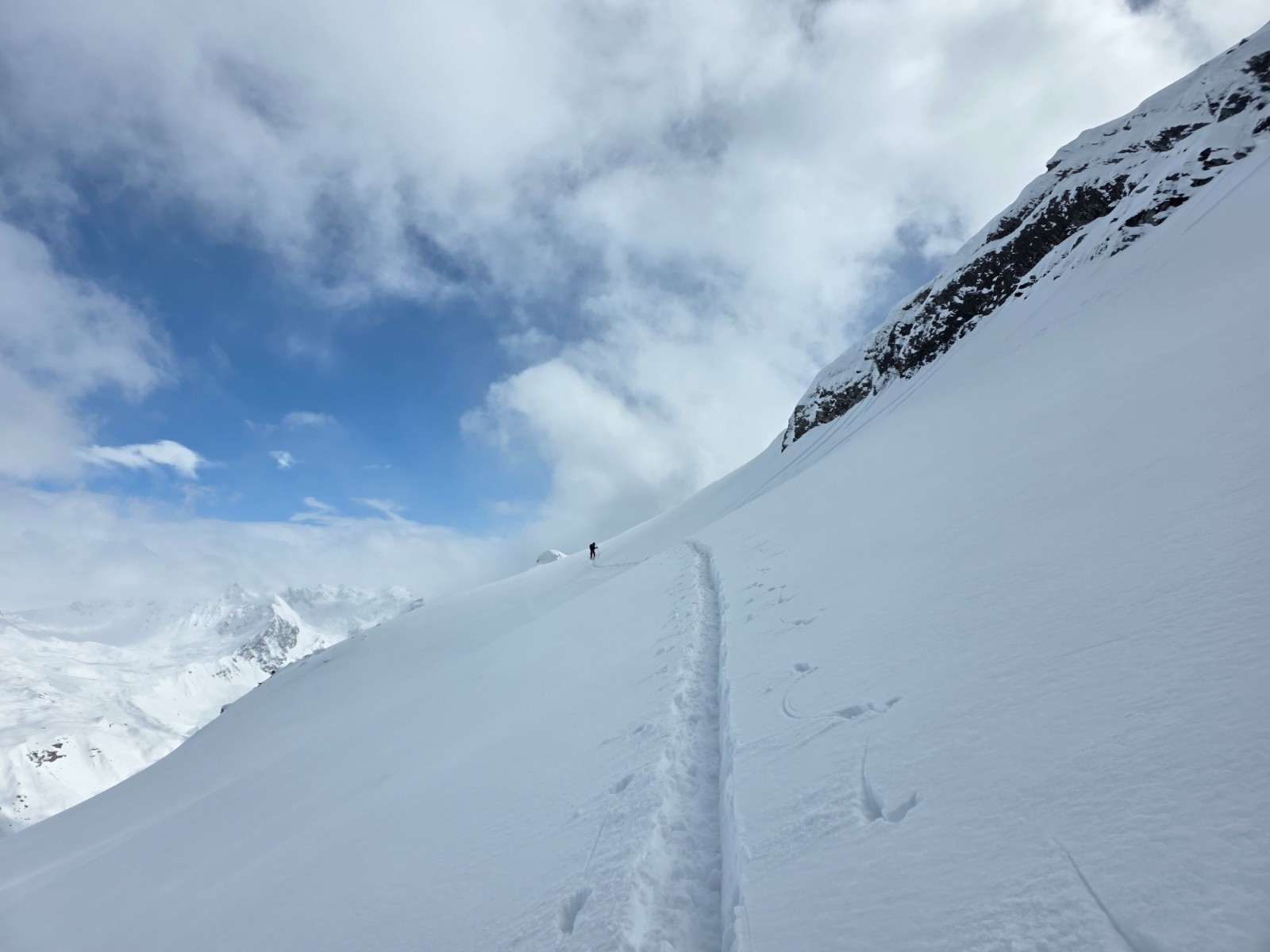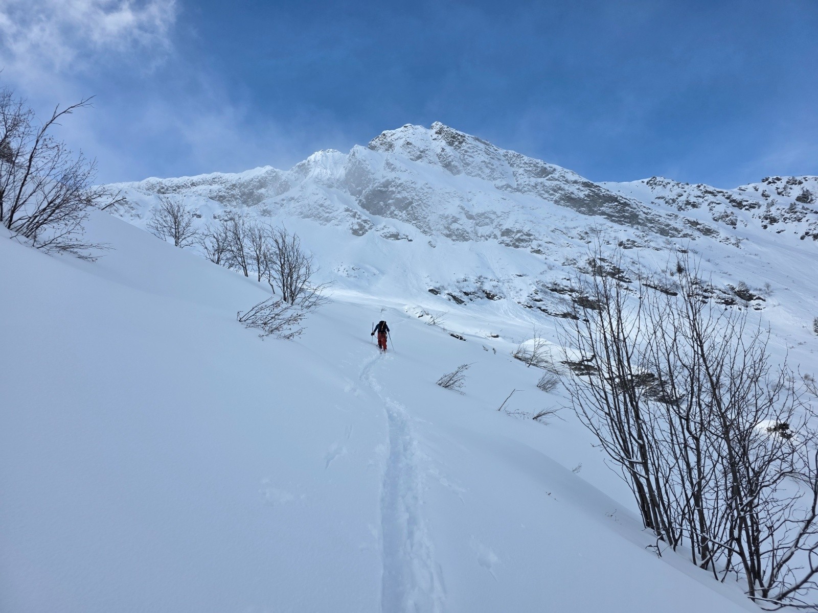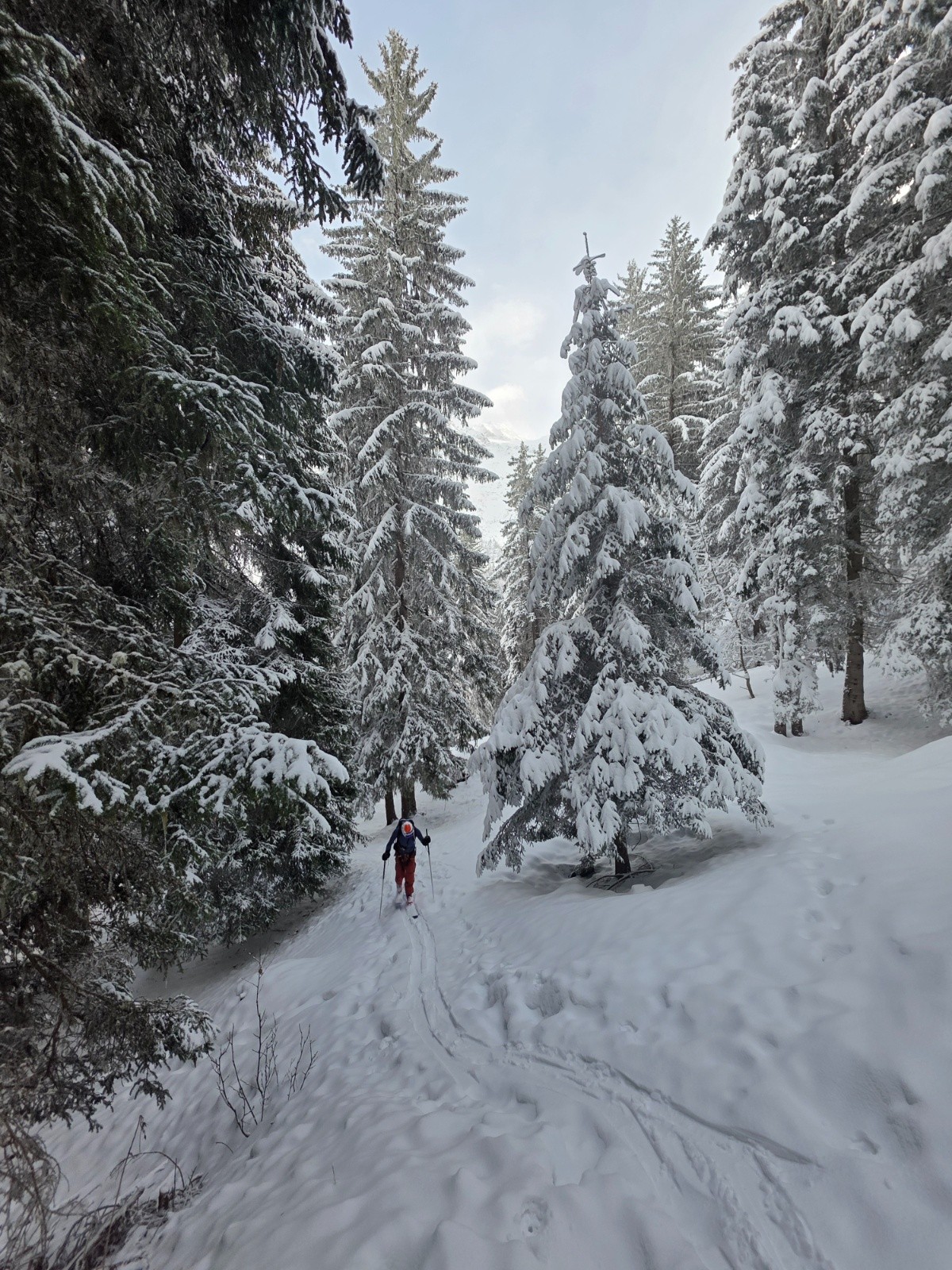 Départ 8h tempera température - 5 degrés au parking. Le parking est déjà bien rempli et en cours de déneigement. La DDE a cependant bien travaillé et l'accès et aisé à champagne le haut. Et après un enfilage délicat et difficile des nouvelles chaussures nous partons. Pas une trace sur les pistes de ski de fond que nous quittons rapidement pour remonter dans la forêt. La couche de neige est très fine 5 cm et recouvre les traces point. Nous passons cependant relativement aisément. Début du brassage de la sortie de la forêt avec 30 cm de poudreuse. Nous apercevons l'ancienne trace de montée reste apparente et qui nous guide. Nous nous alternons à tracer tous les 150 de D+. Arrivée en dessous du refuge du plan de la Gouille nous voyons deux skieurs passer en contrebas. Ils ont vraisemblablement dormi au refuge et sont montés jusqu'au dessus du glacier de la Bécane Motta côte 2800. Les traces sont recouvertes par ce vent soufflant sud-ouest et nous nous retrouvons à poursuivre à tracer. En nous tenant à distance de la face nord du Grand Bec que nous contournons, nous prenons pieds sur le glacier que nous traversons à distance l'un d'entre et accompagné d'un renard ! Nous remontons la Crète, c'est raide mais les 30 cm posé sur une couche dur nous inspire toujours confiance. Nous poursuivons. Nous nous arrêterons au moment où nous reprenons pieds sur le glacier. Les 30 cm se sont transformés en 50, et la couche de neige en dessous ne nous inspire plus confiance du tout. En considérant cela, la proximité de la Crète (nous sommes à 150m de den sous le sommet) , l'horaire, et la météo (nous sommes dans un nuage accroché au sommet), il n'en faut pas plus pour prendre la décision de redescendre. Redescendre par l'itinéraire de monter sans encombre point petit combat de rue notable en fin de descente où nous avons fait un tout droit sur les pistes de ski de fond ce qui laissera de cicatrices profondes sur mes semelles. Belle journée à 1800 m de D+