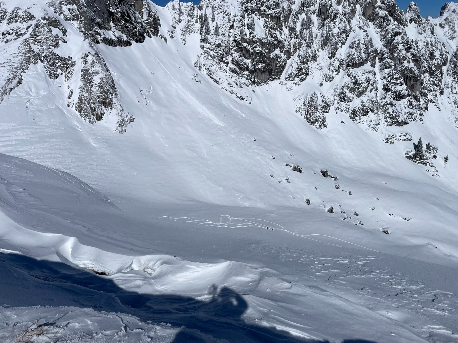 Déjà quelques personnes sont parties vers le Husegg et la Wandflue. Mais arrivé à la Grubenberghütte, mauvaise surprise en voyant le col de l'Amelier: il y a une grosse cassure, et même si cela semble jouable en tirant par la droite, la corniche qui subsiste pose question. Je m'aventure un peu dans le vallon, mais étant seul, je renonce et monte finalement au Husegg que je n'avais jamais visité non plus. Je me précipite un peu dans la descente par le N, et en me retournant je me rends compte qu'il y avait mieux à faire....
