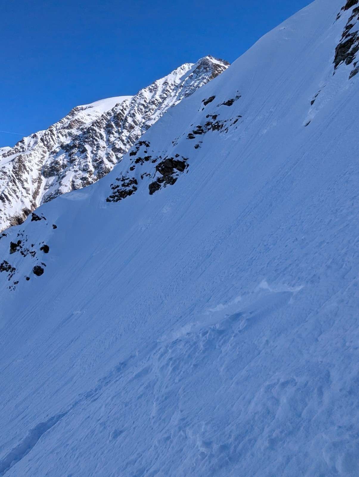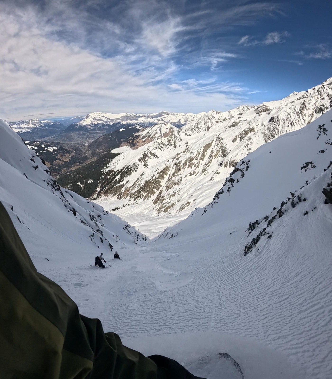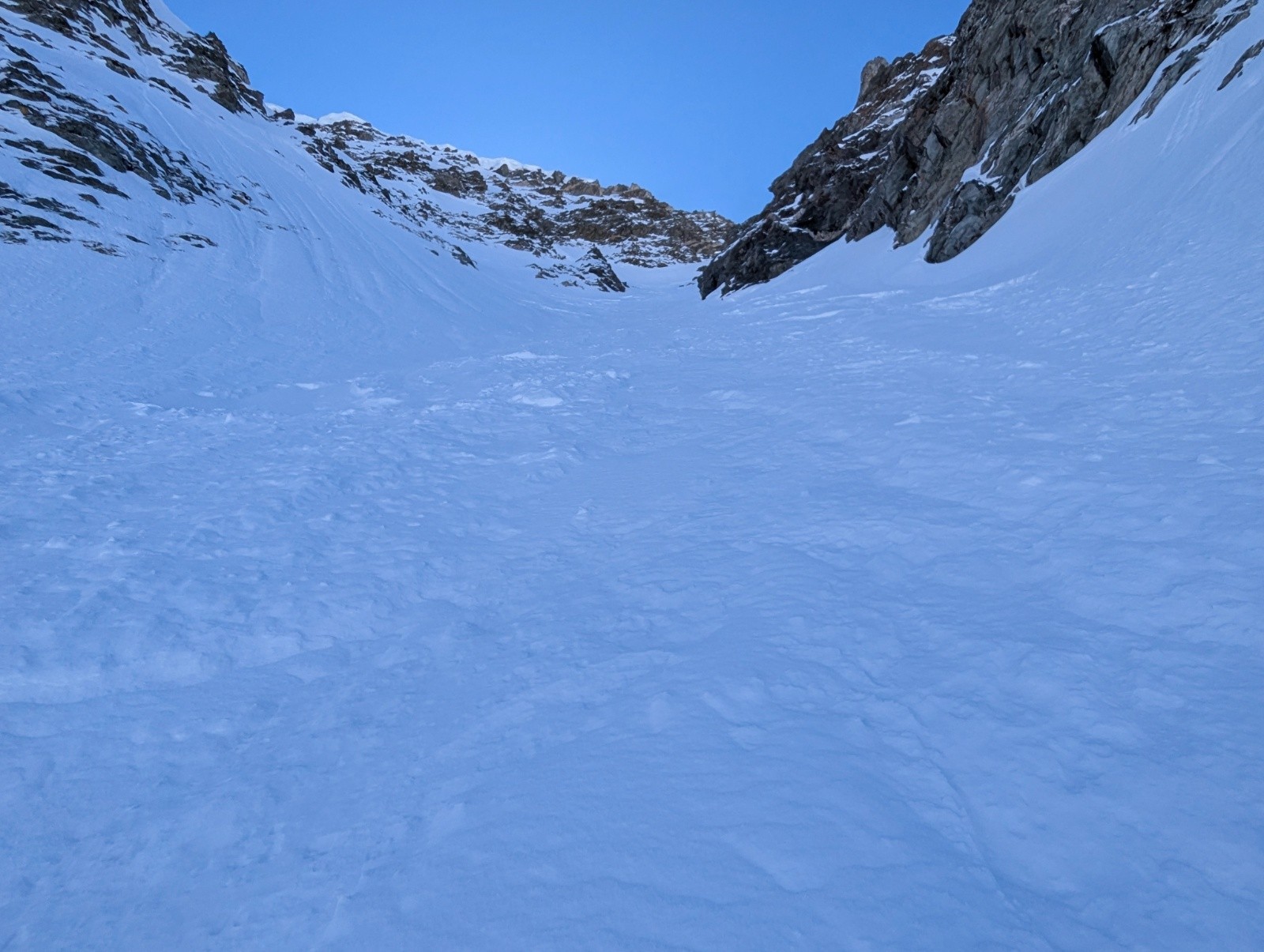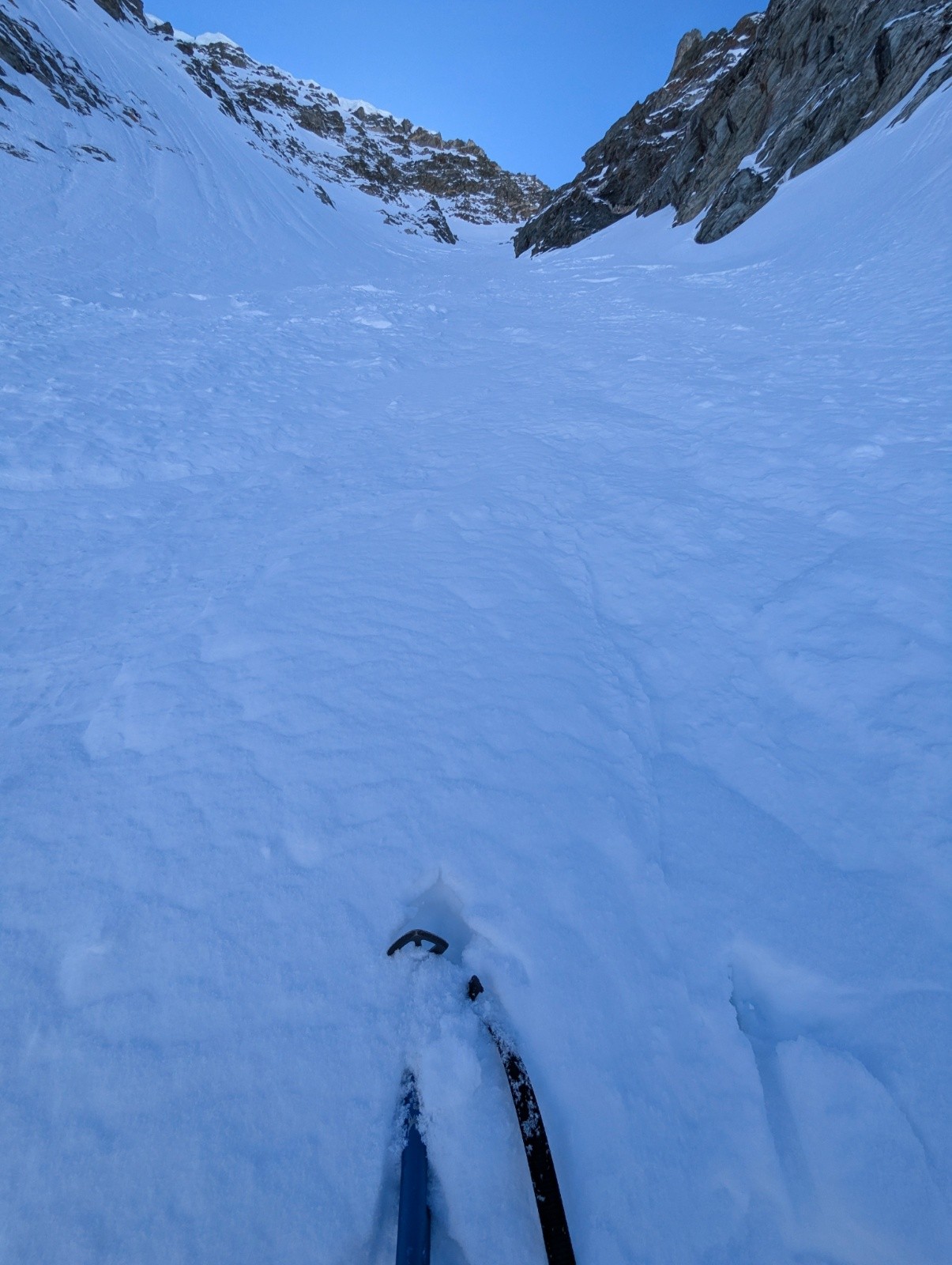 Conditions pour le ski : neige froide dans le couloir sur 30cm avec fond dur (parfait pour remonter à crampon piolet)