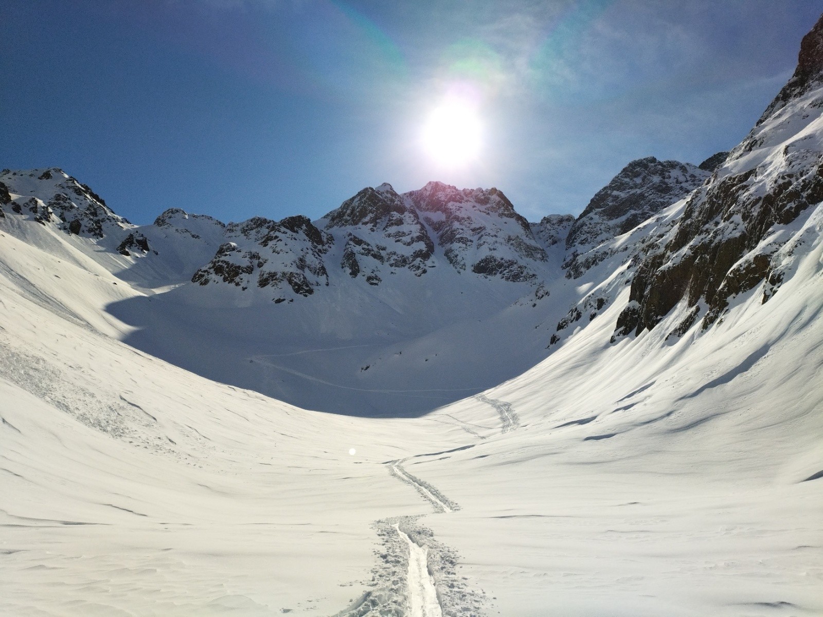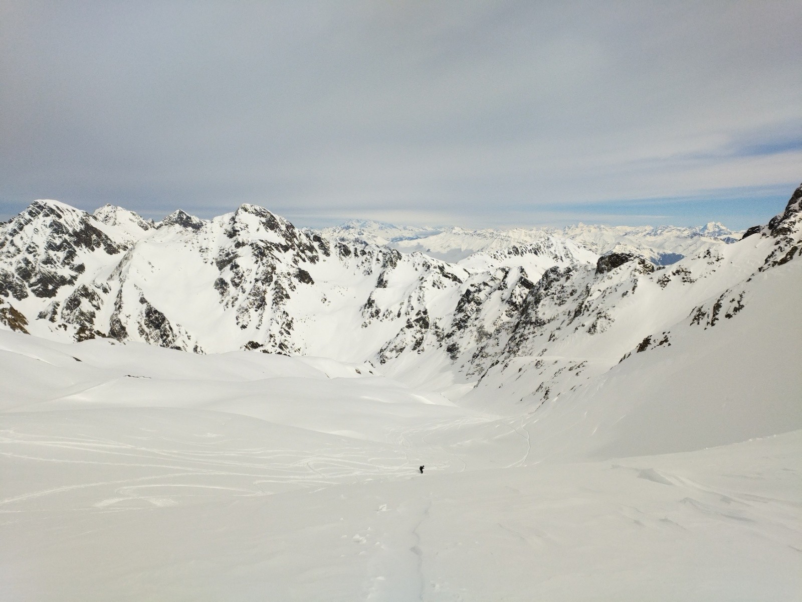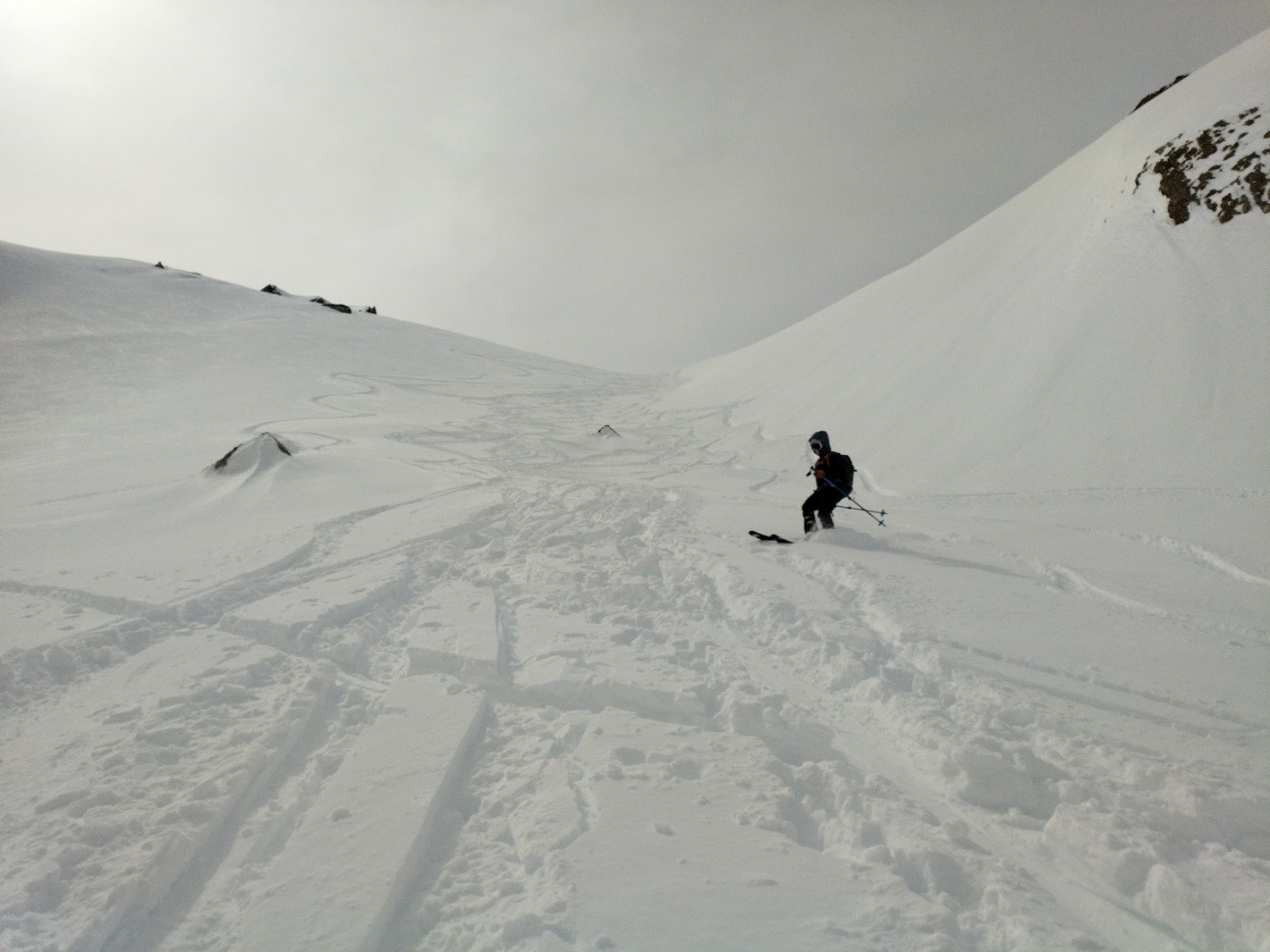 Et surtout, les traces sont souvent confondues avec la trace de montée, laissant une place incroyable pour la descente. A lire leur CR on comprend mieux : le brouillard les a un peu forcé à suivre un fil conducteur. Merci à eux en tout cas, leur trace s'avère bien utile pour avancer tranquillement dans le vallon!