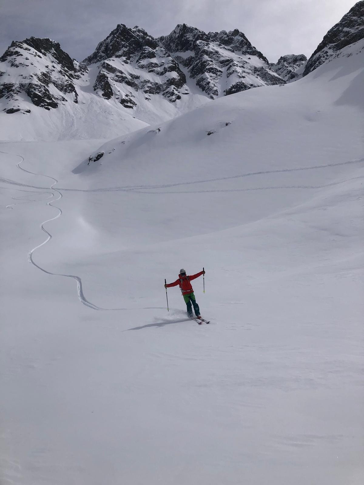 La descente durement gagnée s'offre à nous et aux quelques chanceux également présents ce jour là. Il y a de l'espace pour tout le monde, c'est un bonheur!