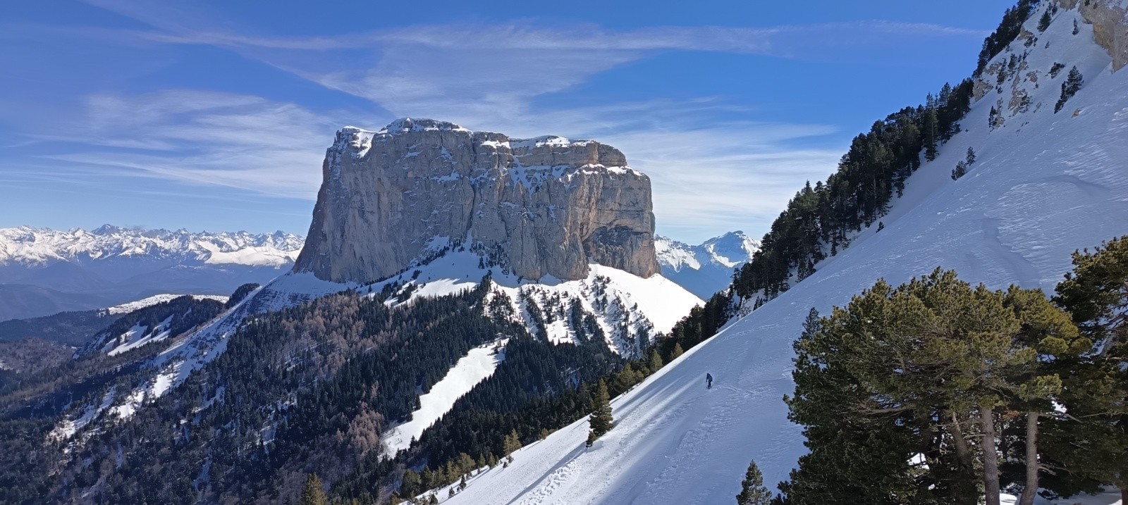 Conditions nivo et activité avalancheuse : Les pentes ont déjà bien purgé sous le pas des Bachassons, qqs petites coulées de neige lourde en forêt sous le pas de la Selle. On a pas osé la crête S du Gd Veymont vue de loin slmt (cf photo, plaquée ?)