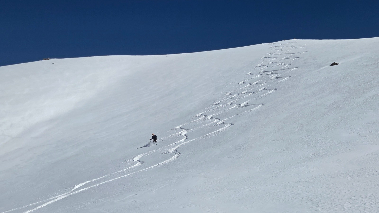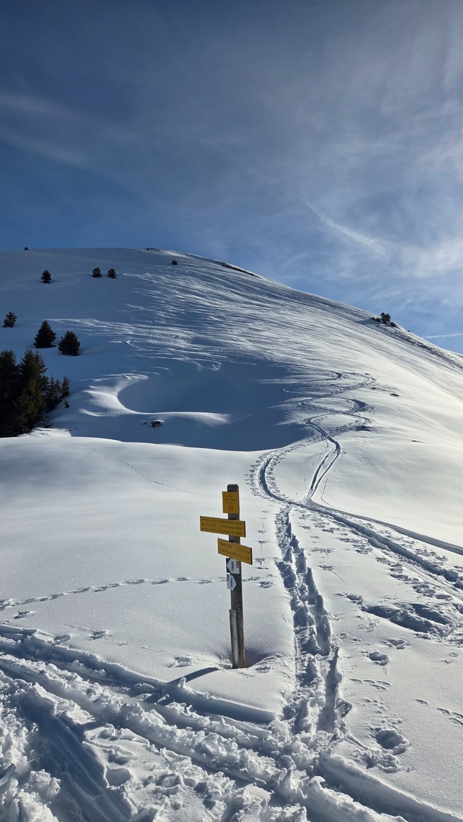 Conditions pour le ski : De tout. Poudre hétérogène en NW de 2700 à 2400m, puis lourde traversante en SW jusqu'à 2200m, puis decaillee ok jusqu'à 1900m, puis poudre Excellente sur 15 m de large le long des Épicéas en N jusqu'à la source.