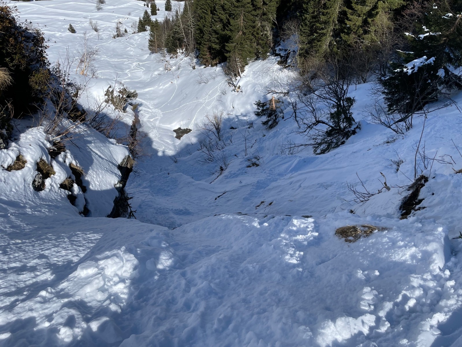 Conditions pour le ski : la montée par le sentier du Plan des Gouilles passe bien en forêt , neige extra encore poudreuse le matin , neige qui commence à transformer à la descente en dessous du Refuge