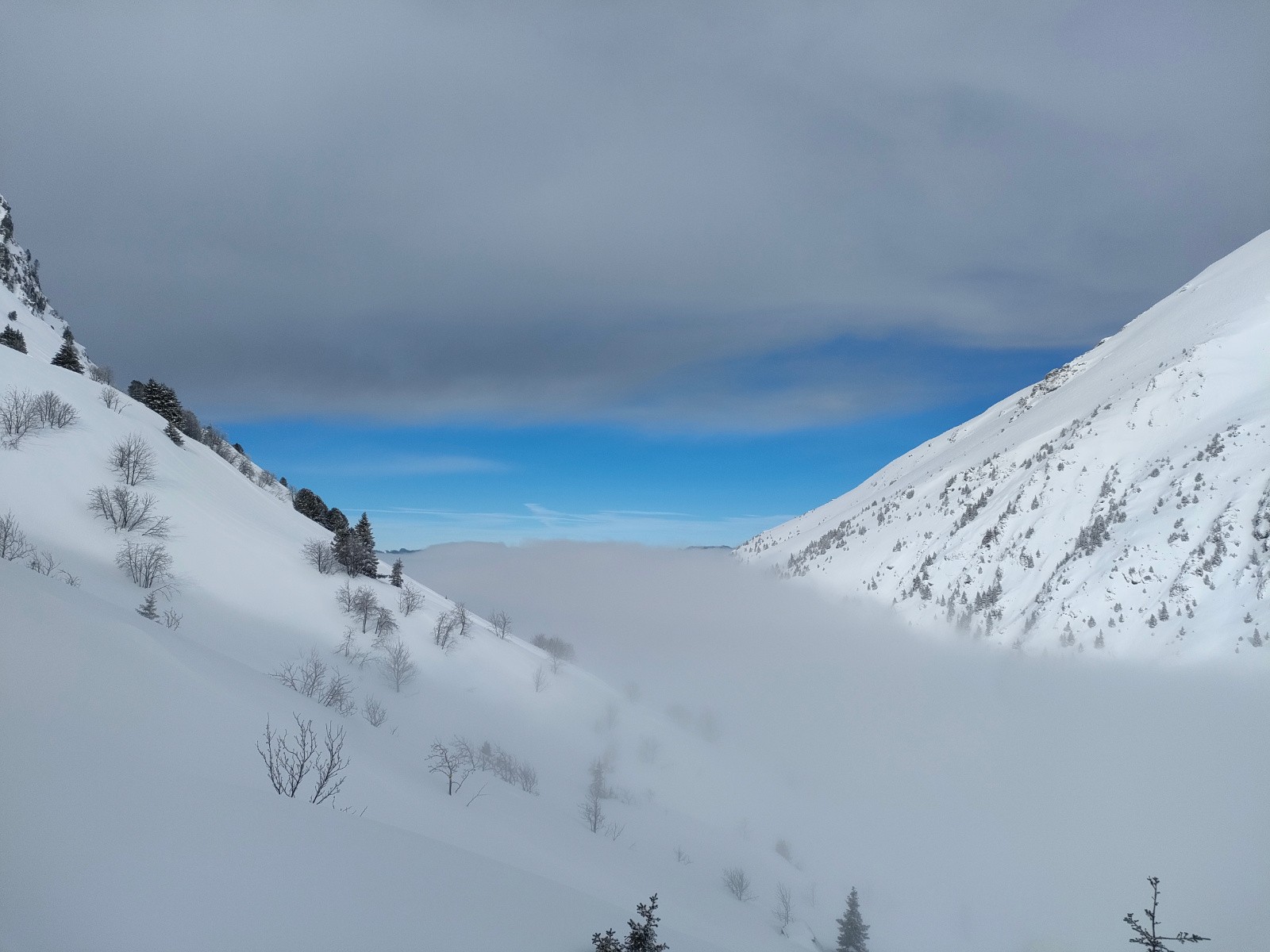 Brume légère avec magnifiques éclaircies vers 1900 m, sommets dégagés mais vallon embrumé toute la matinée.