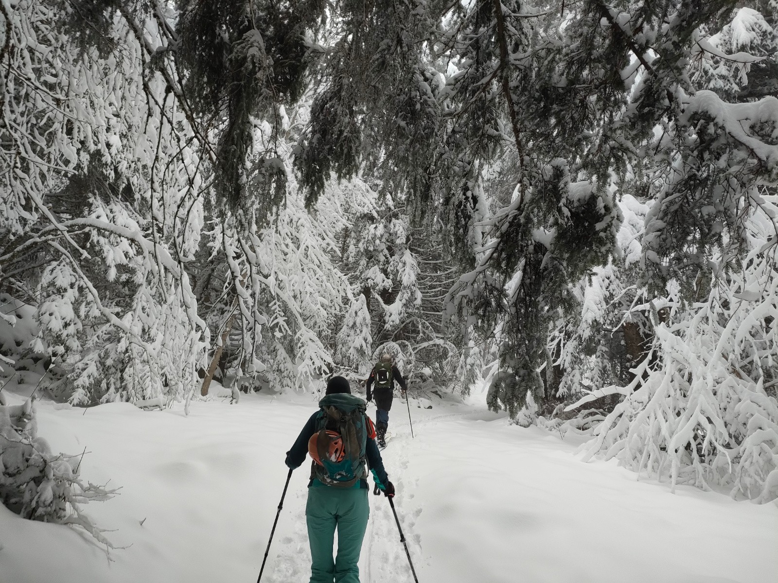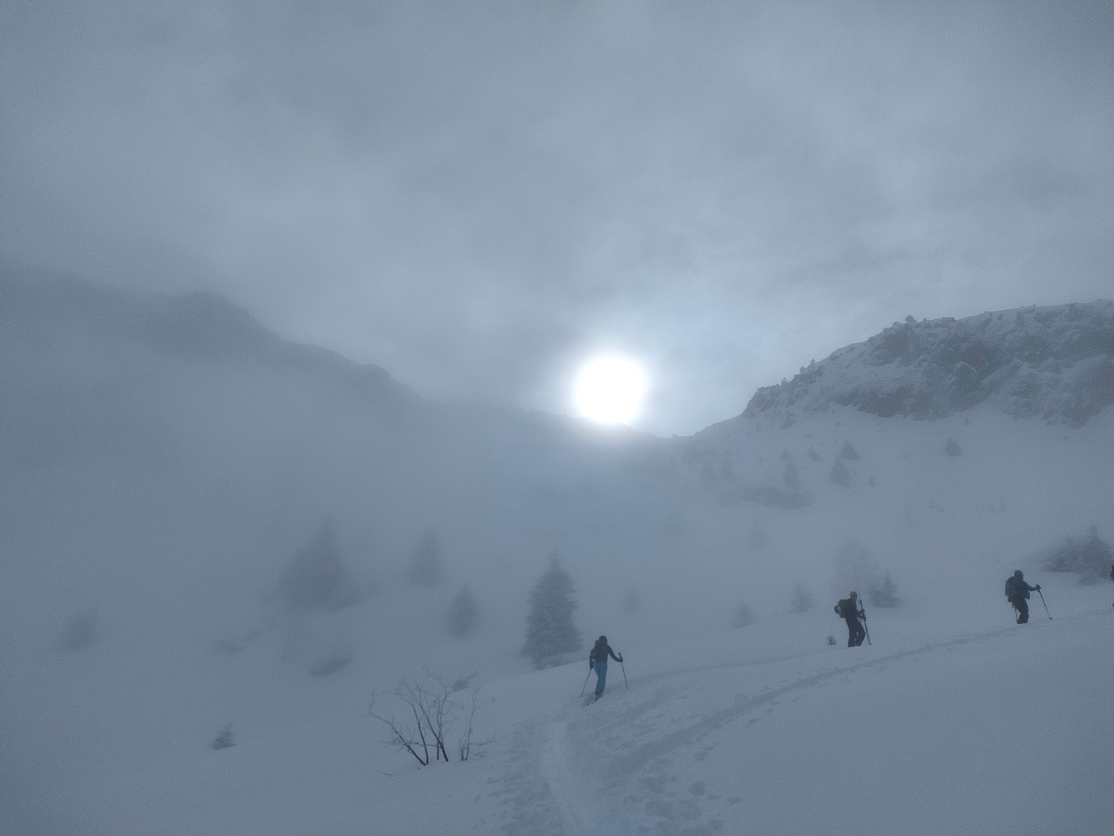 La pente étant bien soutenue, et malgré une brume légère qui voile autant qu'elle sublime la forêt nous arrivons rapidement au vallon principal. On y voit peu de reliefs, et c'est là que la magie opère. De la brume grise qui cachait tout, une sphère blanche apparaît dans le ciel, et deux inspirations plus tard, le Pas de la Coche, l'Aigleton, la Jasse, tout. Nous étions au bon endroit au bon moment, c'est beau d'être là en cet instant. Rapidement la brume revient, c'était beau aussi parce que c'était rare et éphémère. C'est comme une révolution bolchévique, c'est beau au début mais ça part bien vite...