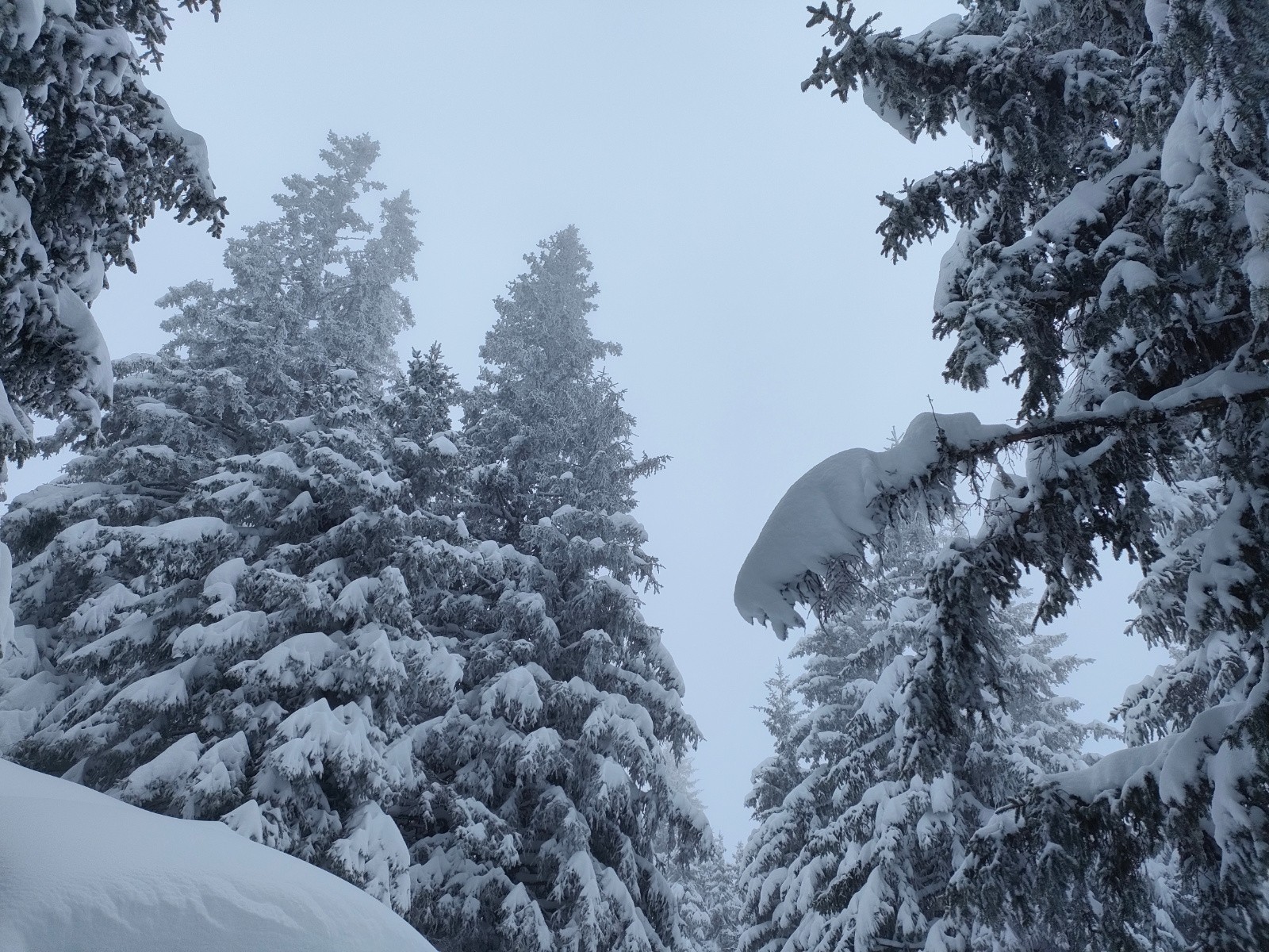 Pourtant, on pourrait se croire en croisière, le paysage en tient de quoi. La neige a envahi les moindres recoins de la forêt, des couettes, des coussins, des bourrelets blancs partout font désormais le lit du vallon. C'est beau, c'est moussu de partout sous les majestueux sapins, on profite avec les yeux tandis que les cuisses maintienne l'effort.