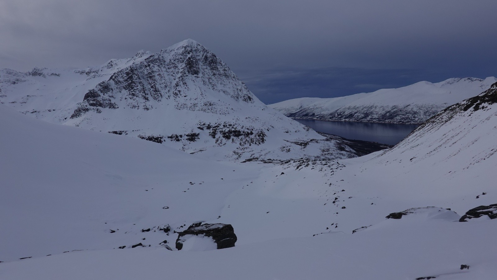 Départ tardif pour le Middagstinden dans le massif du Malangen, à 10h30, le temps que la météo pluvio-neigeuse du début de matinée se calme un peu. Le soleil est même de la partie au moment de chausser, avant de laisser rapidement la place à une grisaille tenace dès la mi‑journée. L’itinéraire commence par un long cheminement dans une forêt dense de bouleaux, où il faut se faufiler entre les troncs ; en sortie de forêt, la pente se redresse autour de 30° avec une neige dure, rendant la progression plus délicate notamment pour Anna et son split sans couteaux.