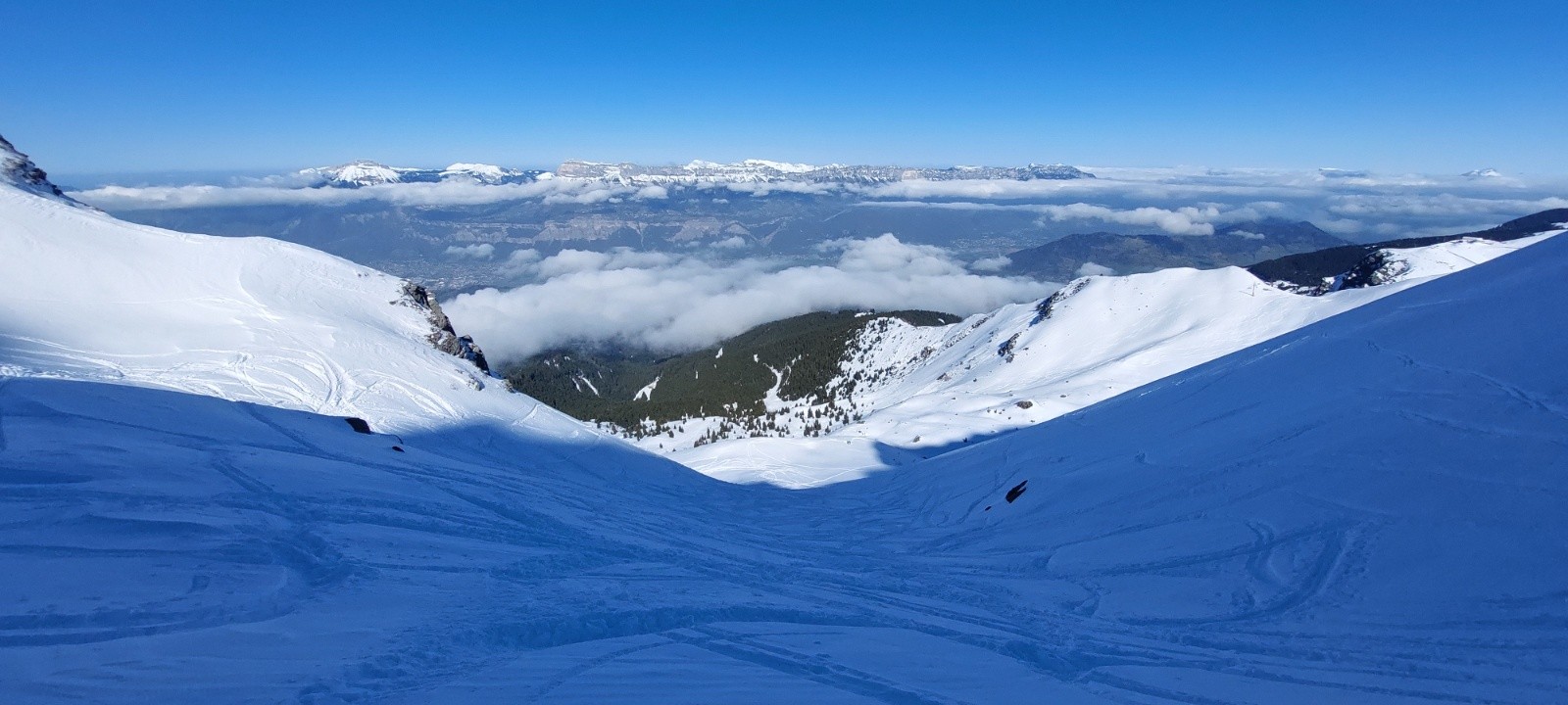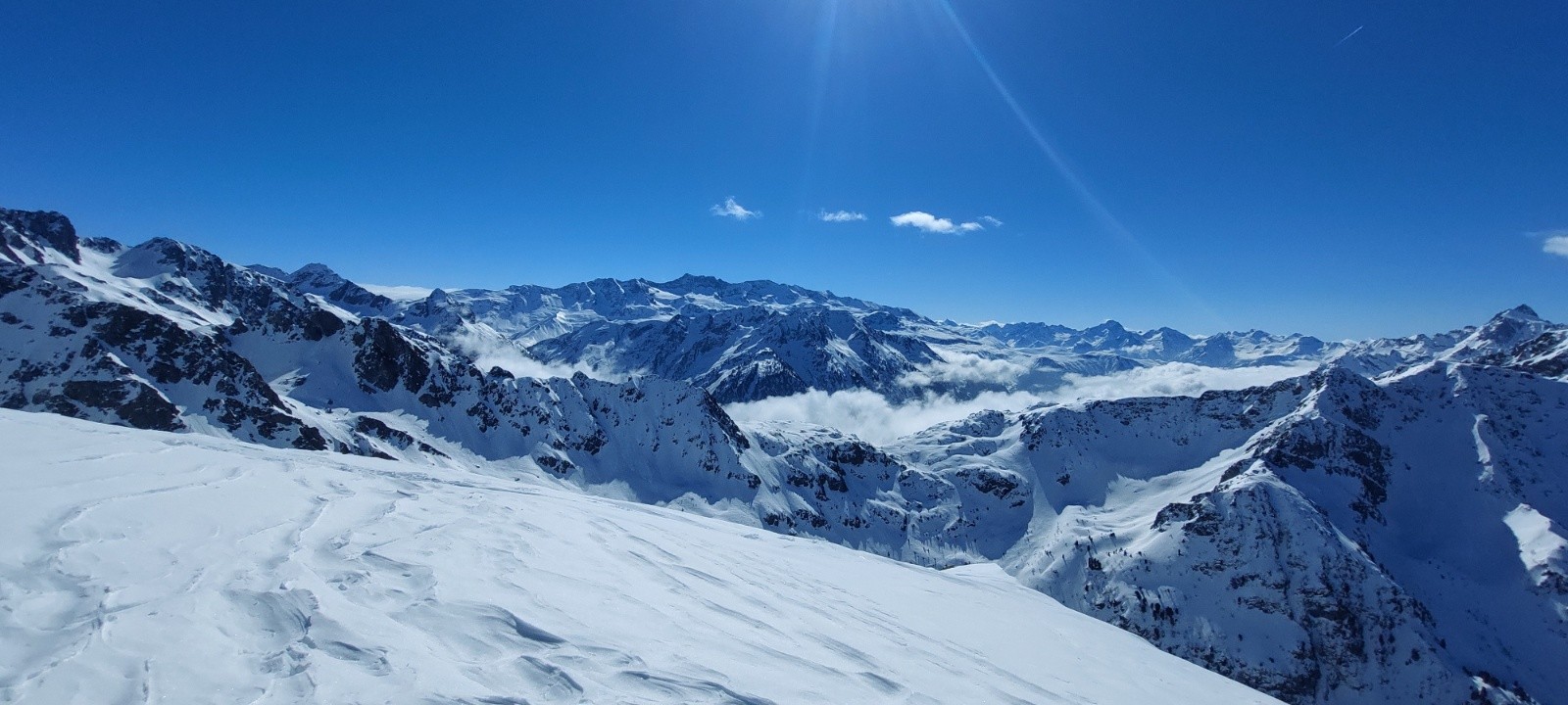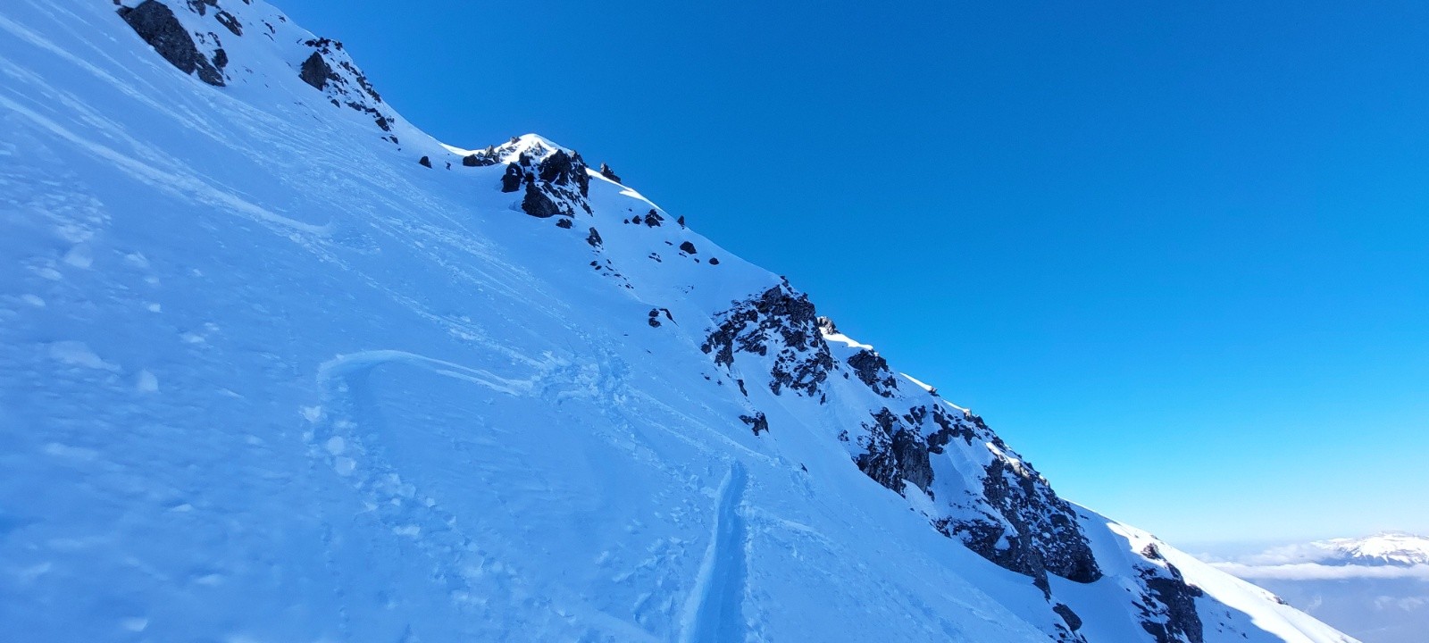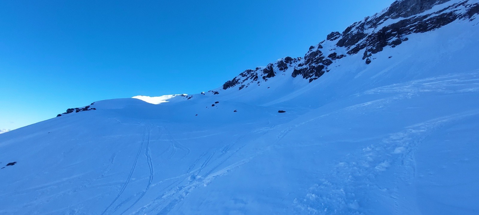 Conditions pour le ski : ok... la poudre recherchée n est présente que ds le 1er couloir, voire la 2eme pente, en dessendant mais sous 1800m environ, c est fini la poudre.. le vent et où la chaleur a compacté , croûtée .. dc juste ok car je pensais avoir de la poudre en descendant main gauche plus lgpts...