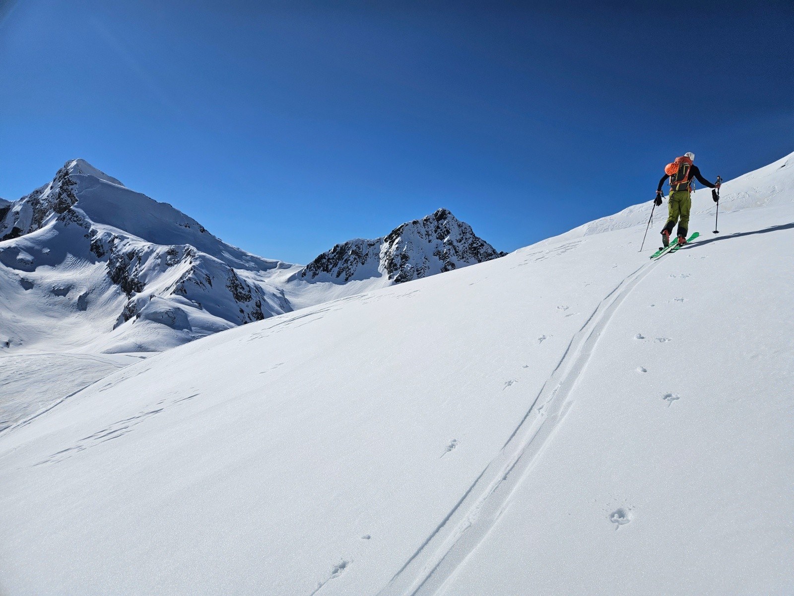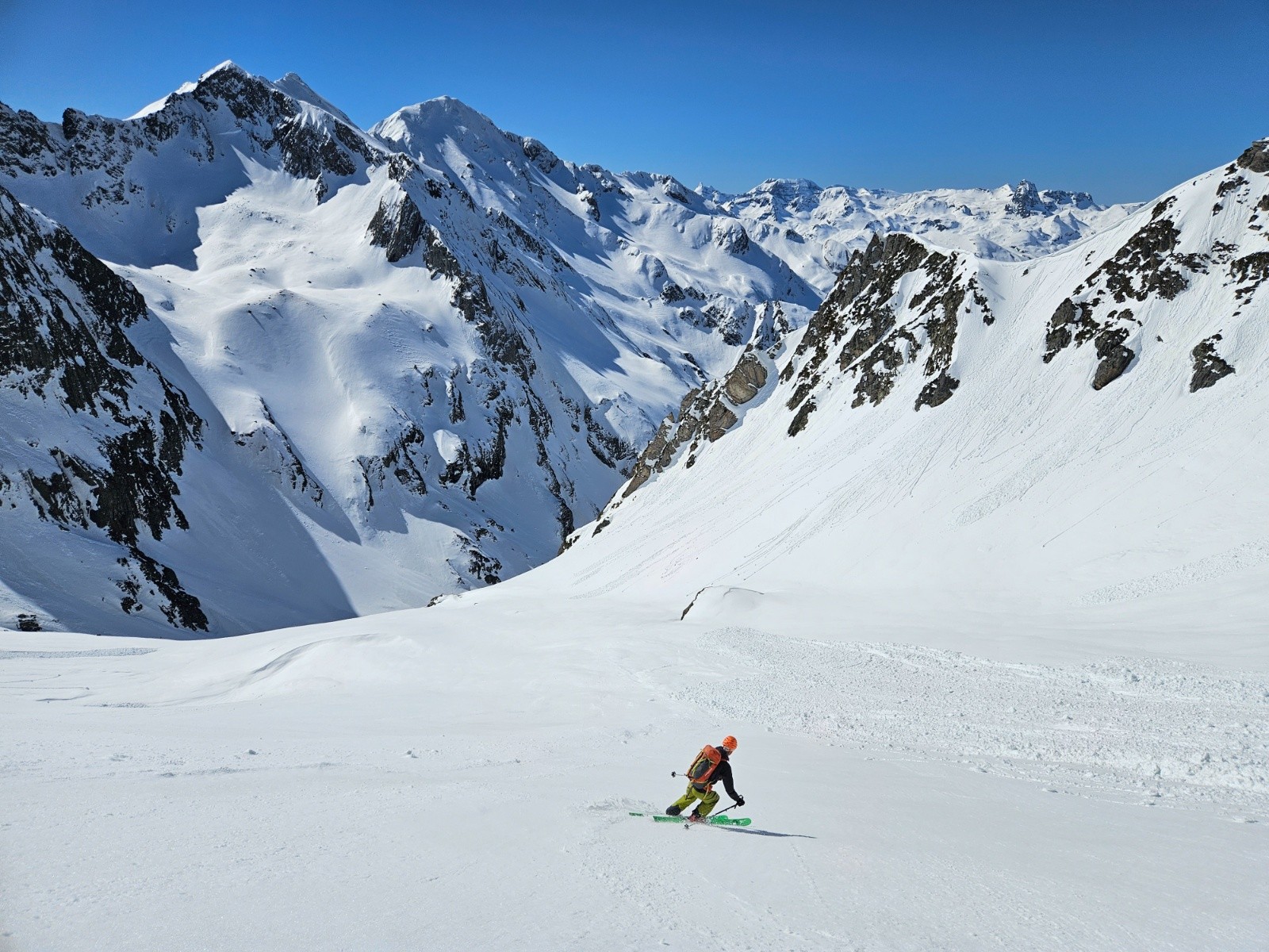 Les zones de neige récente etaient déjà trop humidifiée et pas encoreassez tasséepar les cycles de gel/dégel (ski très moyen). Les très rares zones où l'ancien manteau jaune bien tassé était apparent étaient en moquette (tres bon ski).