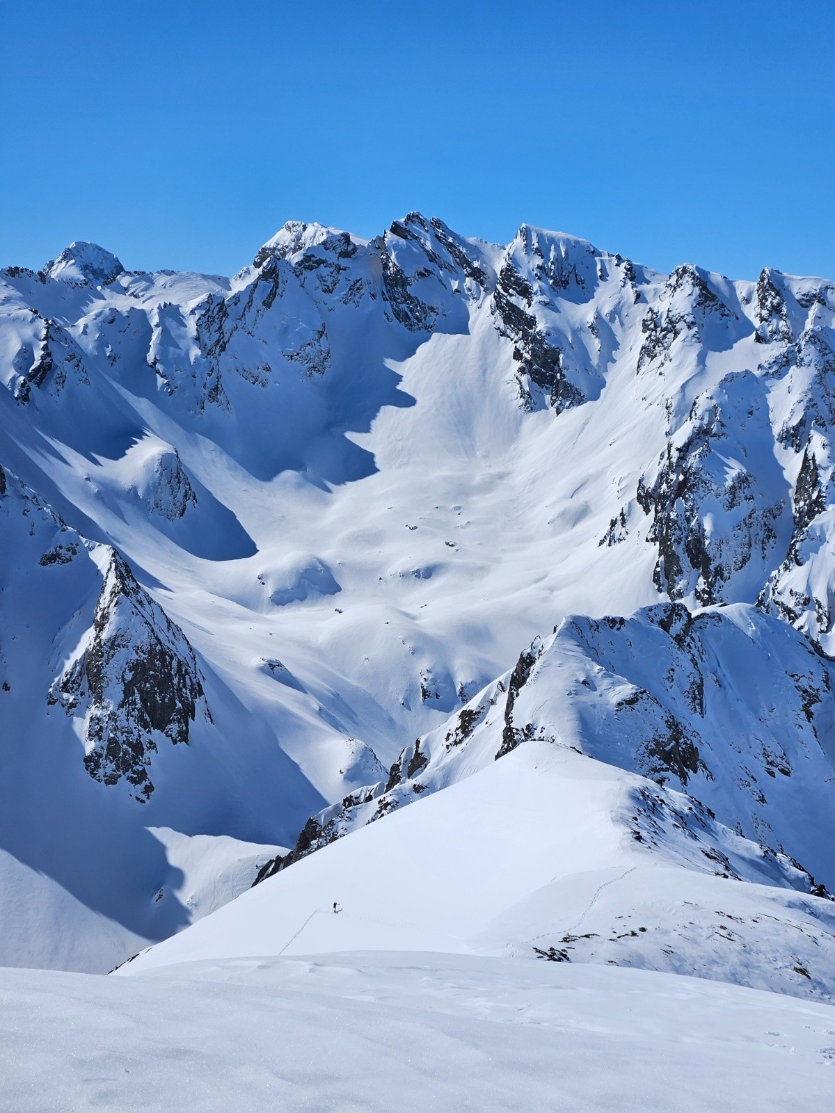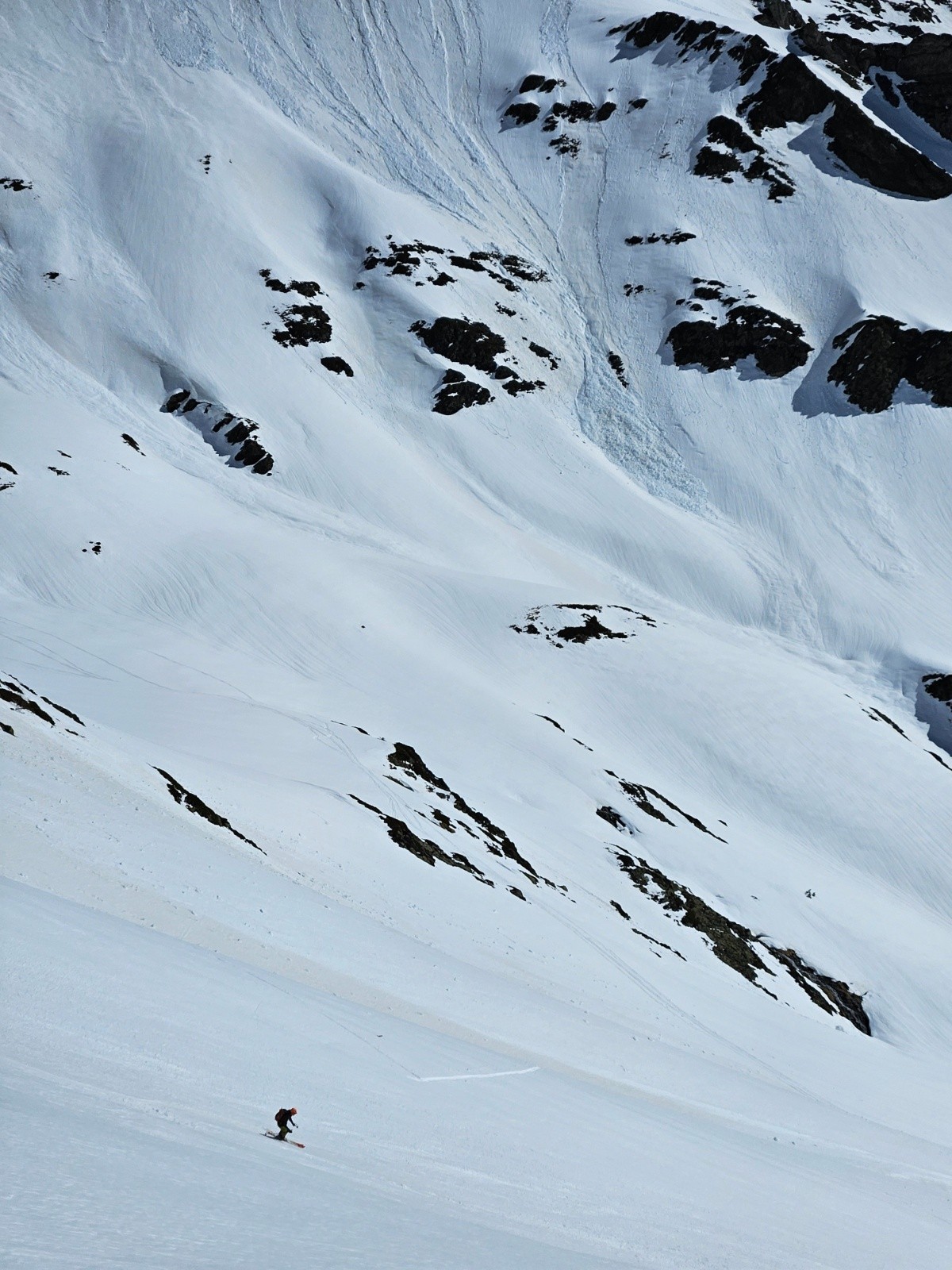 Conditions pour le ski : transfo lourde à 11h15, qui se skie bien sur le haut, mais semble dégradant sous 1800m (collante, coups de frein).