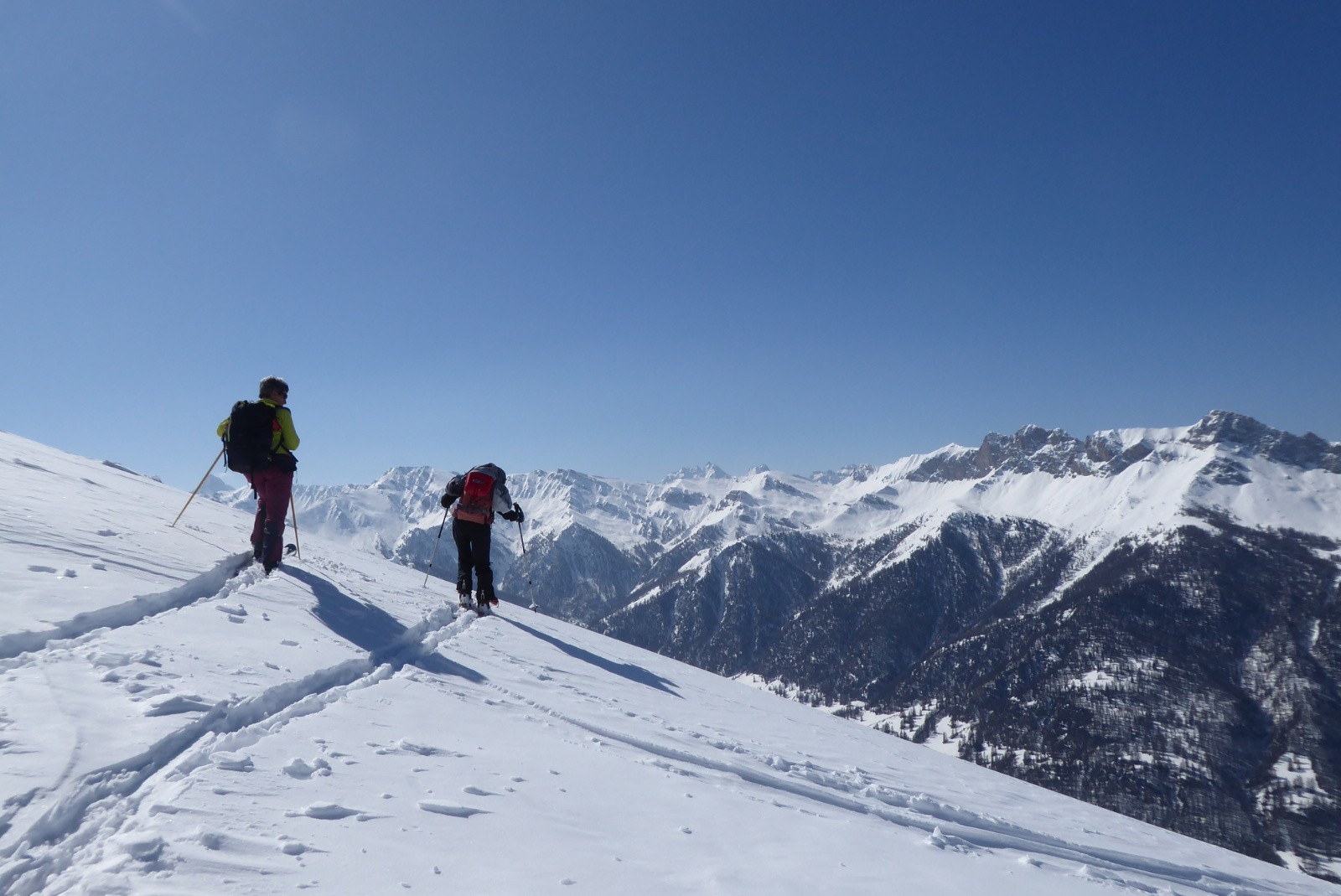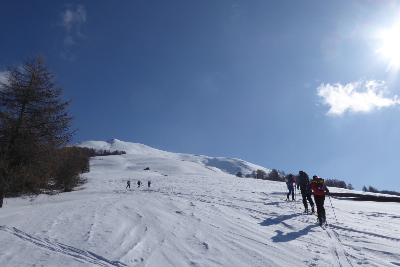 Sortie débutants CAF Guillestrois/Queyras organisée par Annie. Finalement Il n'y avait que 2/7 qui vraiment débuté pour lesquels la qualité de neige n'était pas au RdV pour la descente. Le départ (sur D>= 50 m) va très vite obliger de porter les skis. il ne reste plus que quelques plaques de neige.