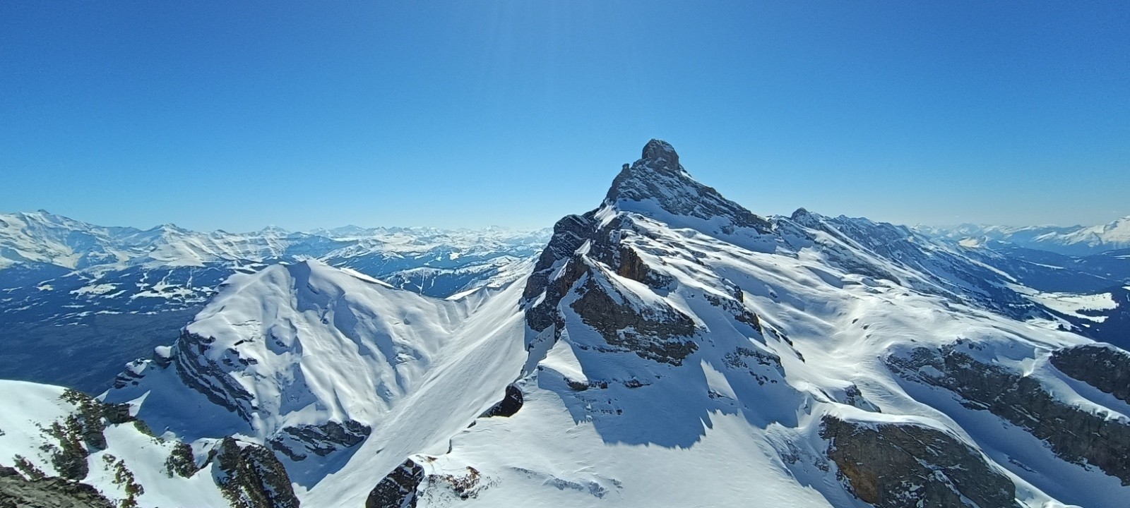 Conditions pour le ski : Descente vers 13h : bonne skiabilité sur toute la face jusqu'à 2100m environ. Ensuite, neige en transfo, moquette.