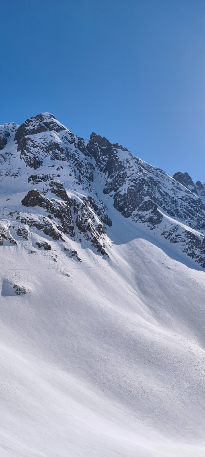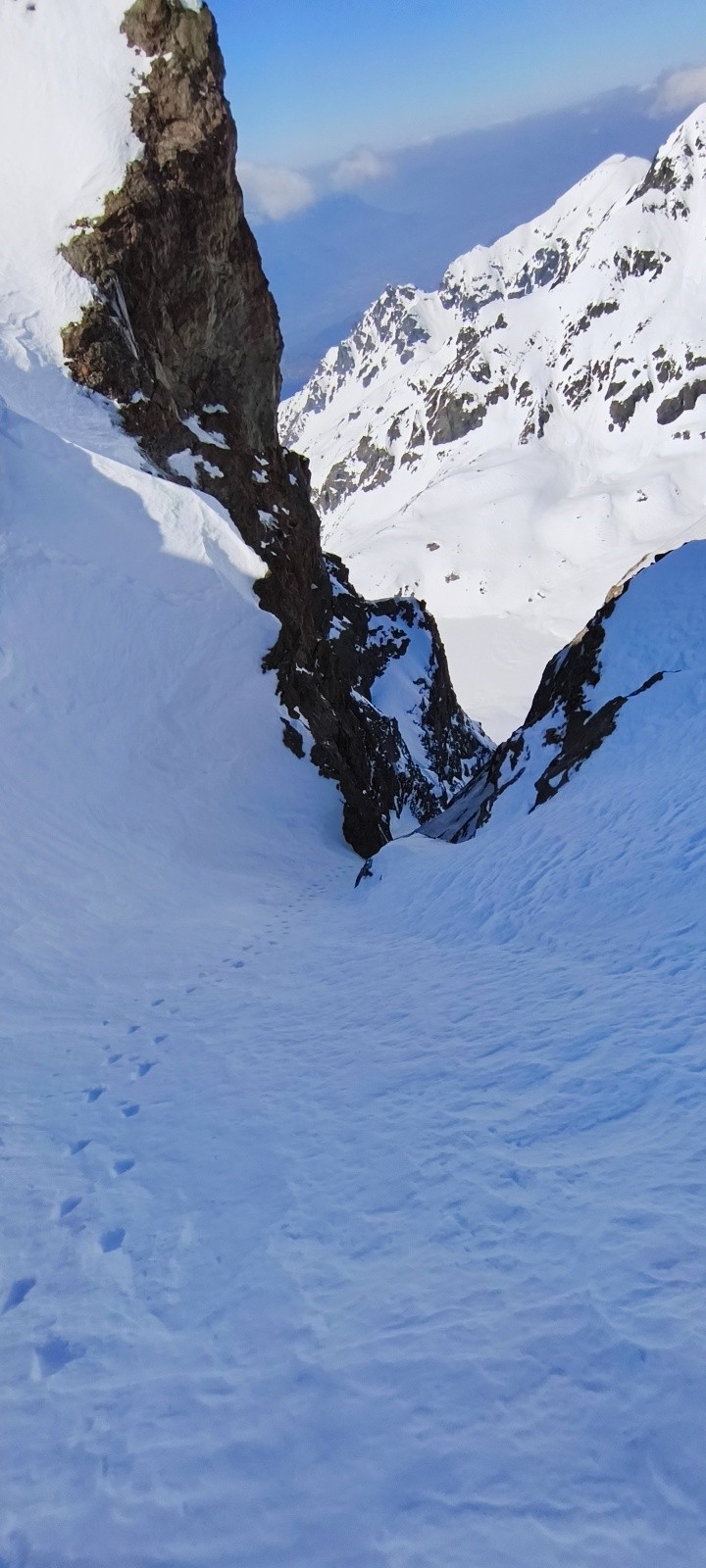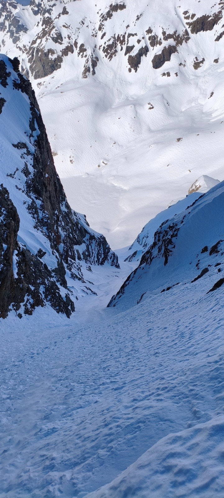 Descente bonne, la neige sur le début n'est pas incroyable mais pas béton et relativement sécurisante . Le goulet se passe bien, même si c'est étroit ≈1m60/50 (?). La suite est bonne, il y a un patch de neige ventée légère de ≈3m de large (plus par endroit ) le reste c'est croute léger , en restant là dessus c'est top .