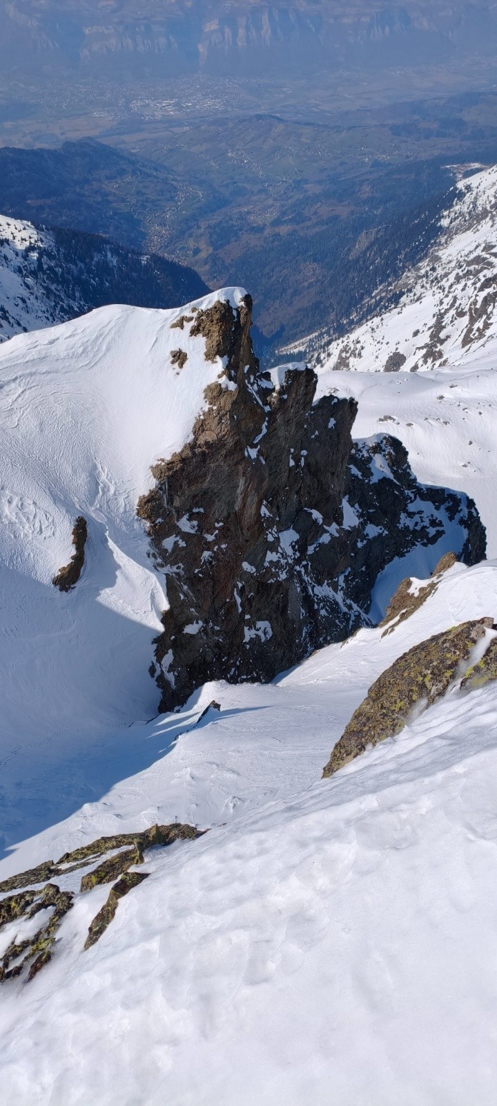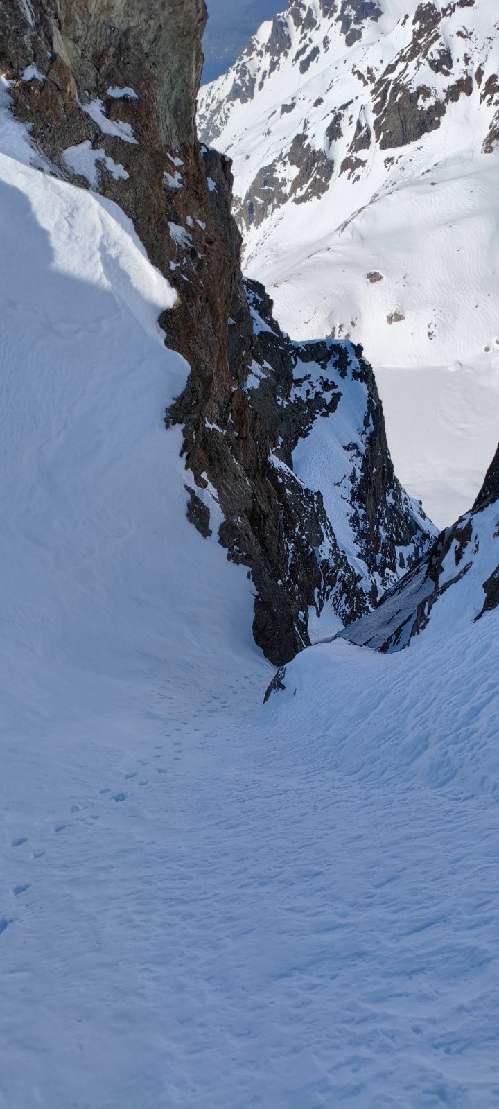 La neige s'annonce bonne en sortie de couloir ventée mais encore relativement légère , en skis jusqu'au réel début des hostilités, petit coupe pour voir ce qui ce passe en dessous . Bilan j'ai eu mal à la main à taper comme un sourd mais à priori ça ne bouge pas . Le couloir se remonte bien, pas de la natation mais suffisamment souple pour annoncer une bonne descente . Le goulet est plutôt bien enneigé tout passera skis aux pieds ! Au dessus du goulet la neige est plus dure , attention au niveau de la sortie , on vois deux plaques de chaque côtés ≈30cm de haut formés par le vent .