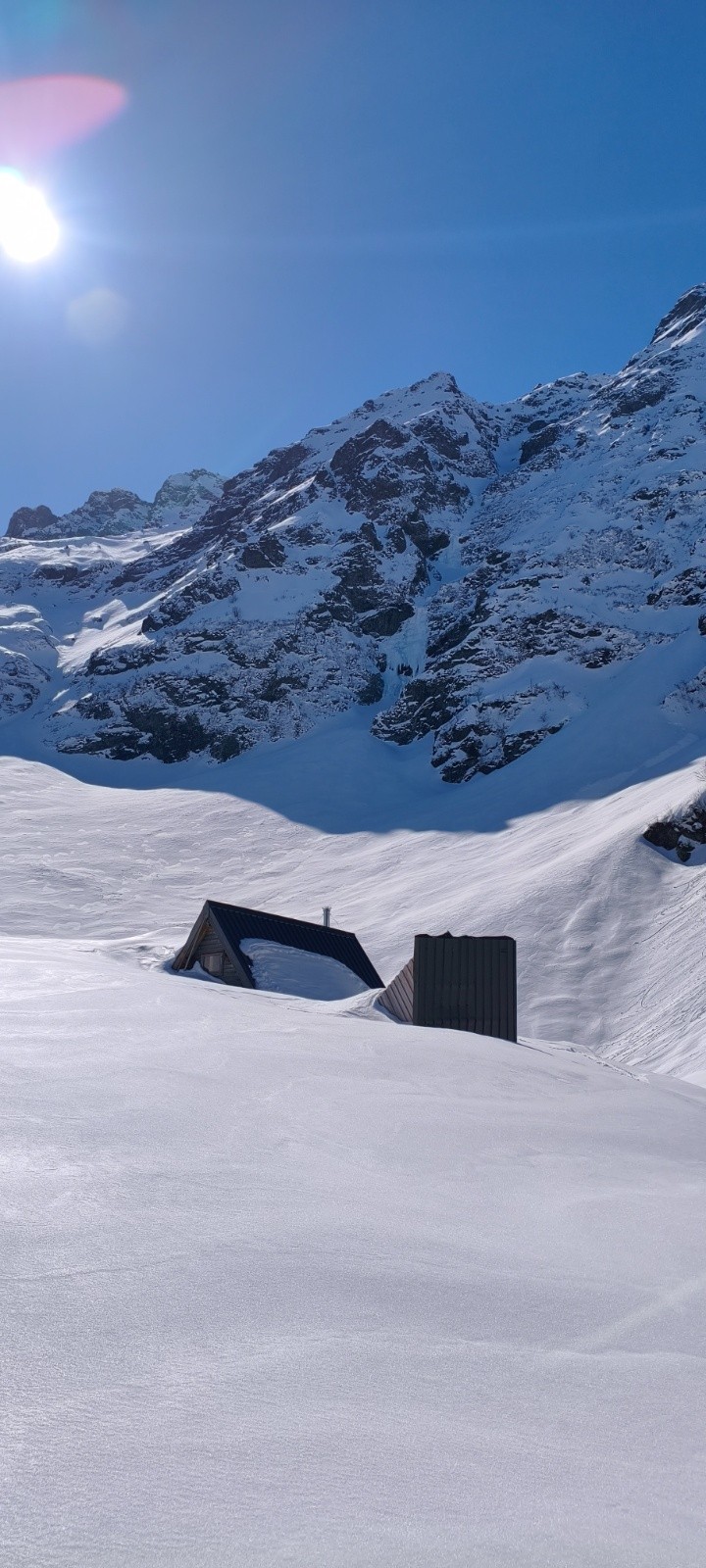 Départ de Grenoble en train pour gagner du temps et du sommeil , puis lancey / parking de la gorge en vélo . Probablement l'un des vallons les moins fréquentés sur ce côté de Belledonne, avec un départ si bas ... 906m tu sais que tu vas porter . Ça n'a pas manqué les skis sur le sac jusqu'à l'écluse ≈1350m, arrivé au refuge sous le lac blanc, là comme d'habitude ça fait flipper, la face sud ou il faut passer est complétément sous les coulées , alternance conversions et ski sur le dos à remonté directement dans les coulées réglées par la nuit . Petite forme et arrivé au lac blanc / début du couloir en pile 3h TTC , sandwich du courage face au grand pic de belledone et début de la remontée.