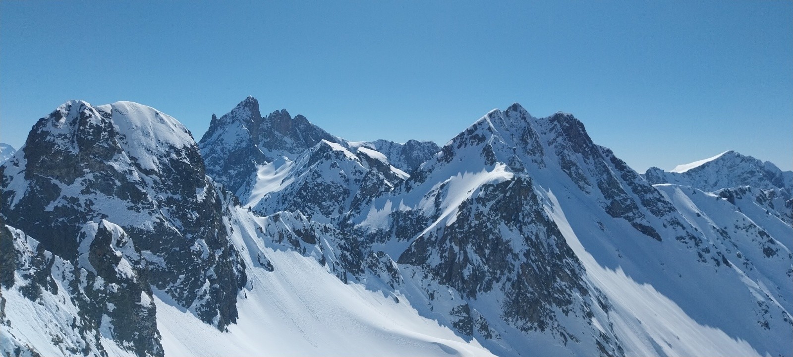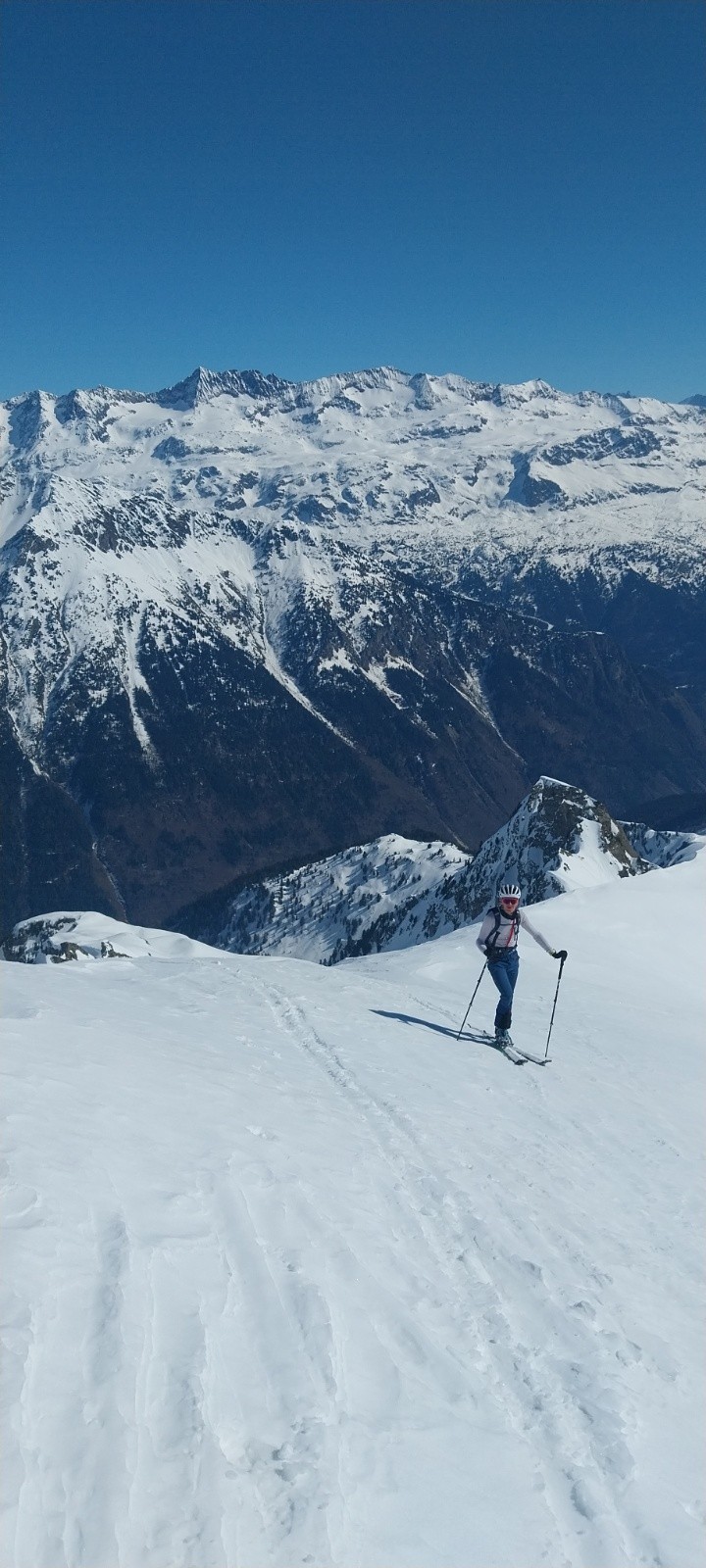 À 1900m on se décide à remonter, si on était descendu plus bas on aurait fini au pied du vallon de Roche Noire... Je me remets à la trace, fini le traçage en poudreuse, cette fois-ci c'est neige humide. On remonte sans soucis jusqu'au pied de la brèche puis on attaque tranquillement. Je l'ai déjà passée à ski et à pied donc on décide de voir ce que ça donne à ski au début. Les conditions n'ont jamais été aussi bonnes pour monter à ski, c'est finalement passé tout seul malgré la pente qui nécessite que je mette à profit ma souplesse maximale😂. Changement de vallon, changement de décors mais à vol d'oiseau on est carrément à coté ; c'est ça la magie de la montagne🥰 ! Toujours à la trace on a fini la montée au Pic de la Pierre sans difficulté. J'ai voulu repérer le couloir N mais les corniches sont vraiment balaizes par rapport à l'année dernière. Ce sera donc descente en face ouest comme les autres fois. Début de descente face au Grand Pic et au Rocher de l'Homme, c'est grandiose ! Une fois le haut en face sud passé on tourne pour descendre en Ouest. En visant bien on trouve de la vieille poudreuse pour un joli plaisir à la descente. Sur la fin on a tiré rive gauche pour faire plein de beaux virages sous les 3 officiers dans une très bonne neige en haut mais avec une légère croûte tout en bas.