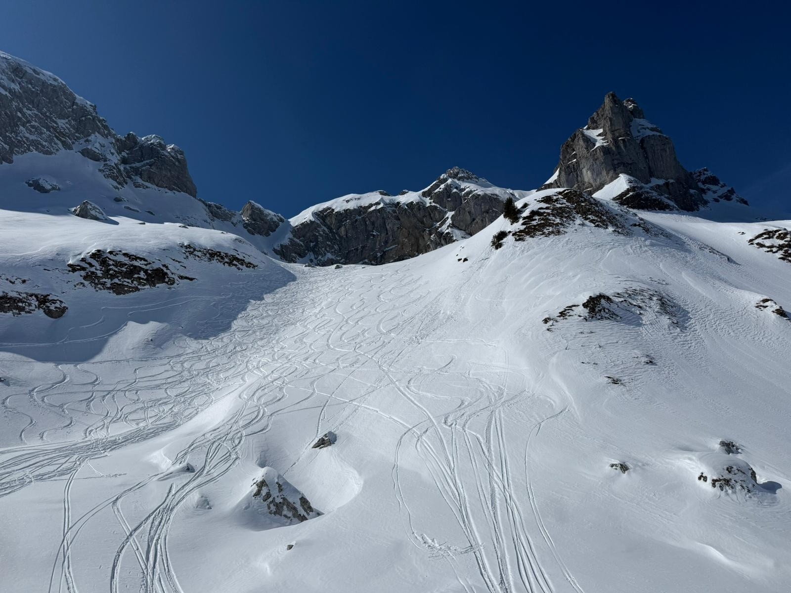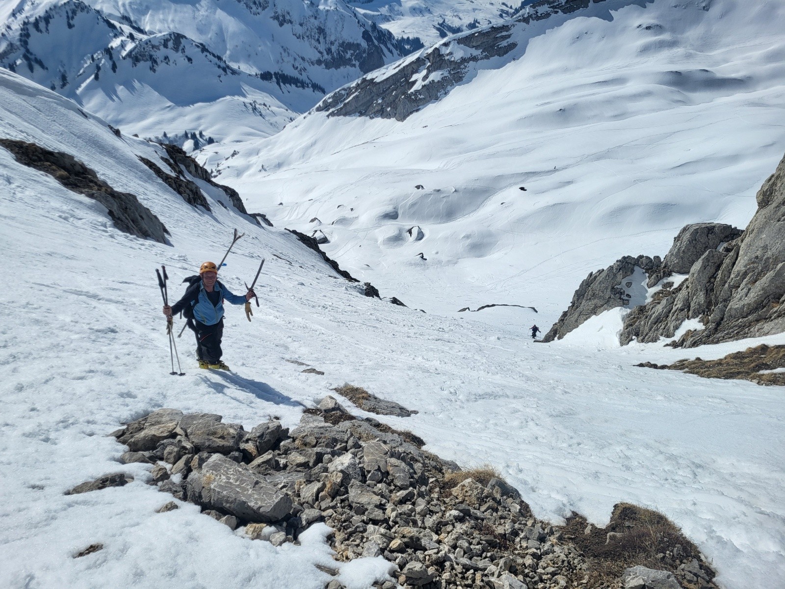 Conditions pour le ski : ça décaille rapidement au soleil pour la montée à Balafrasse. Montée au col sous la pointe du midi en neige dure, on a mis les crampons, certains sont passés à ski.