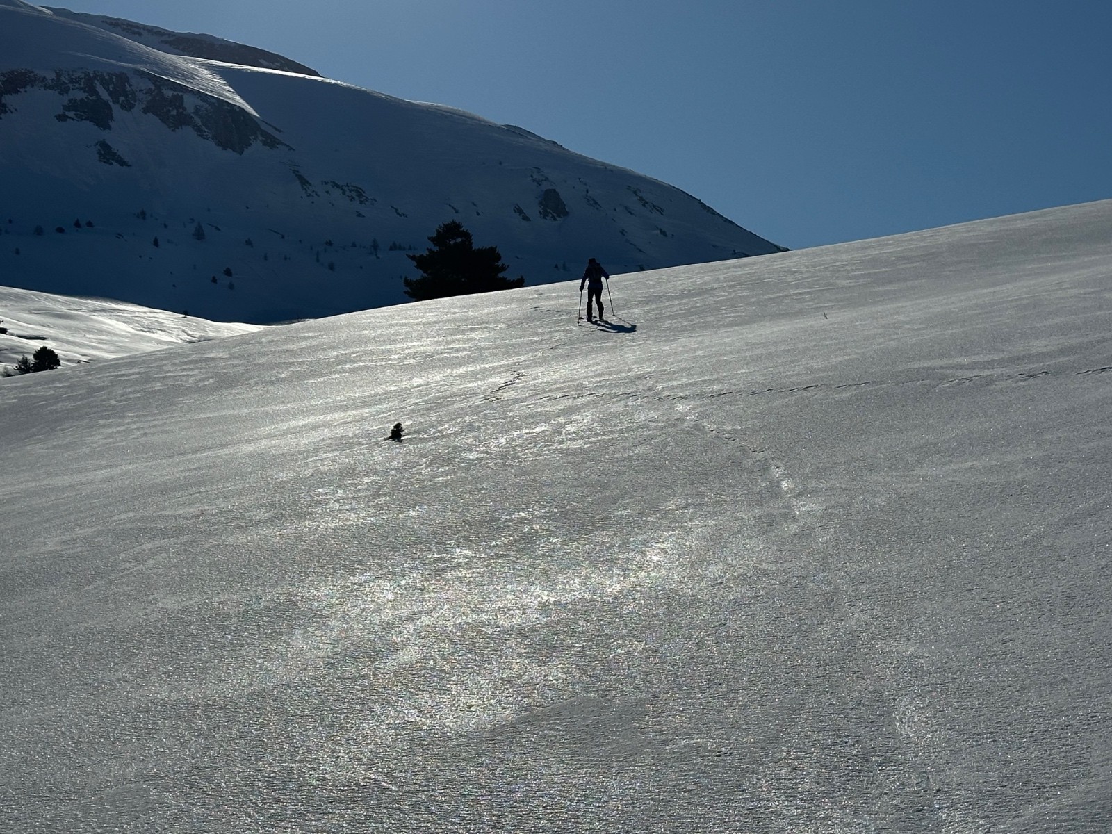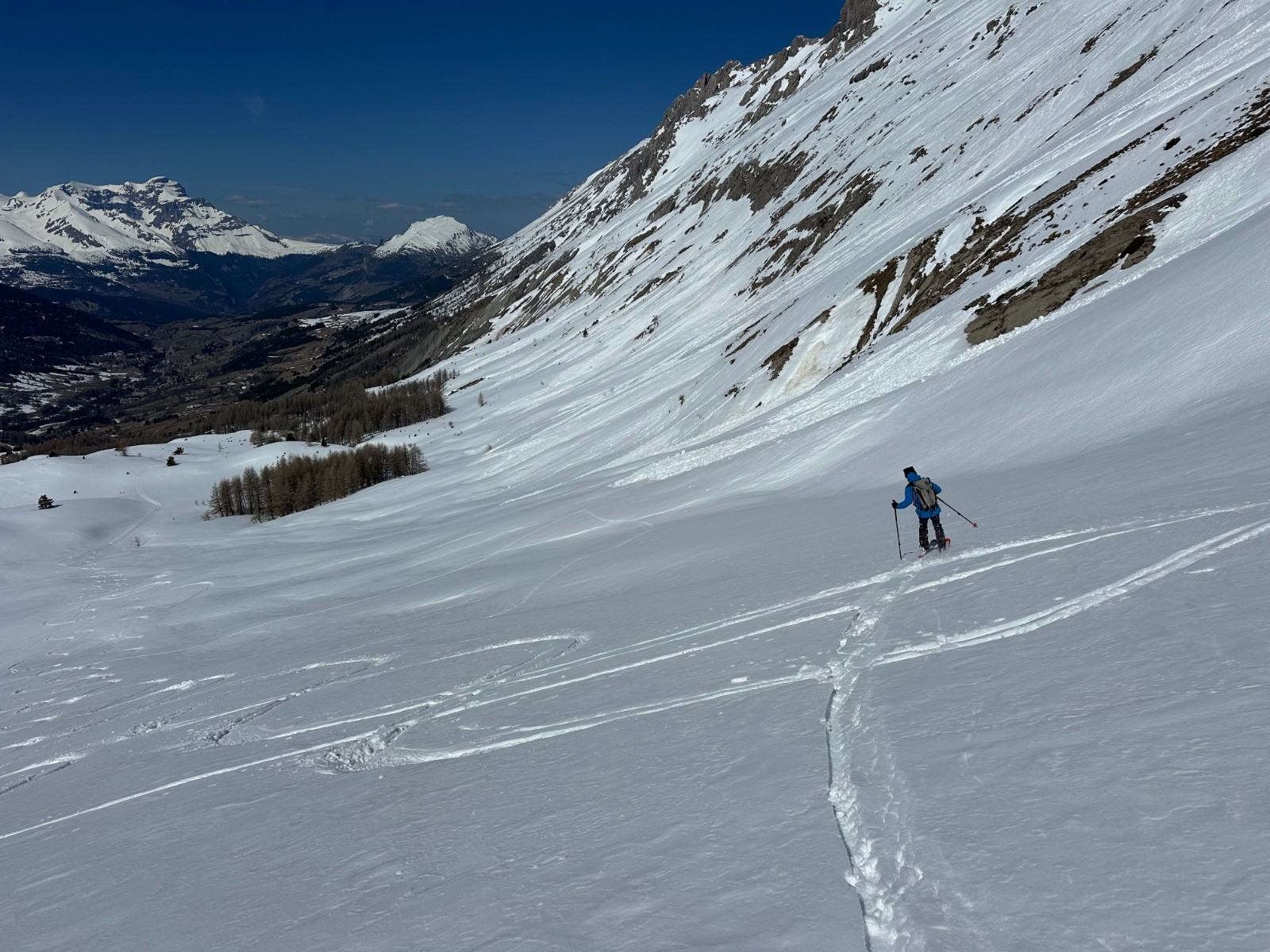 Itinéraire suivi : nous montons par l’itinéraire du Col dura ou, puis sommet de Grande Combe, Raz de Bec et pointe 2432m. La montée est un régal, belle lumière, bon grip dans les parties plus raides. Le parcours de la crête, entre Dévoluy et Chaudun est un grand moment. Paysage somptueux, découvrant les Écrins, le Champsaur, le massif du Vieux Chaillol, le Drac impétueux, la montagne de Lure, au nord, un bout de Vercors… nous redescendons en boucle par la Grande Combe, magnifique malgré la neige souvent croutée, puis ravin de Loupon et en suivant plus ou moins le Clôt du Goutay, en déchaussant brièvement deux fois, nous aboutissons dans une neige impeccable au Pont du Villard et de là, remontons à la voiture en quelques minutes.