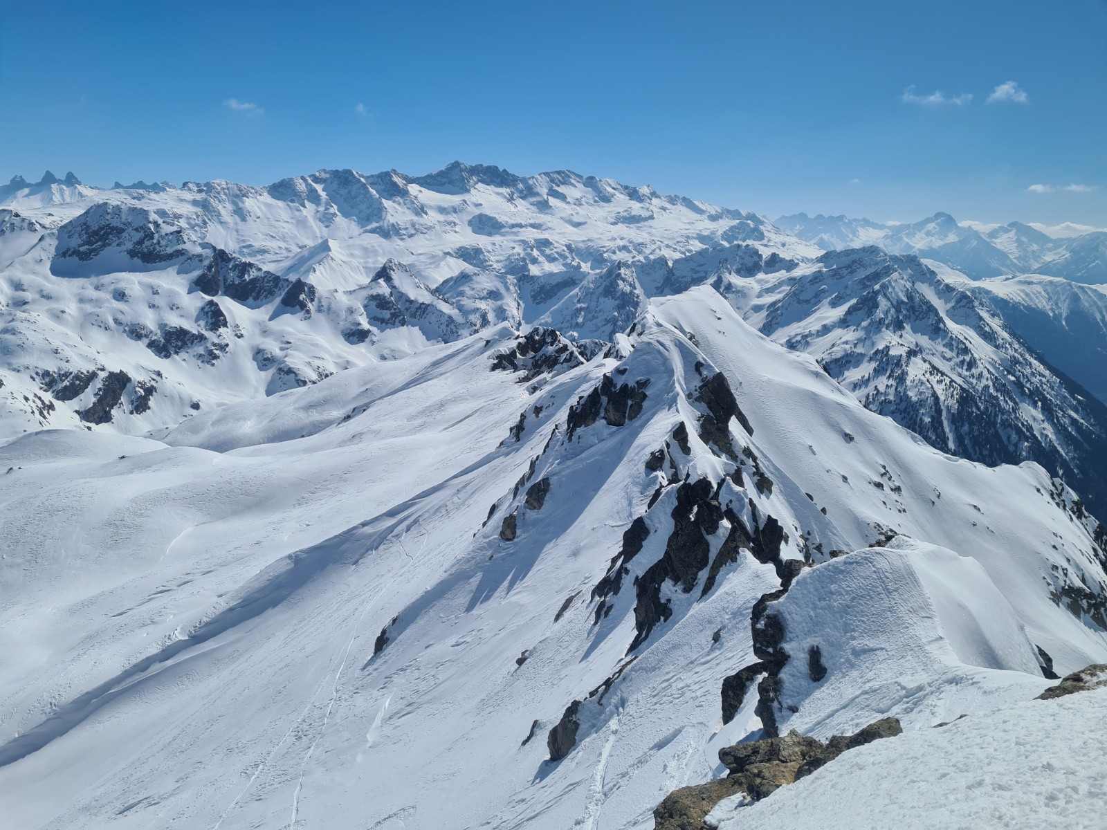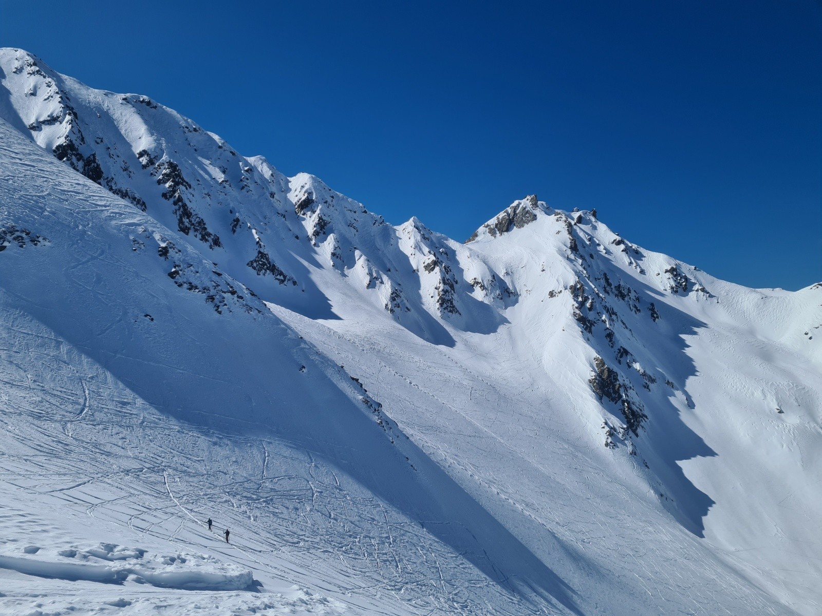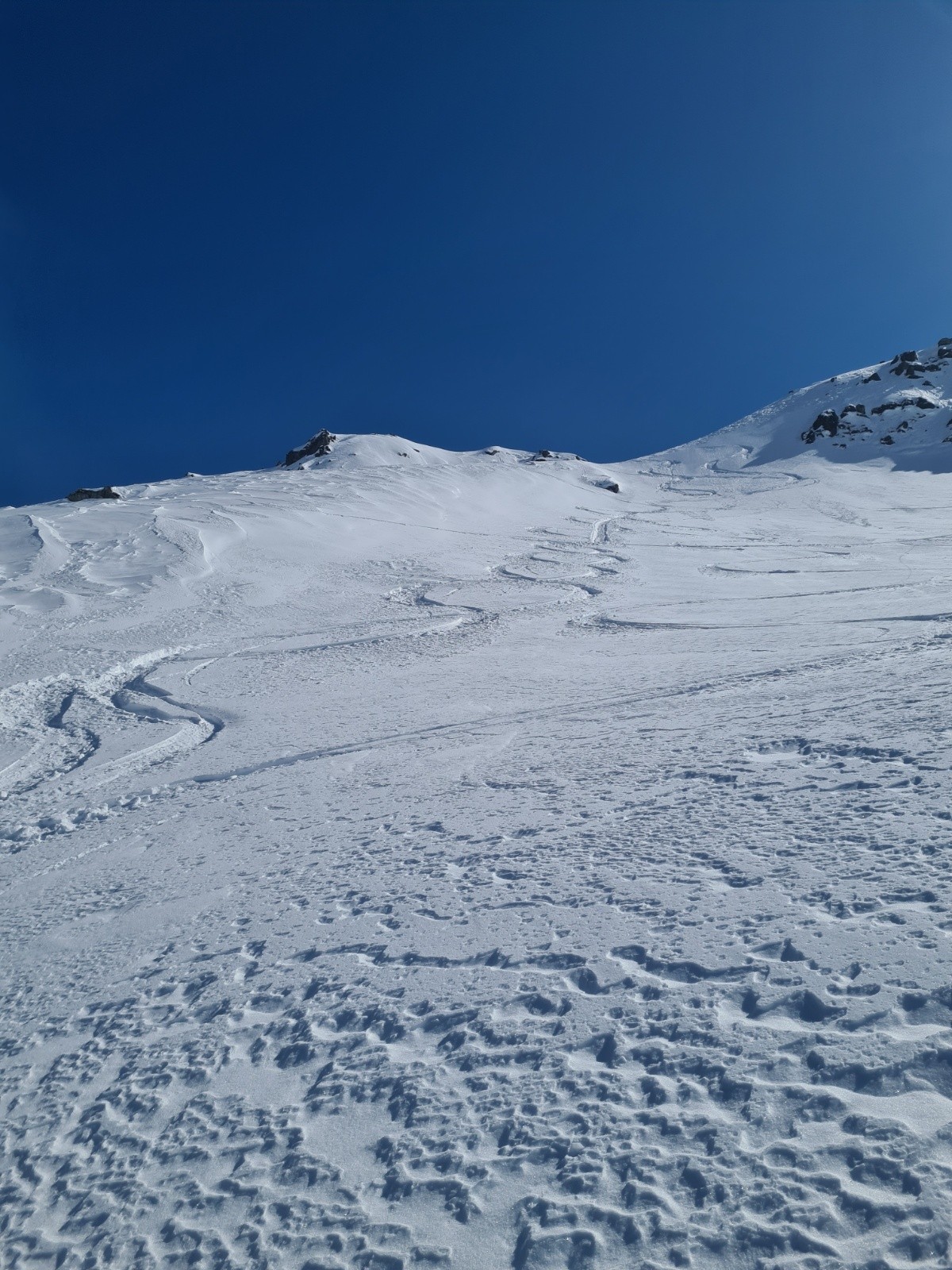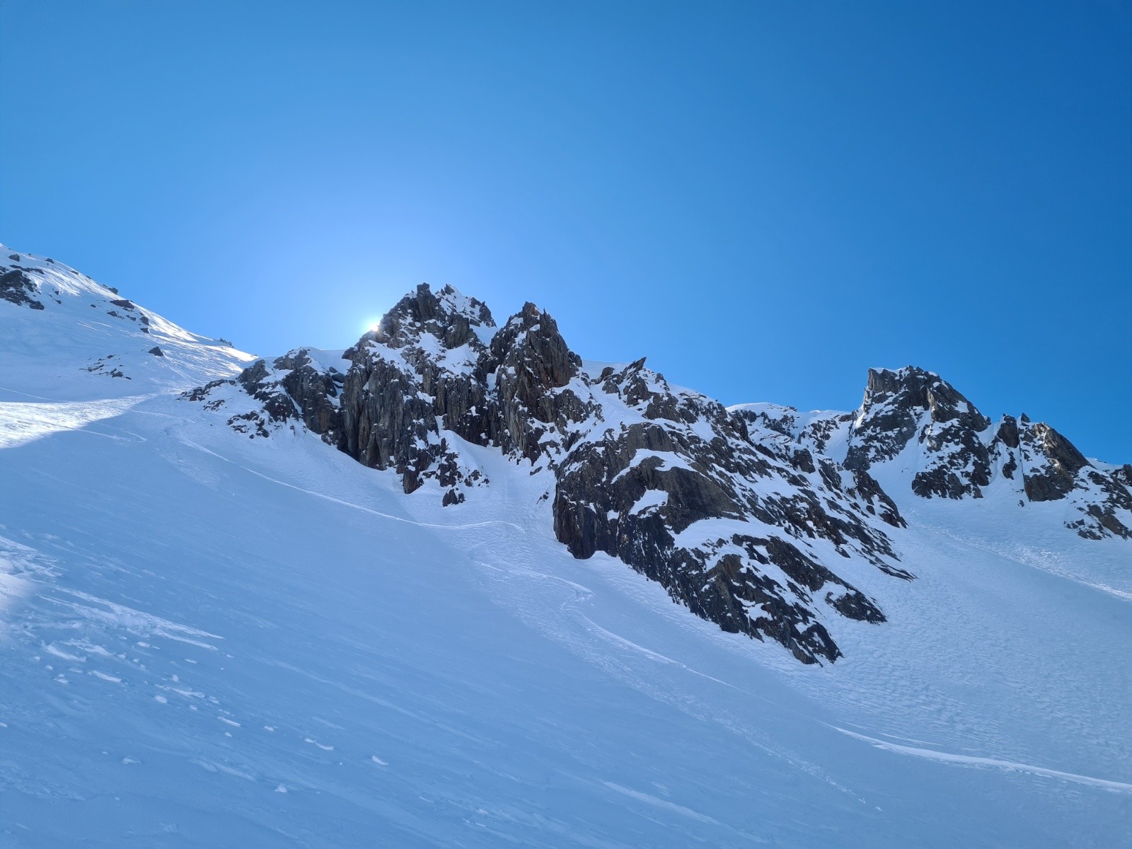 Poursuite par les pentes nord-ouest (35°) de la Belle Étoile et sortie au petit col juste au nord du sommet (corniches bien présentes et seul passage technique)