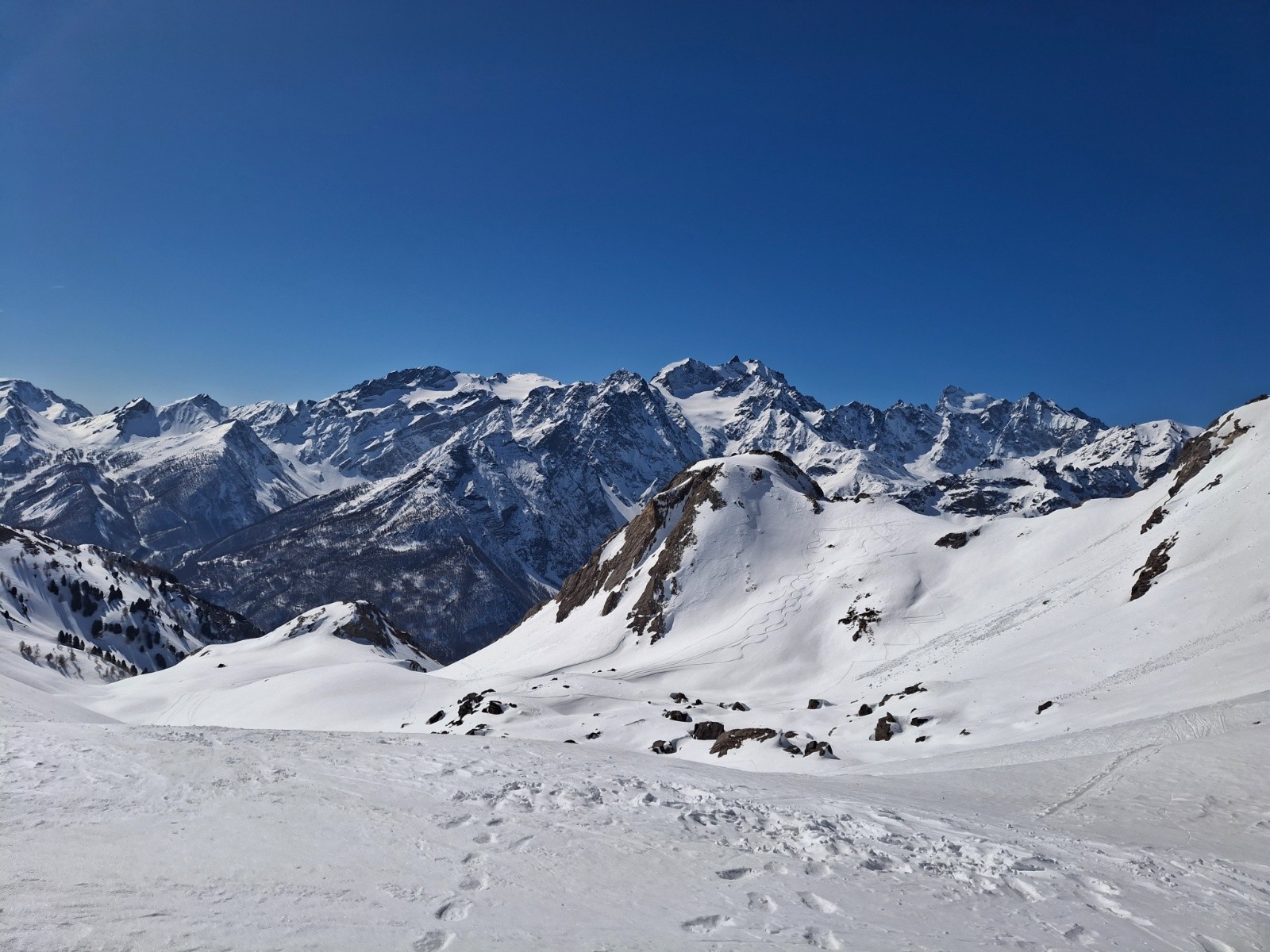 Départ avec Agnès à 9h du Lauzet et montée tranquille sans personne jusqu’à la crête du Chardonnet. Le paysage est vraiment sympa là-haut, surtout côté des écrins (barres des écrins, les Agneaux, pic du Rif…).
