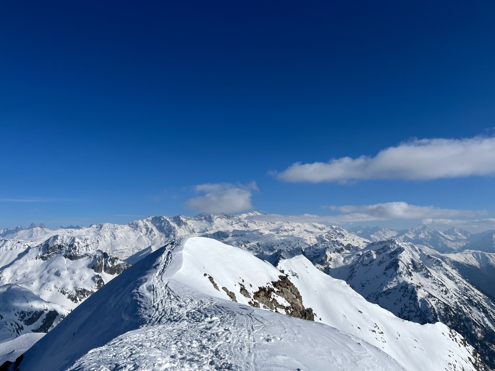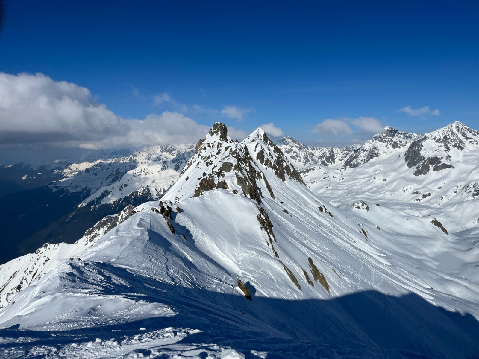 Ensuite montée par la combe du Vouteret puis sur la face Nord Ouest, qui est bien raide et finit sous une corniche. La sortie sur la crête est spectaculaire, avec les lacs des 7 Laux qui apparaissent, l'Etendard, le Rocher Blanc, la Pyramide etc. Du à la fatigue (et l'âge...) et à des problèmes de fixation et de glace sur les peaux (ça bottait tout du long et il fallait s'arrêter toutes les 30 mins), je perds beaucoup de temps dans la montée. Du coup je me retrouve le dernier à descendre, seul, à 17H, et mon téléphone tombe en panne de batterie... Faudra pas se casser une jambe dans la descente.