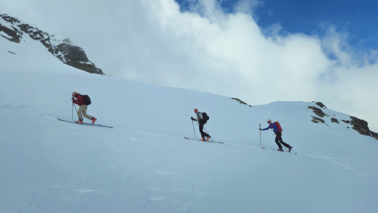 Après une courte traversée sous le point 2688, on arrive enfin sous le sommet et l'ambiance est instantanément... croutée...Une croute de 1ière catégorie s'est formée - sans doute à cause du nuage bien installé sur le sommet... On monte quand même, pour remplir l'objectif de chacun (1600m pour moi, altitude 2800m pour d'autres) mais à chaque pas je me dis que je vais bien souffrir à la descente.