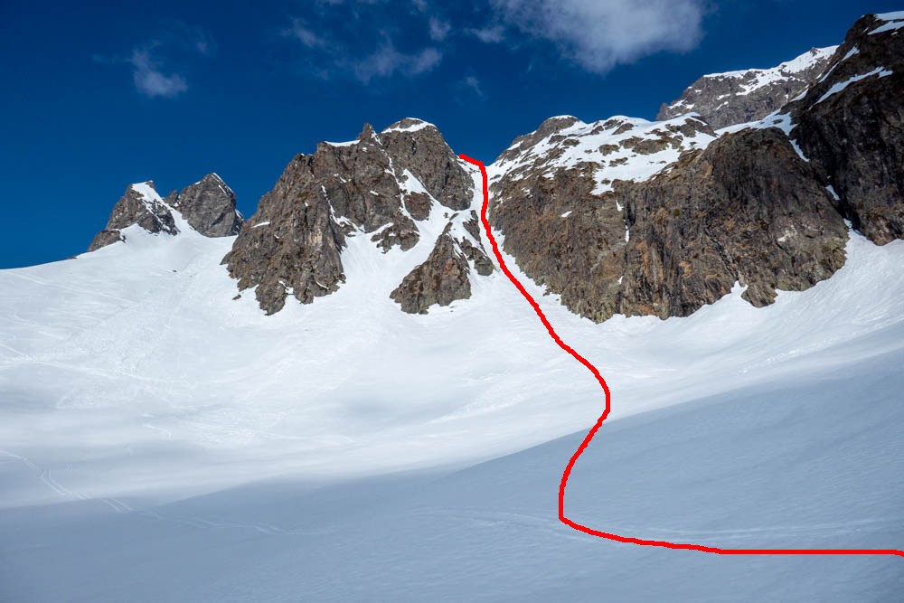Bon finalement, ca se dégage bien mais j'arrive quand même un peu en retard au sommet du bouzin par rapport au planning prévu ca sera 11h au lieu de 10...De toute facon, la moquette espérée dans le couloir n'existe pas : pourrie sur épais en rive gauche, petite coulée en rive droite avec une petite molle de 10cm sur fond bien portant, ca grimpe presque aisément mais il fait chaud et y a personne pour relayer; C'est fatiguant le ski finalement sans GladEMBont pour tracer !