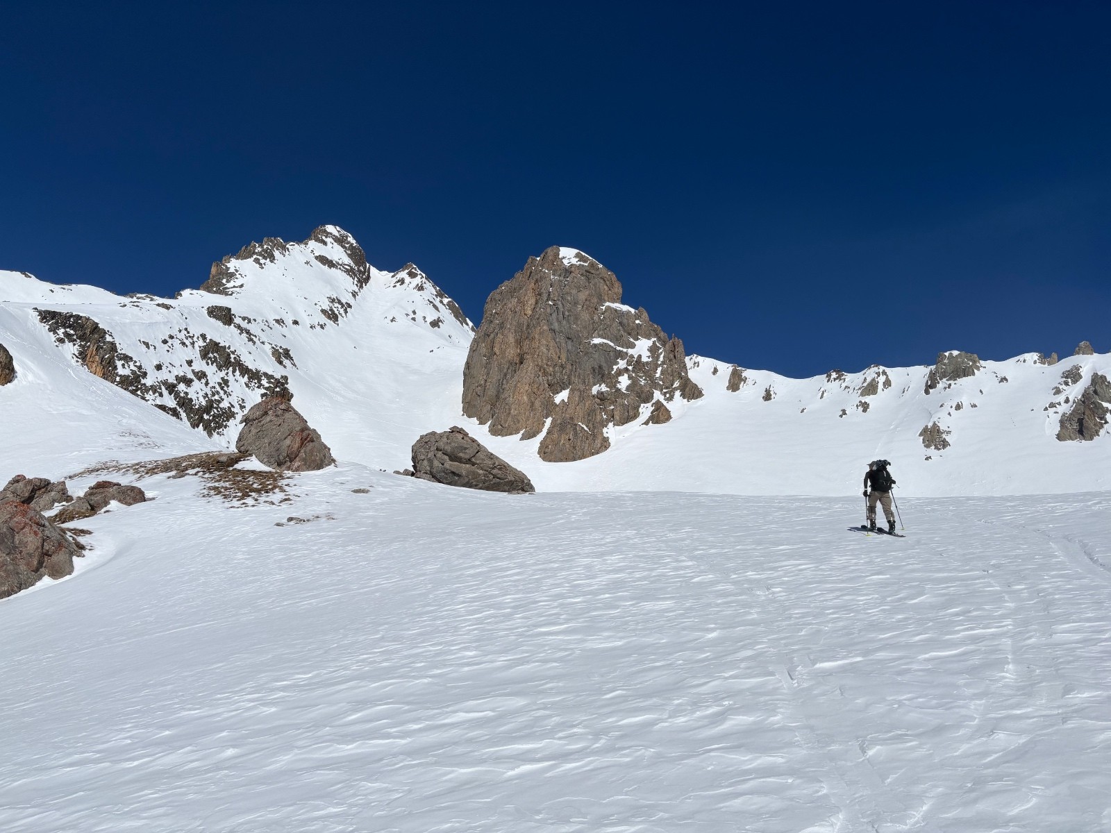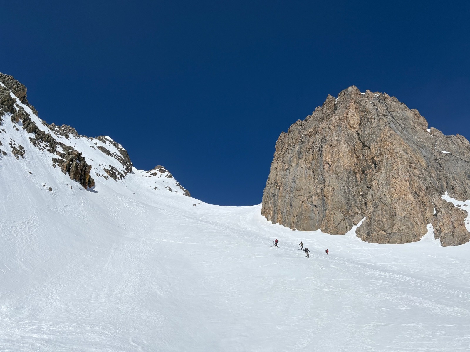 Départ du refuge du Clot des Vaches. Bon regel nocturne sur une neige en cours de transformation, pas encore totalement transformée. Neige compliquée à la descente, un peu imprévisible entre croute et décaillée..Il faudrait attendre qlq jours de fonte et regel pour que ce soit bon.