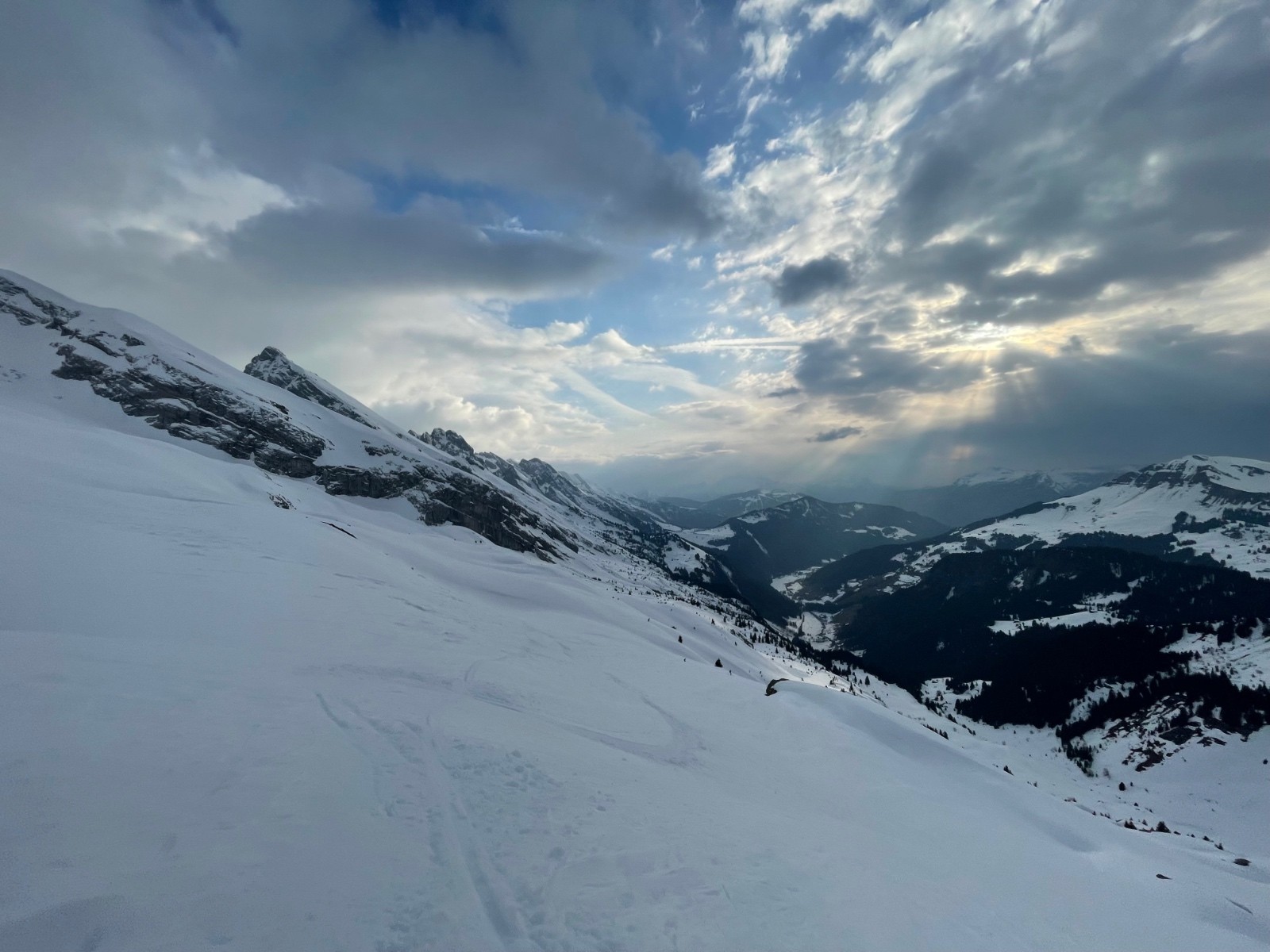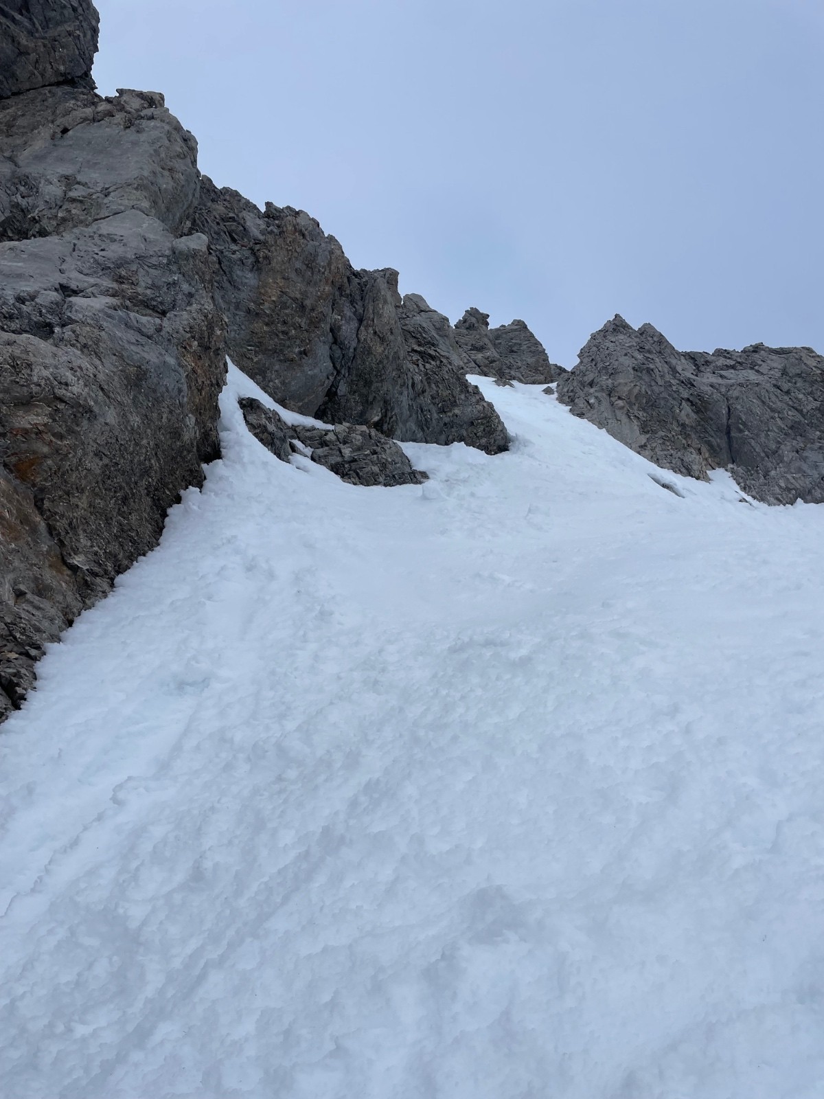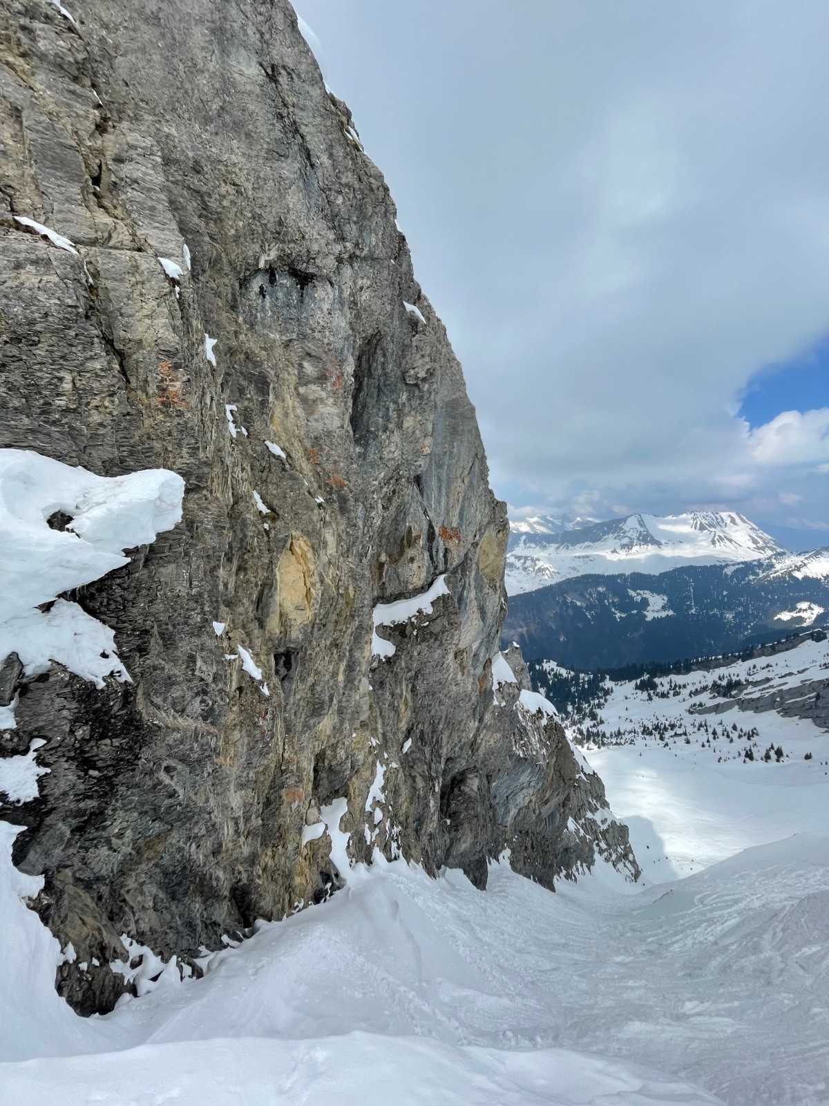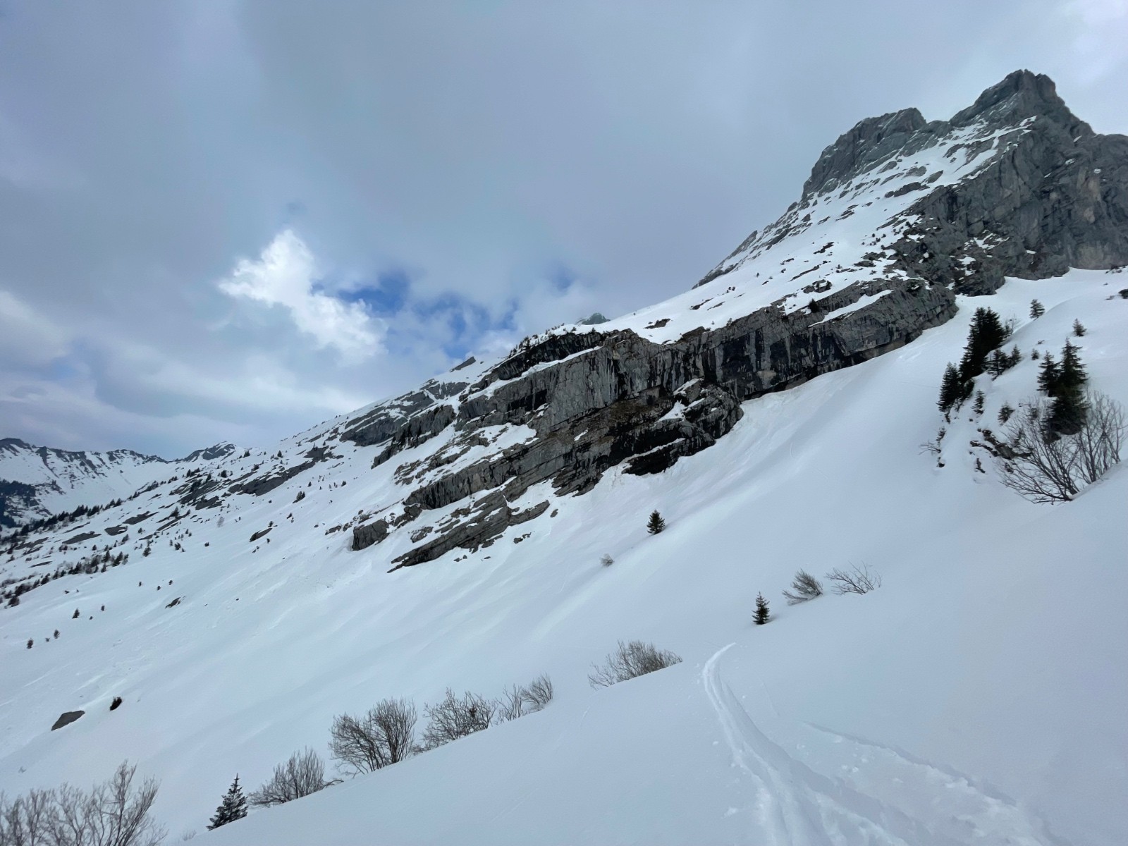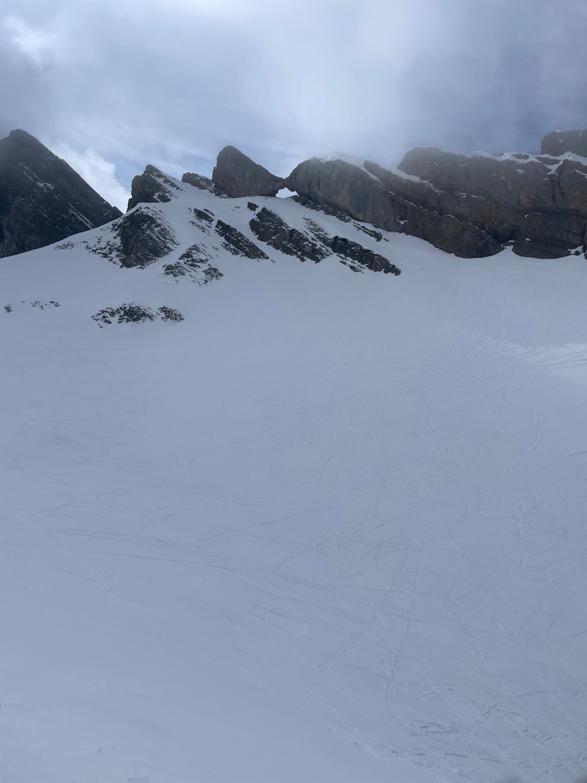 Montée Charvin glisse un peu, NE ok poudre très tassée avec traces irrégulières. Grosse baleine à gauche, on passe à droite, jamais fait.