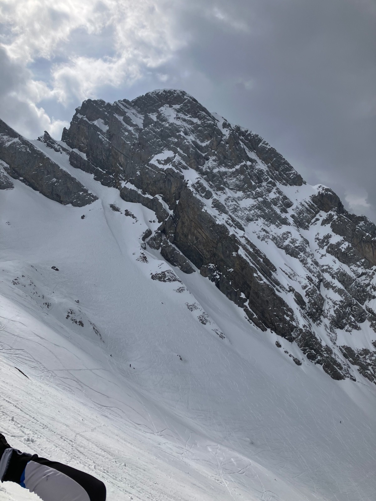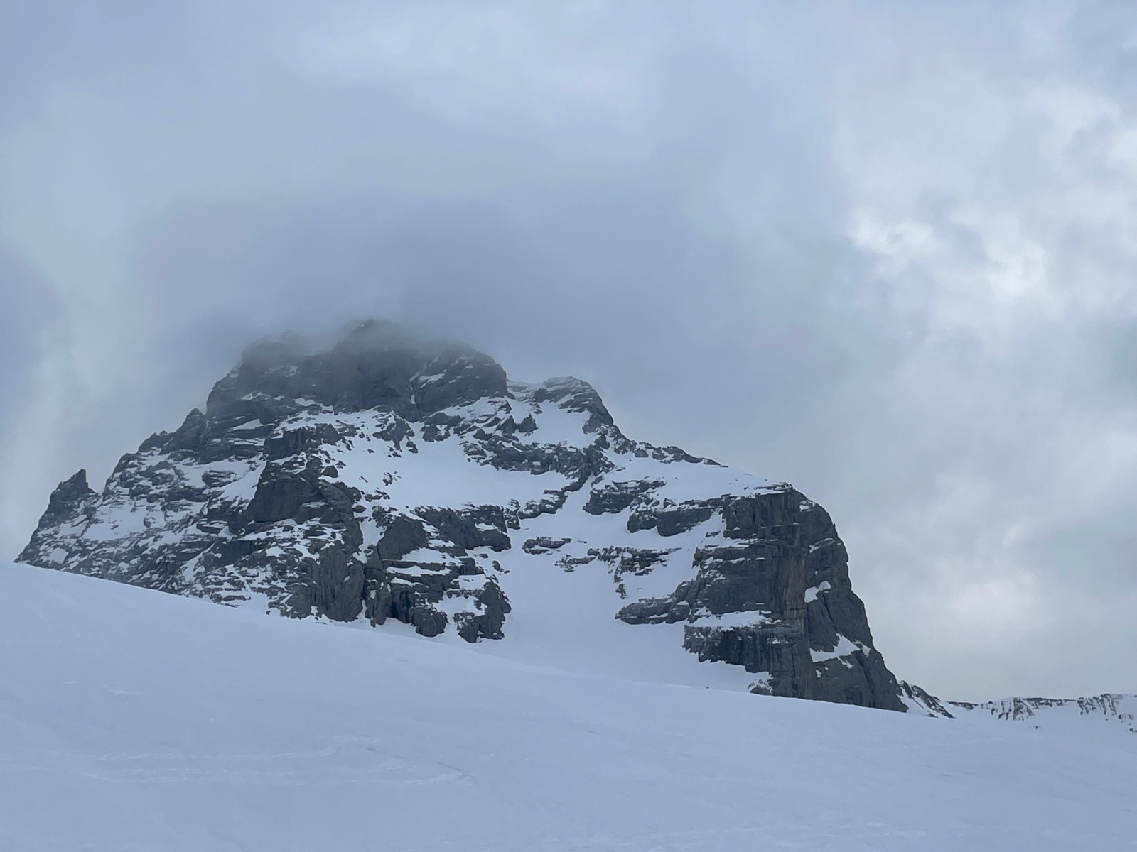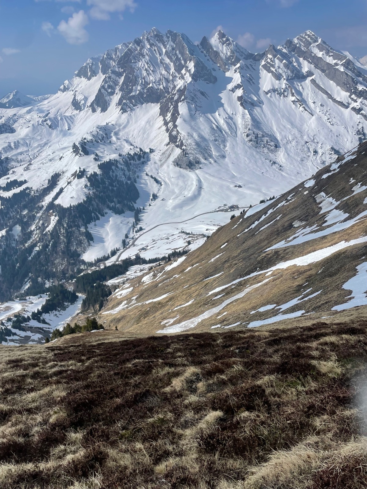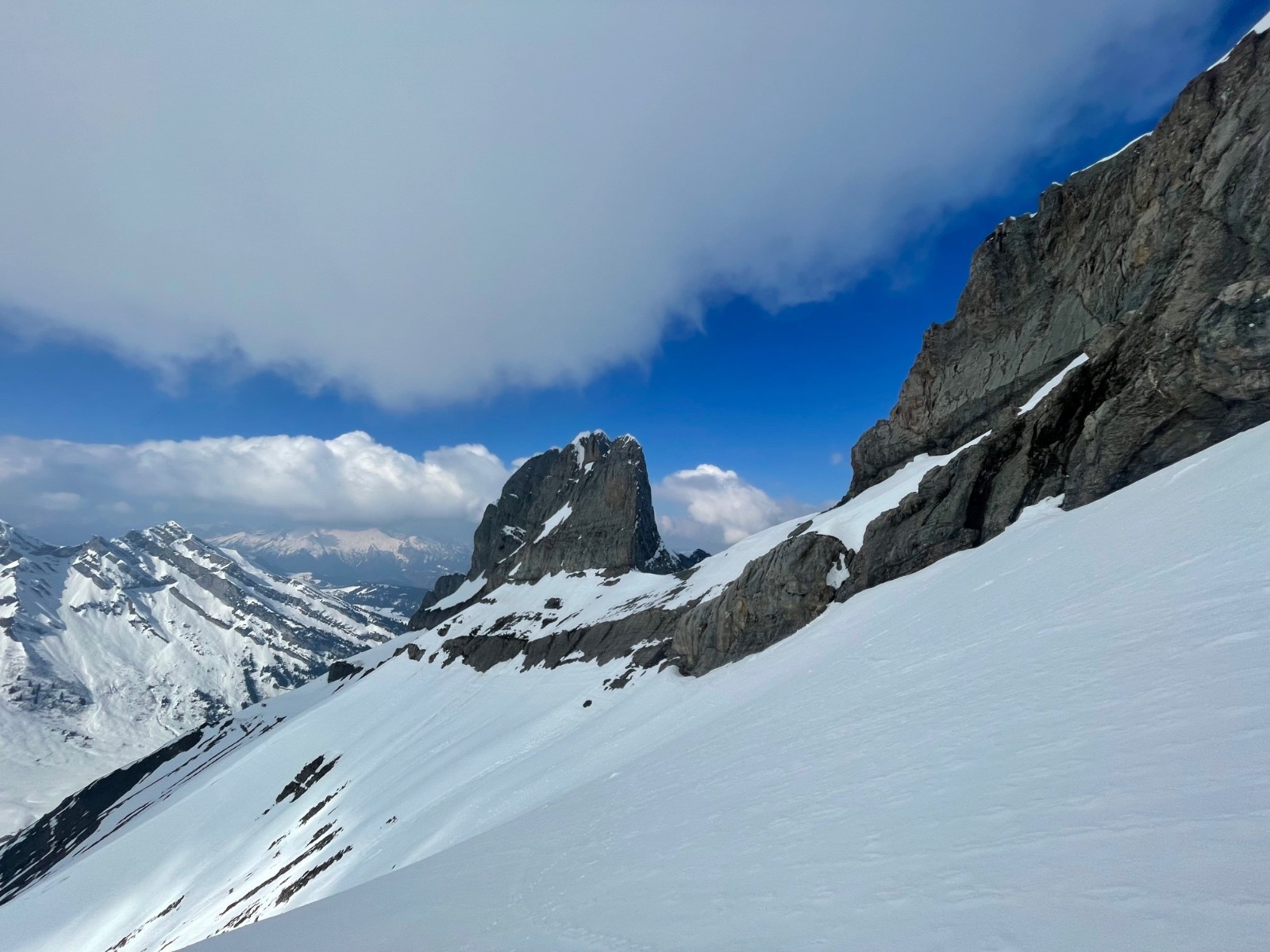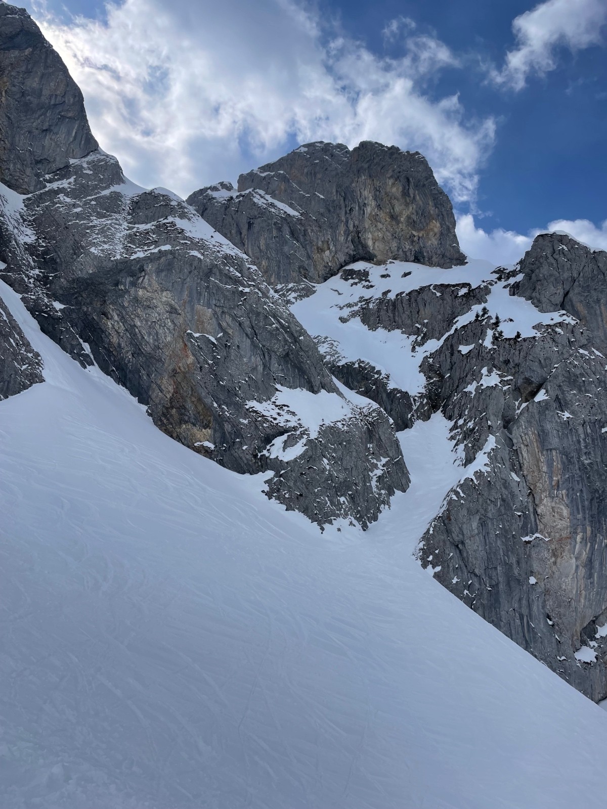 Montée Charvin glisse un peu, NE ok poudre très tassée avec traces irrégulières. Grosse baleine à gauche, on passe à droite, jamais fait.