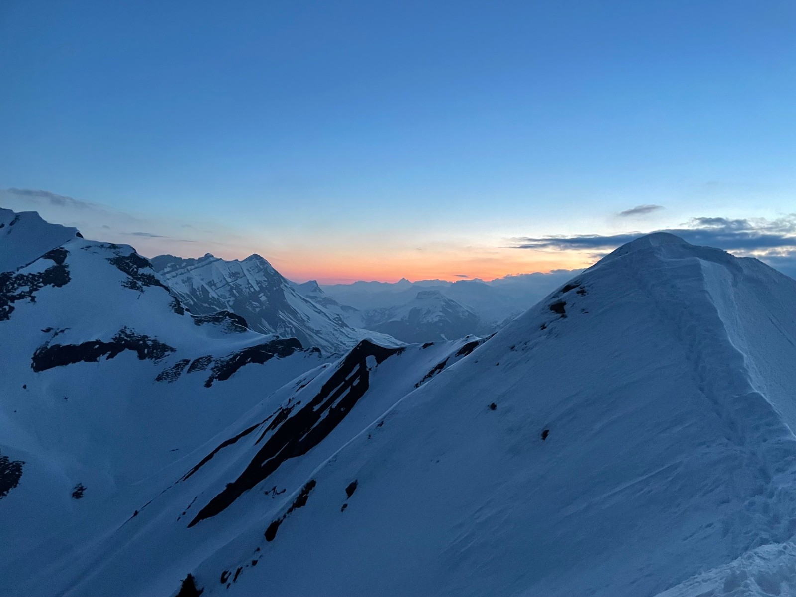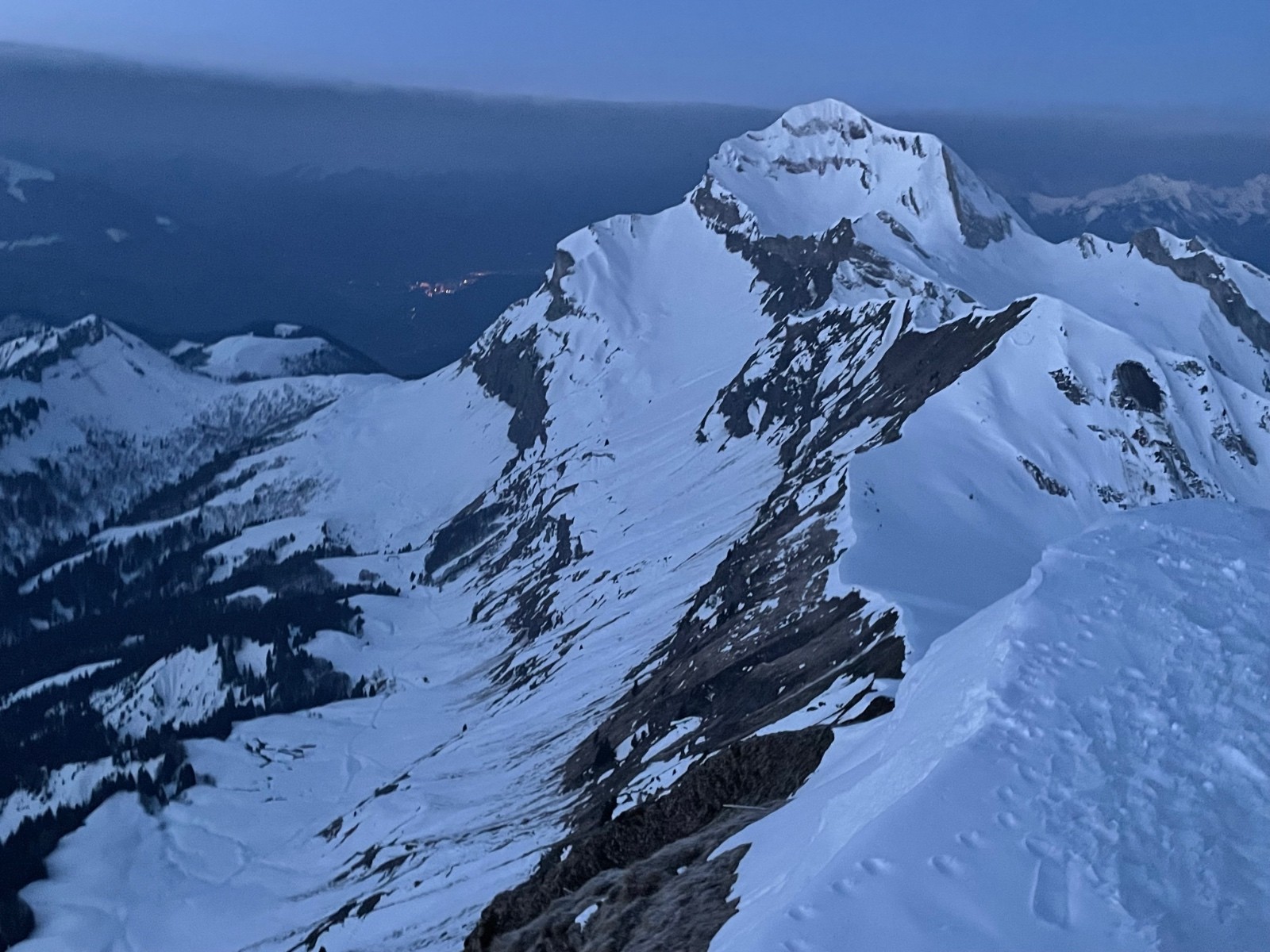 Jolie projet que Alain me propose jeudi soir, je m’incruste dans l’équipe de trois ! Nous serons donc 4 au départ pour un petit Mont Charvin de nuit… Jules et Lucas nous mènent un train d’enfer dès le début, ils ont l’entraînement de la Pierra Menta les solides! Je suis la troupe un peu à distance mais jamais trop loin, on reste ensemble pour les parties techniques. Levée du jour magnifique vers les Pointes de Mandallaz, ah ça fait du bien au moral cette belle lumière, avec ma sortie de la veille à l’Arcalod j’ai pas dans les meilleures dispositions 😅! Des descentes techniques s’ensuivent, le Combaz à l’Etale ou le couloir Chauchefoin à la Pointe Percée, mais ça se passe, toujours avec ces saletés d’allumettes 😂, qu’est-ce qu’on est mieux avec 110 au patin (ce que je n’ai pas manqué de dire tout le long ahah) on réapprend à skier avec ça!!!