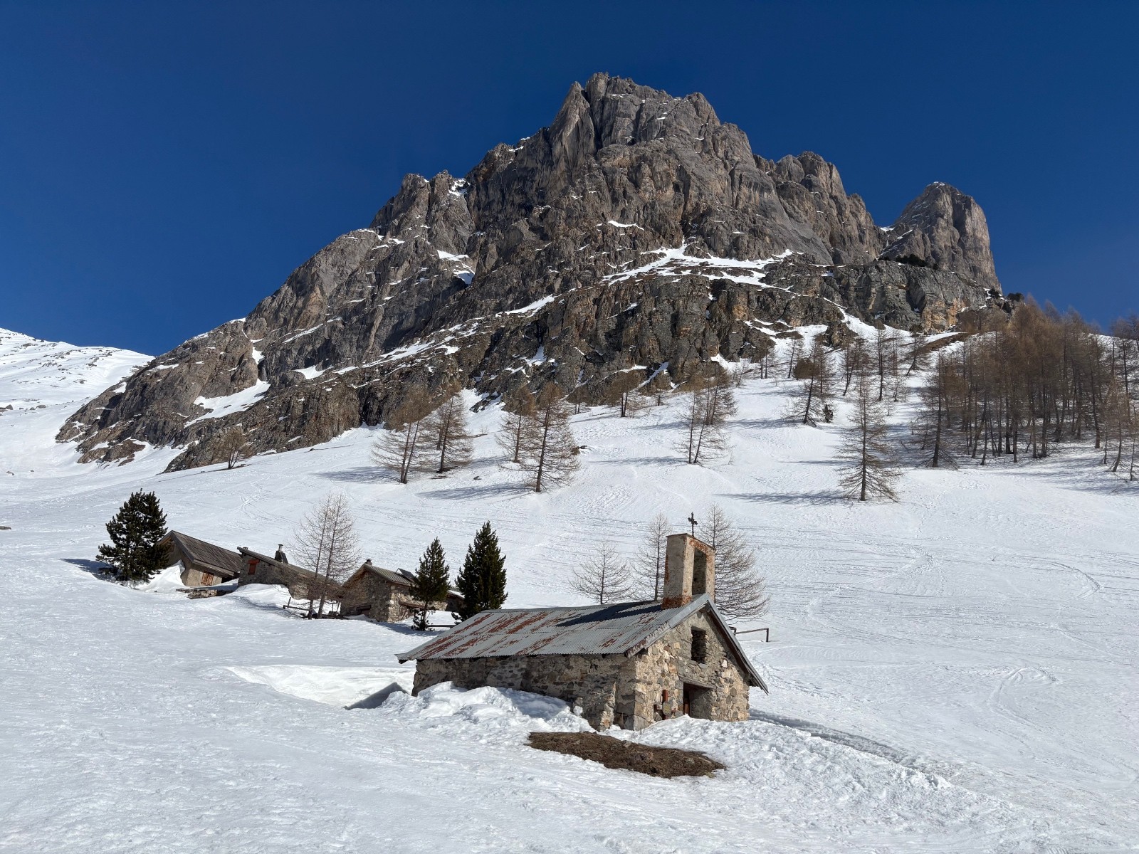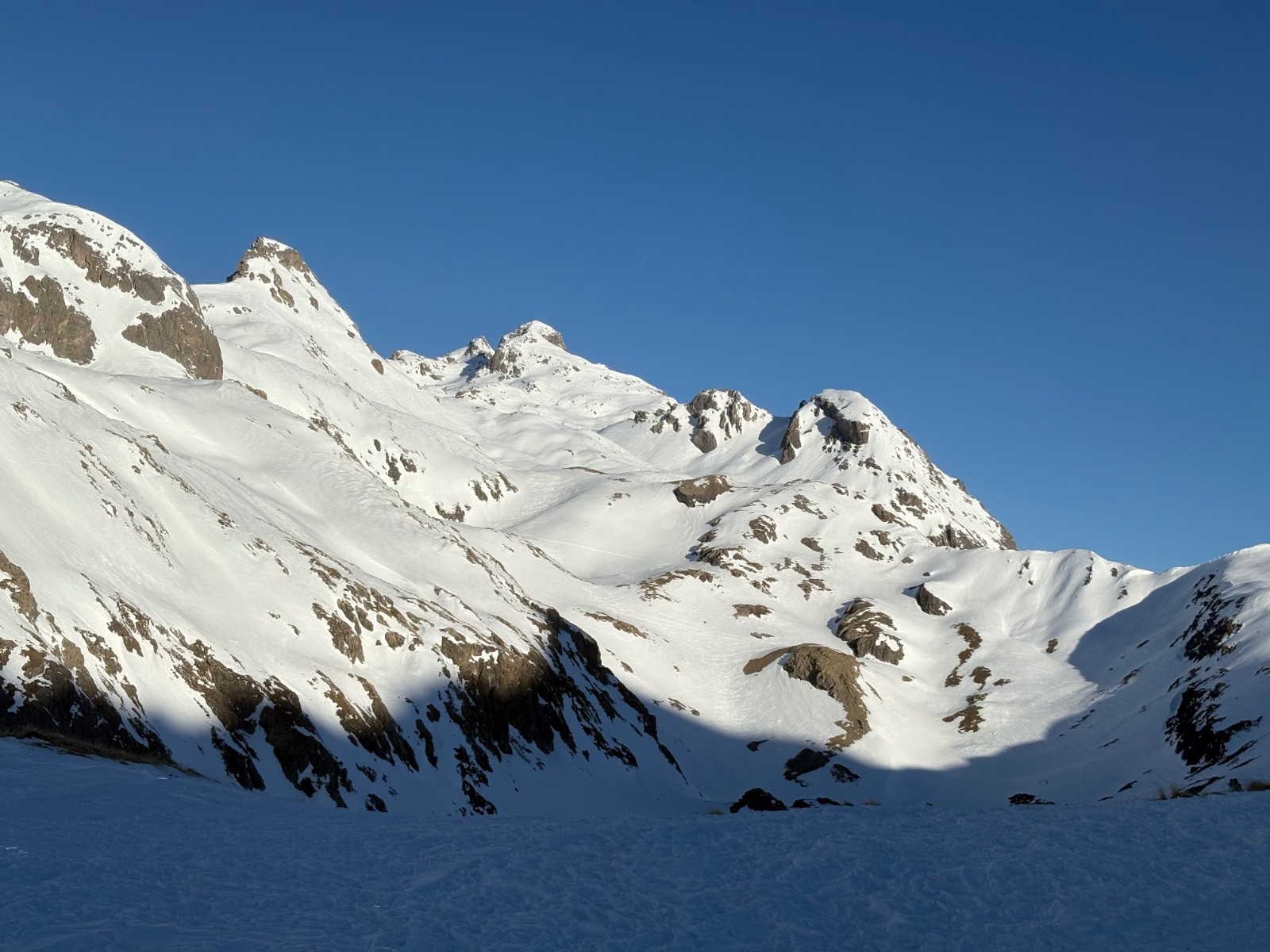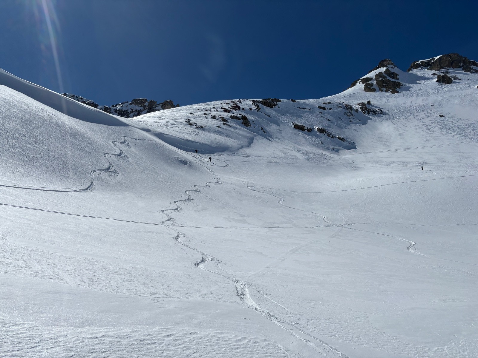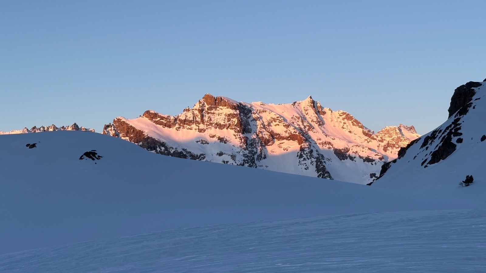 Neige gelée au matin puis dégel progressif. Pas eu besoin de couteaux. Neige délucate et imprévisible à la descente (mélange de neige mal transformée et neige durcie par le vent). Meilleur en descente après le col de Ponsonnière avec de rares endroits de poudreuse versant nord sous les crêtes, a rités du vent, et versants sud transformés en belle moquette. Neige parfaite entre refuge du Clôt des Vaches et le Pont de l’Alpe.