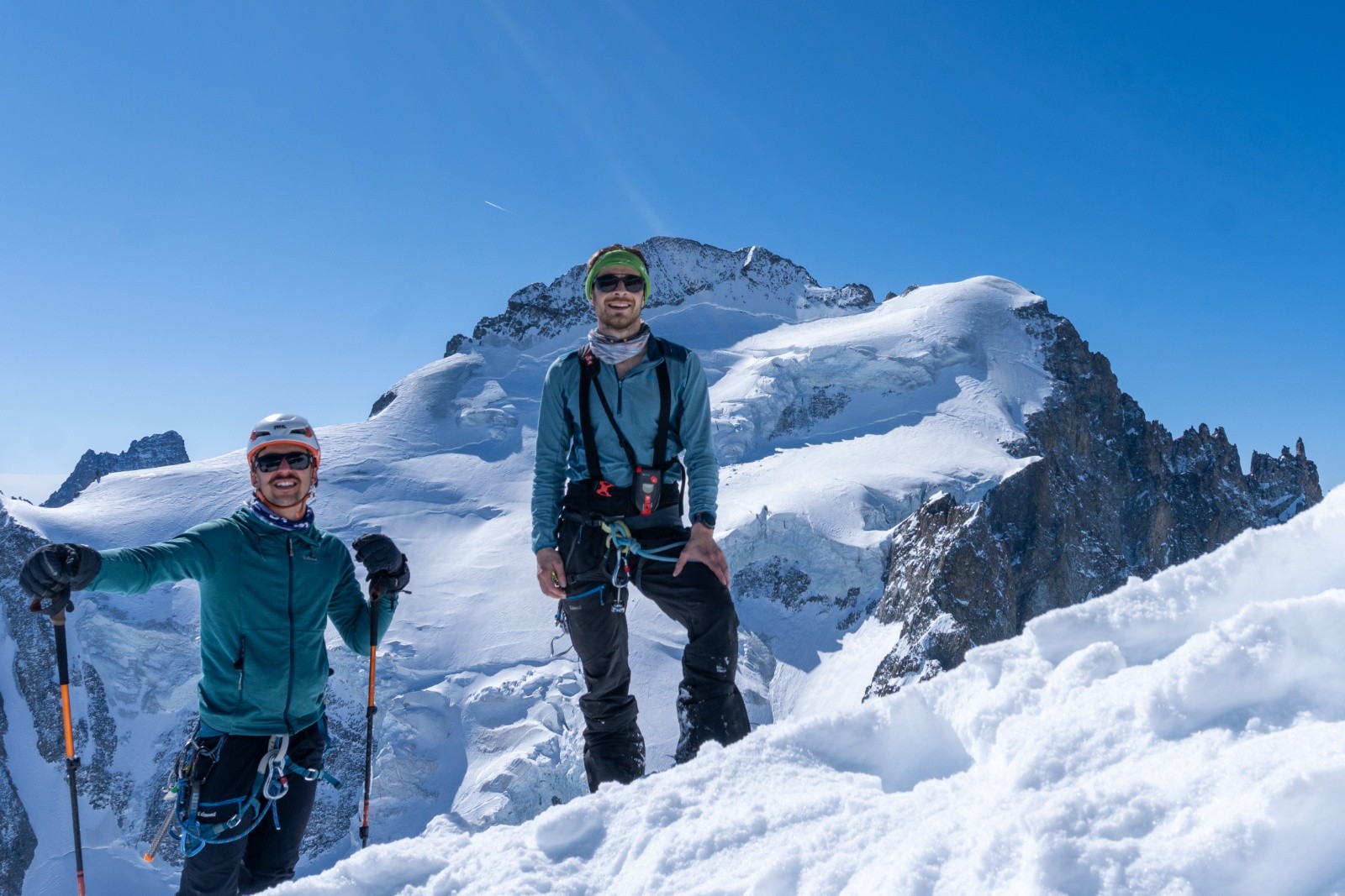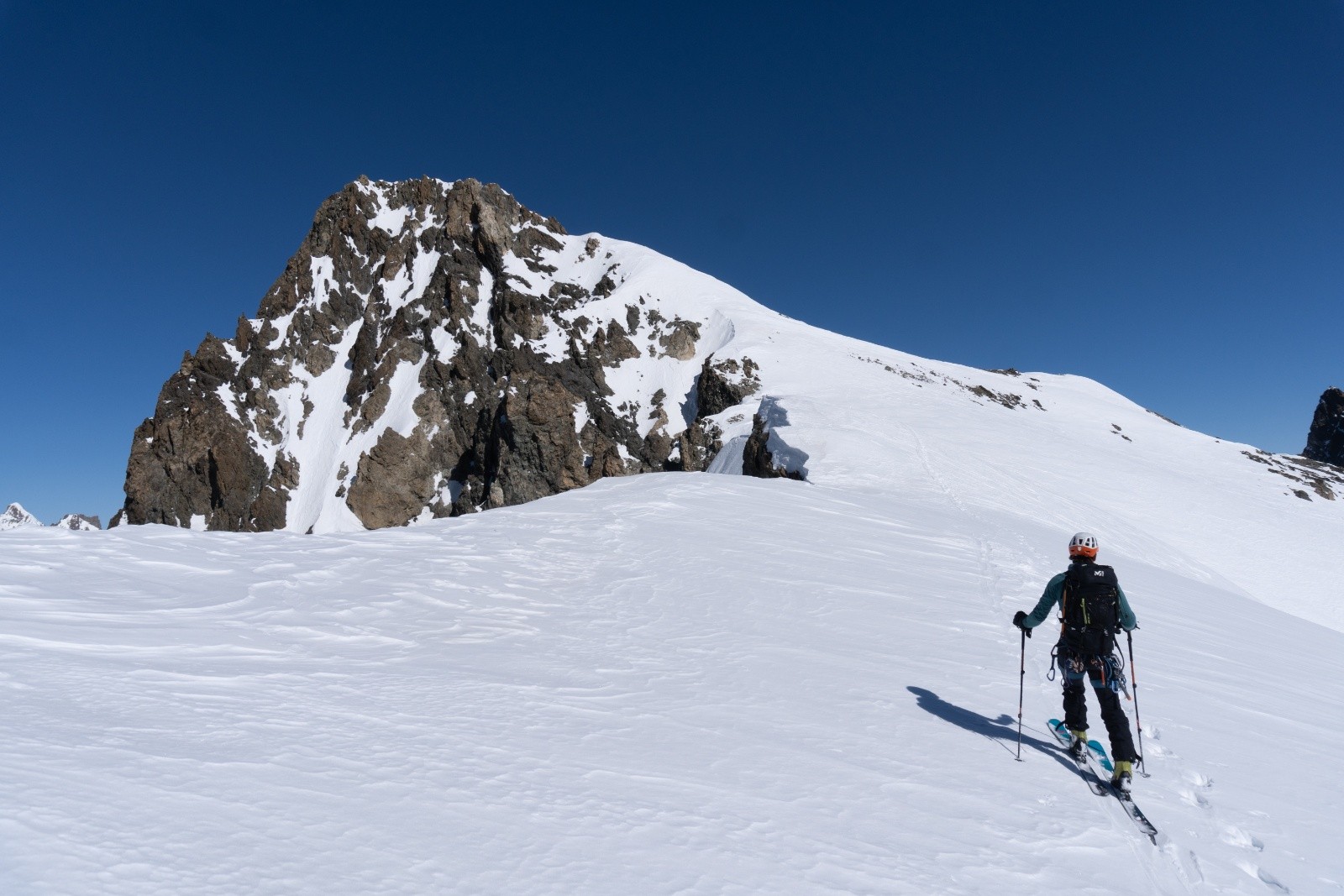 Derniers arrivés le soir, on partira aussi bon derniers des trois cordées présentes : le sommeil, c’est important. À 8h, skis aux pieds, on attaque la montée vers 9h et atteignons le sommet à 11h. Vue magnifique sur le massif. On aperçoit les skieurs redescendant du Dôme ; ils nous diront avoir bien brassé pour faire la trace.