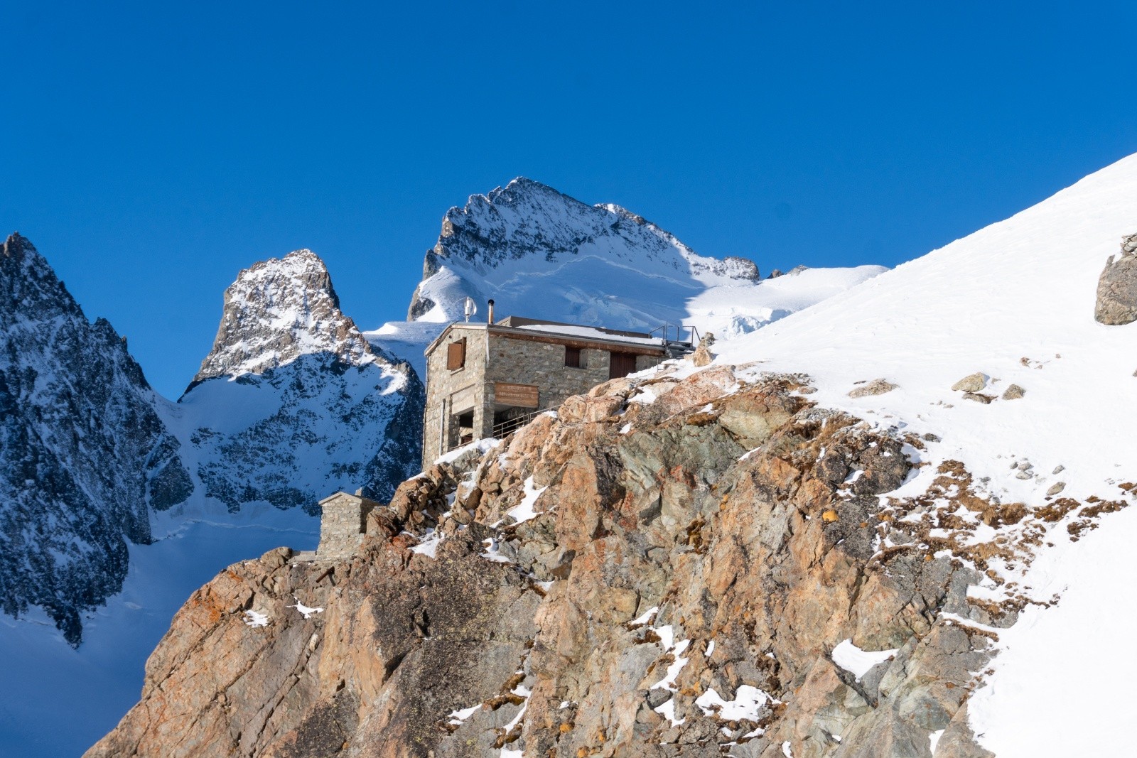 Après quelques virages, un petit raidillon demande de l’attention : pas le droit à l’erreur, sinon c’est la barre rocheuse en contrebas. On atteint enfin le refuge du Glacier Blanc. La météo est parfaite, mais l’envie d’arriver se fait sentir. Petite pause, puis on repart en prenant pied sur le glacier, bien bouché — ça change de l’été.