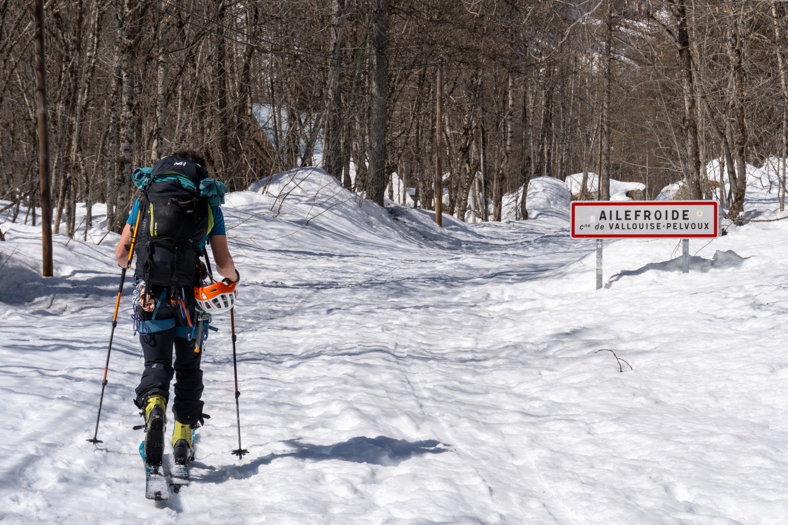 Départ à midi tapante après un pique-nique bienvenu aux Claux, juste avant le tunnel (1265 m). On savait que la route était fermée et que cette première journée serait une bonne bavante… peut-être pas à ce point. En voiture, c’est rapide ; à ski, ça prend son temps. Heureusement, on peut chausser dès le parking — une chance, au vu de la température ca ne va pas durer.