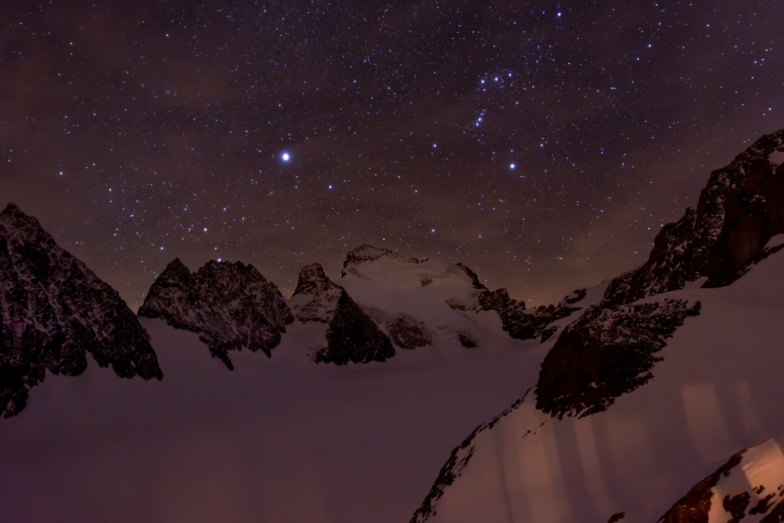 On arrive au coucher du soleil à l’aplomb du refuge. Encore un effort, et on atteint le refuge à 19h, sans même sortir la frontale. Bien accueilli par la gardienne, on s'enfile un repas salvateur. Quelques photos des étoiles, puis réflexion sur les plans du lendemain, et au dodo. Roche Faurio est déjà tracé, le Dôme pas encore, mais une cordée tentera l’ouverture. Après 2000 m de montée et la route depuis Grenoble, on préfère jouer la sécurité et partir sur la classique Roche Faurio.