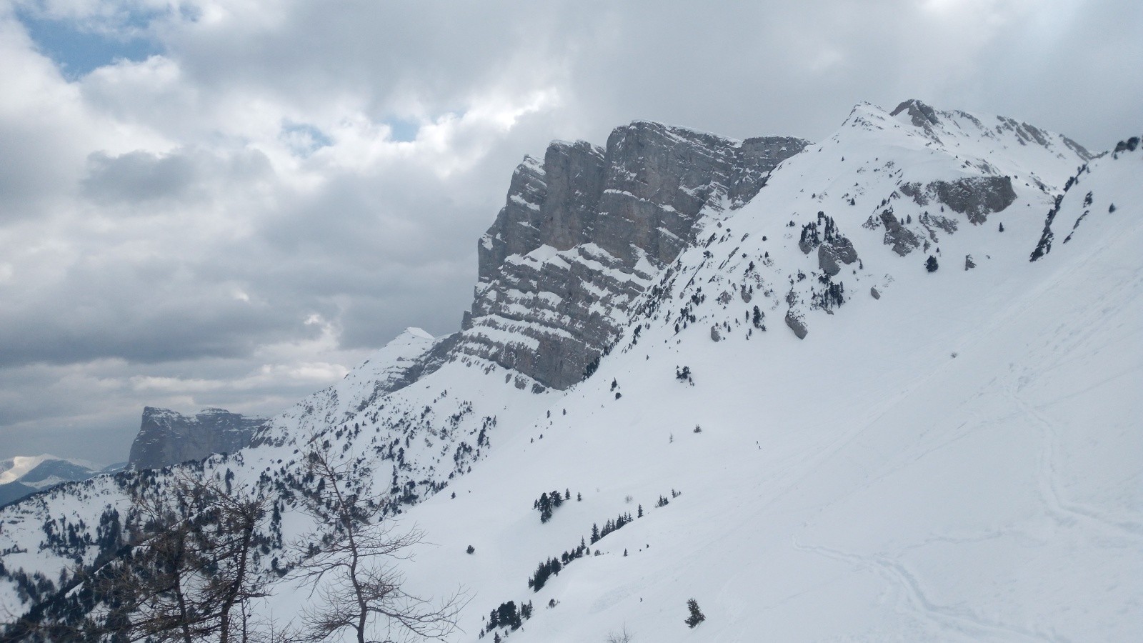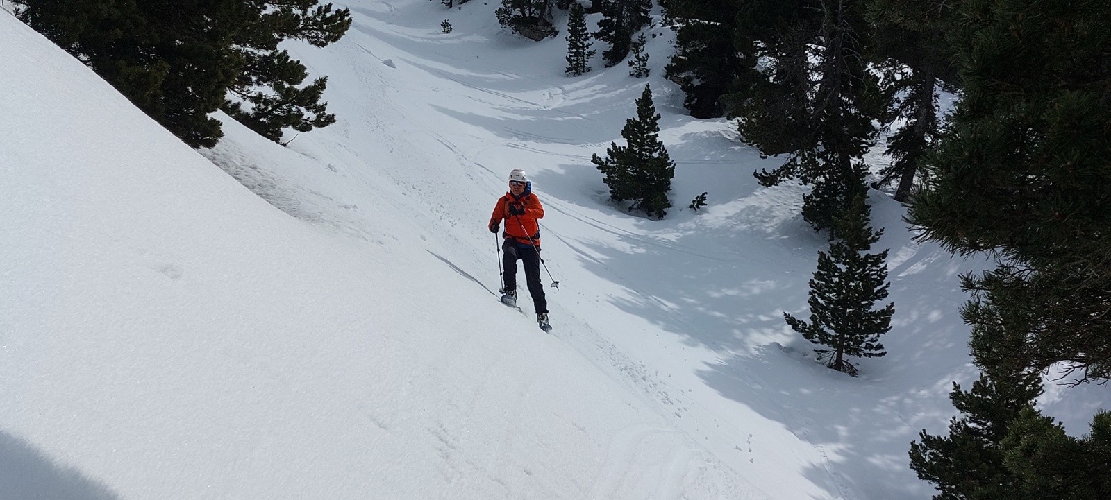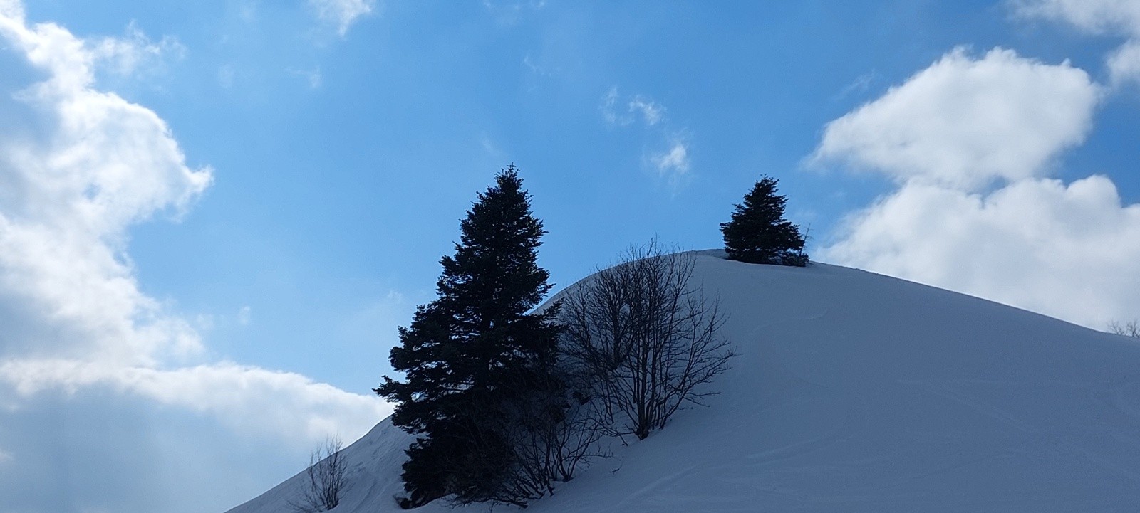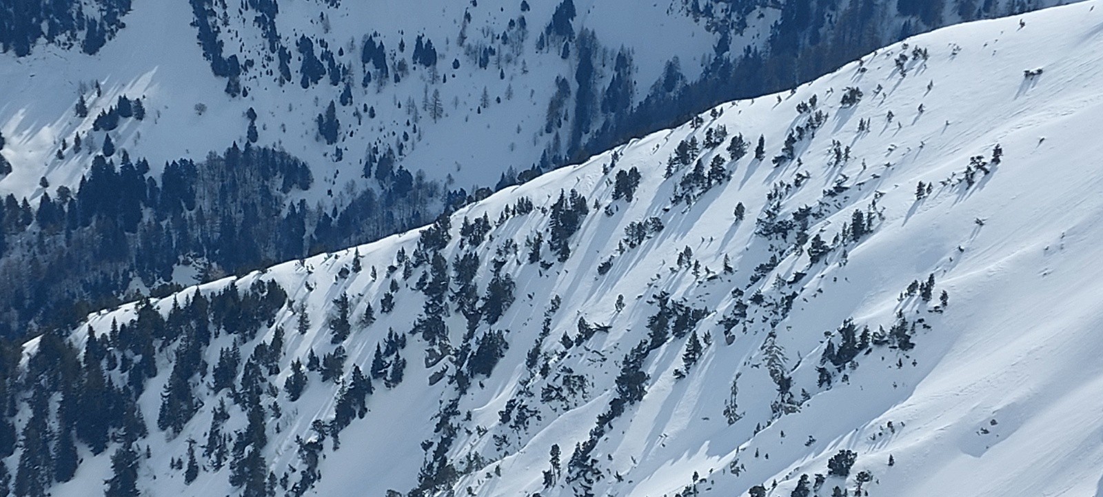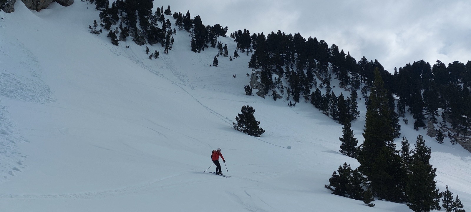 Dommage, ça n'a pas 'décaillé' comme espéré dans la face Ouest : ce ne fut pas un grand plaisir dans le haut, mais ça n'était pas 'béton' ou 'carton', et l'accroche bien rassurante. Mais la suite de la descente Ouest (2de partie grosso modo) fut bien appréciable, entre 'petite moquette', zone poudreuse, petite combe transformée dans la forêt,...