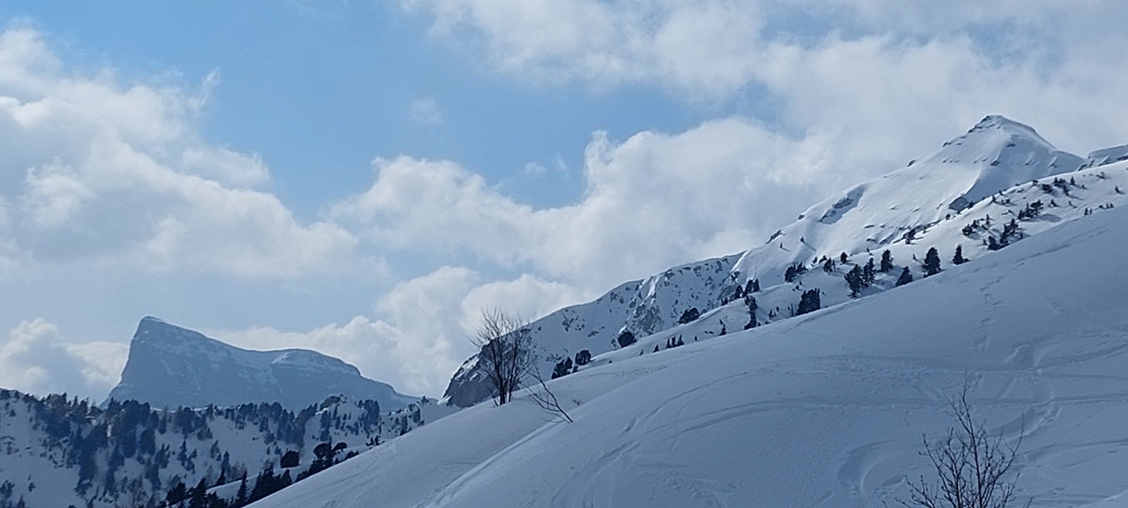 - neige ramollie assez plaisante et facile à skier (un peu collante par moments), dans le haut du versant Est du Pas de la Ville, puis vers/sur les pistes de Gresse