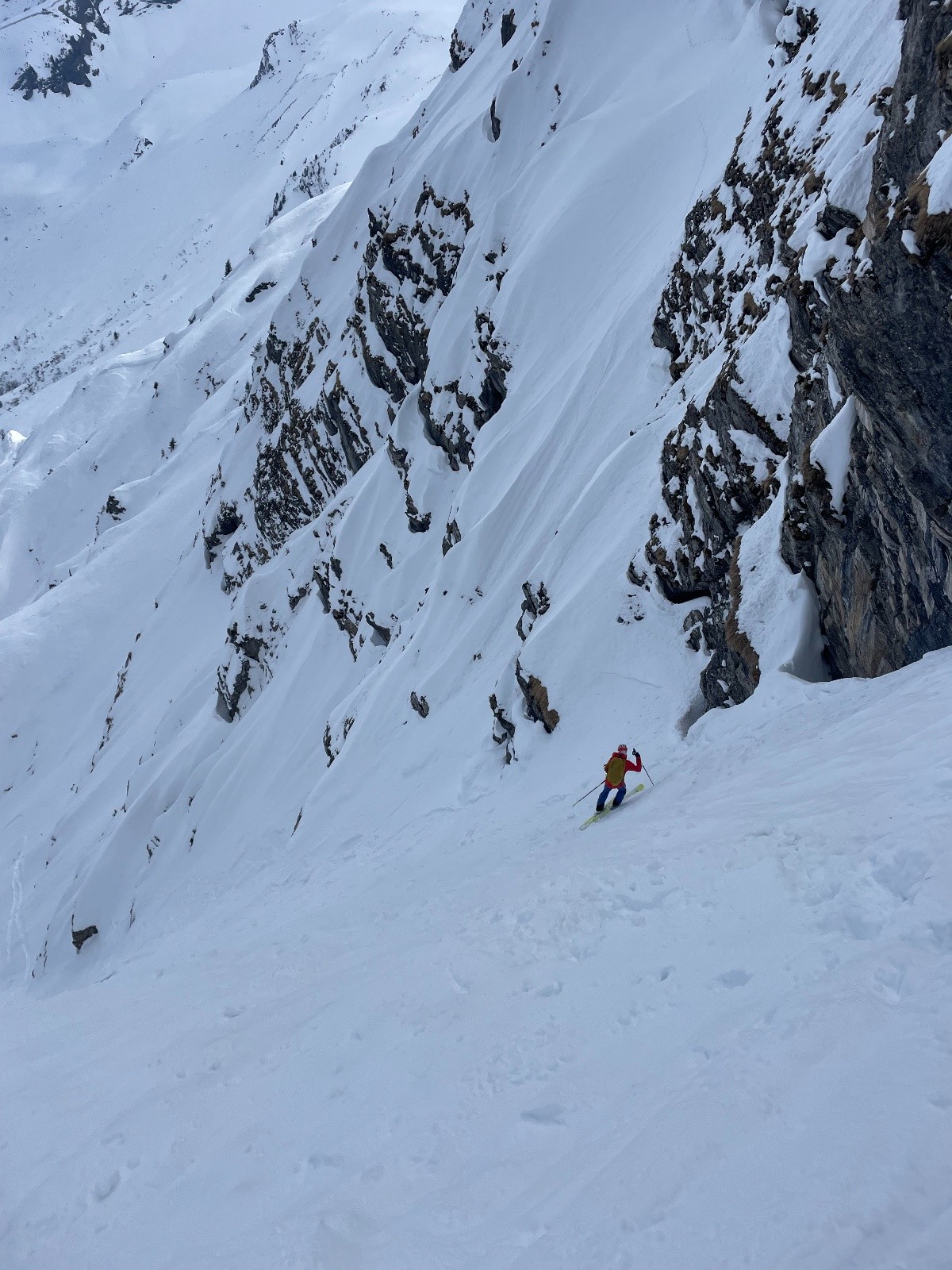 Côté nivologie, c'est un couloir qui purge facilement, mais il reste toujours un risque de se prendre sur la tête un morceau de corniche des Tranchants chauffée par le soleil.