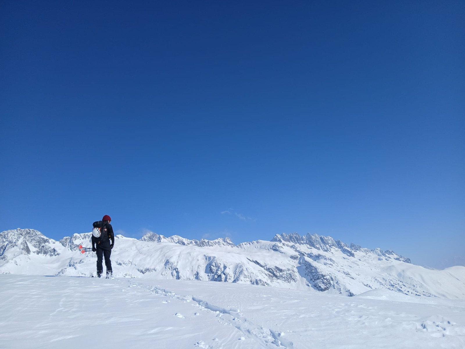 Conditions pour le ski : Moyen... Le vent a décapé des zones et créé de grosses accumulations, du coup des gros changements de neige tous les deux mètres. Sauf un endroit ! Un bon 200m~300m sous notre point le plus de Côte Belle (là où nous avons fait demi-tour) en bonne poudreuse ! Là, que du bonheur !